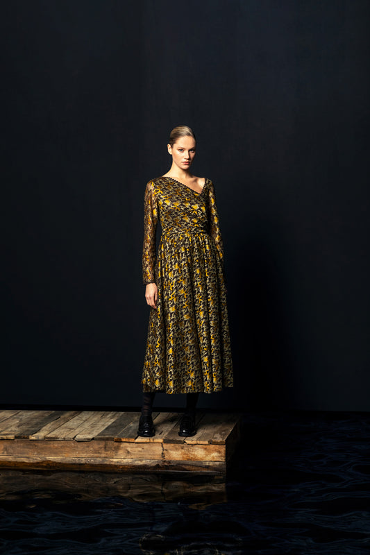فستان متوسط الطول من الكتان البيج مع تفاصيل زهور ثلاثية الأبعاد