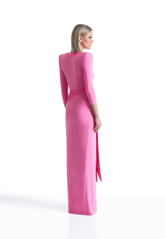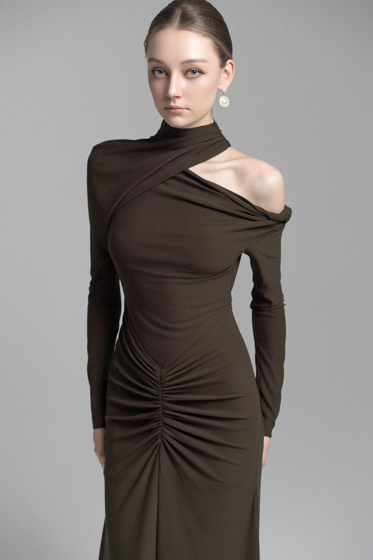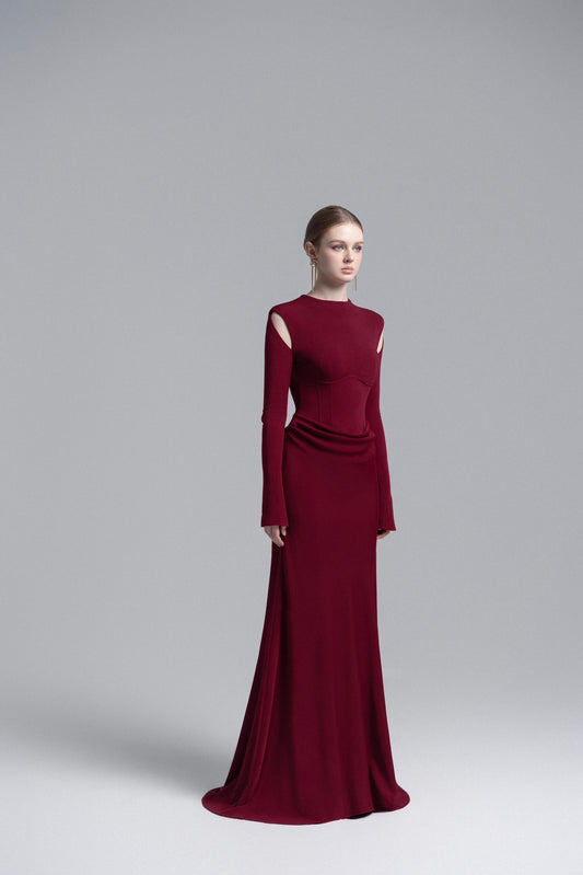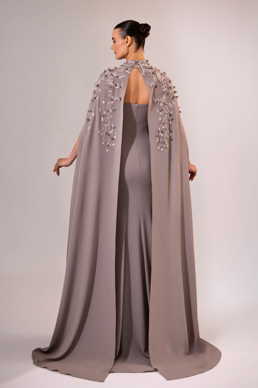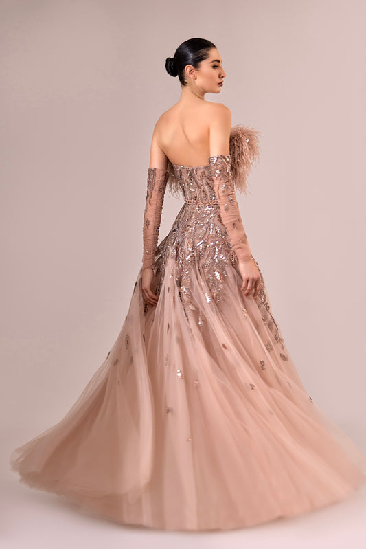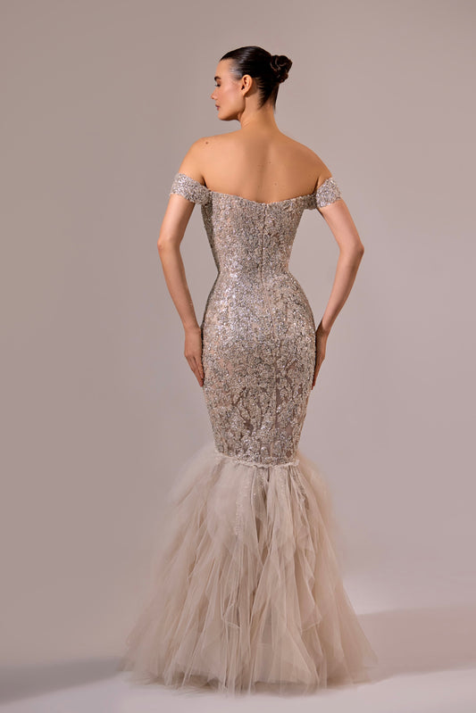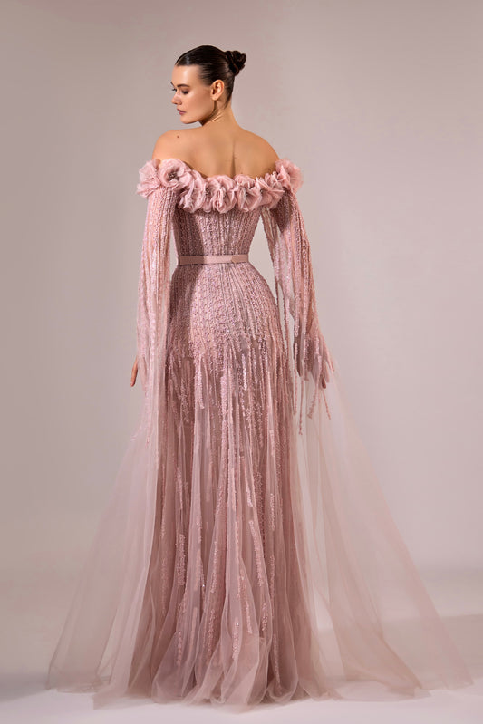 فستان أرجواني مكشوف الكتفين مزين بزخارف نباتية