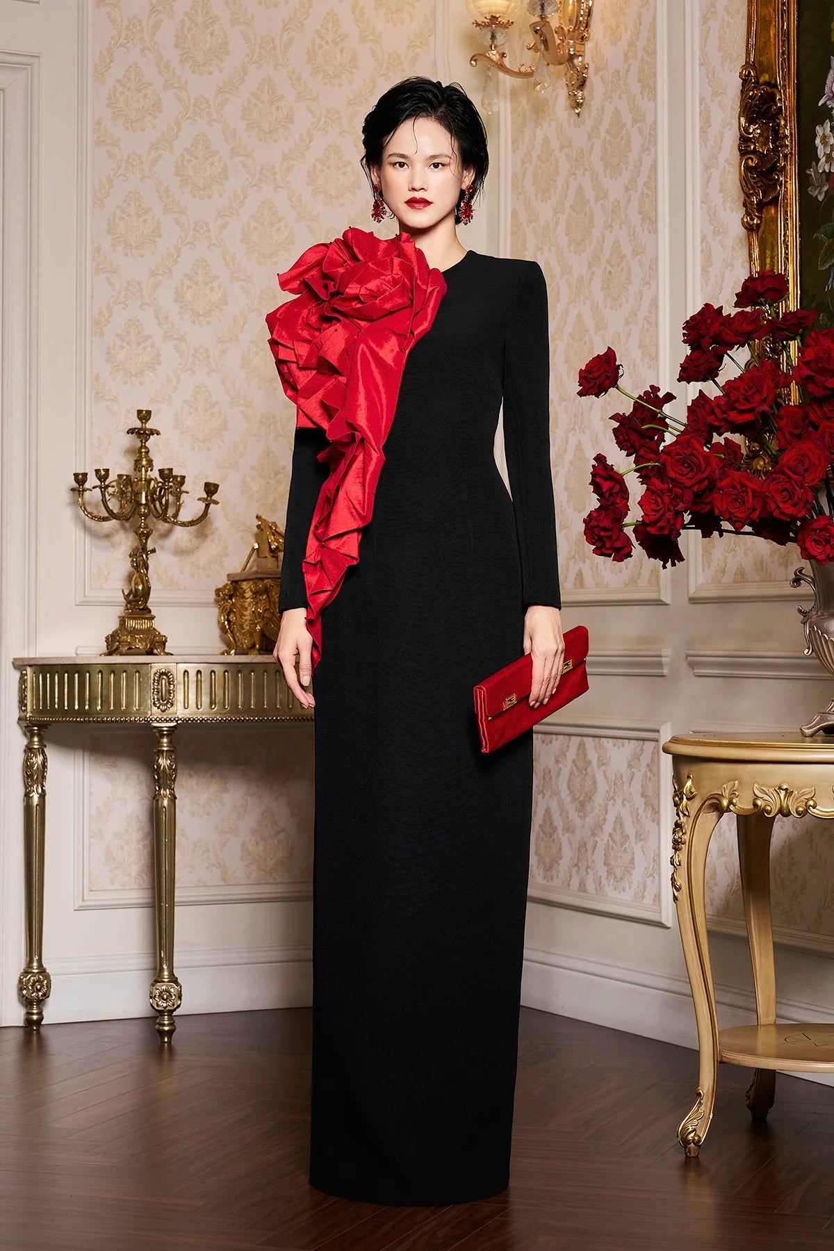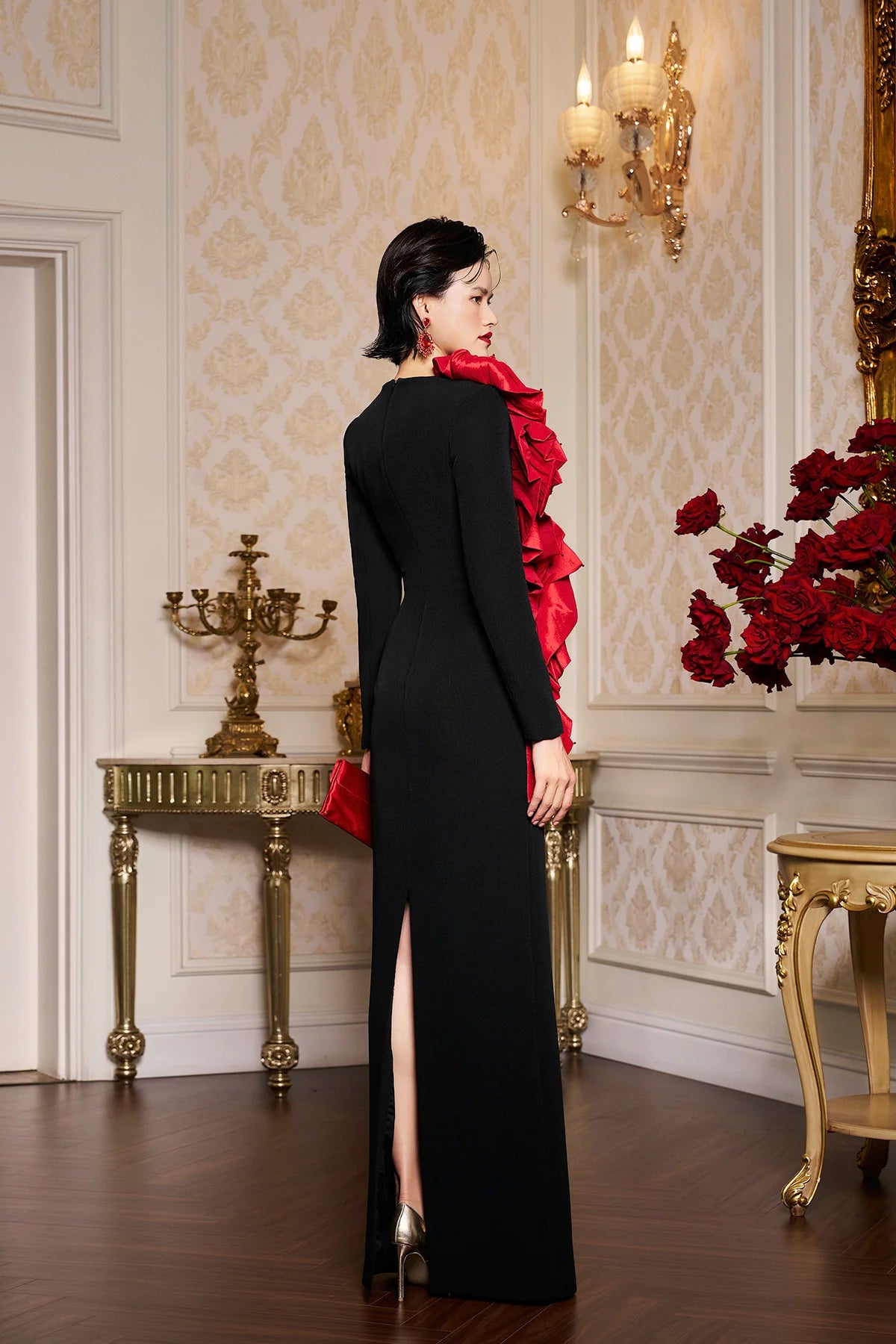 فستان سهرة بأكمام طويلة وفتحة رقبة مستديرة وجسم سكوبا مع تفاصيل من التفتا باللون الأحمر الوردي