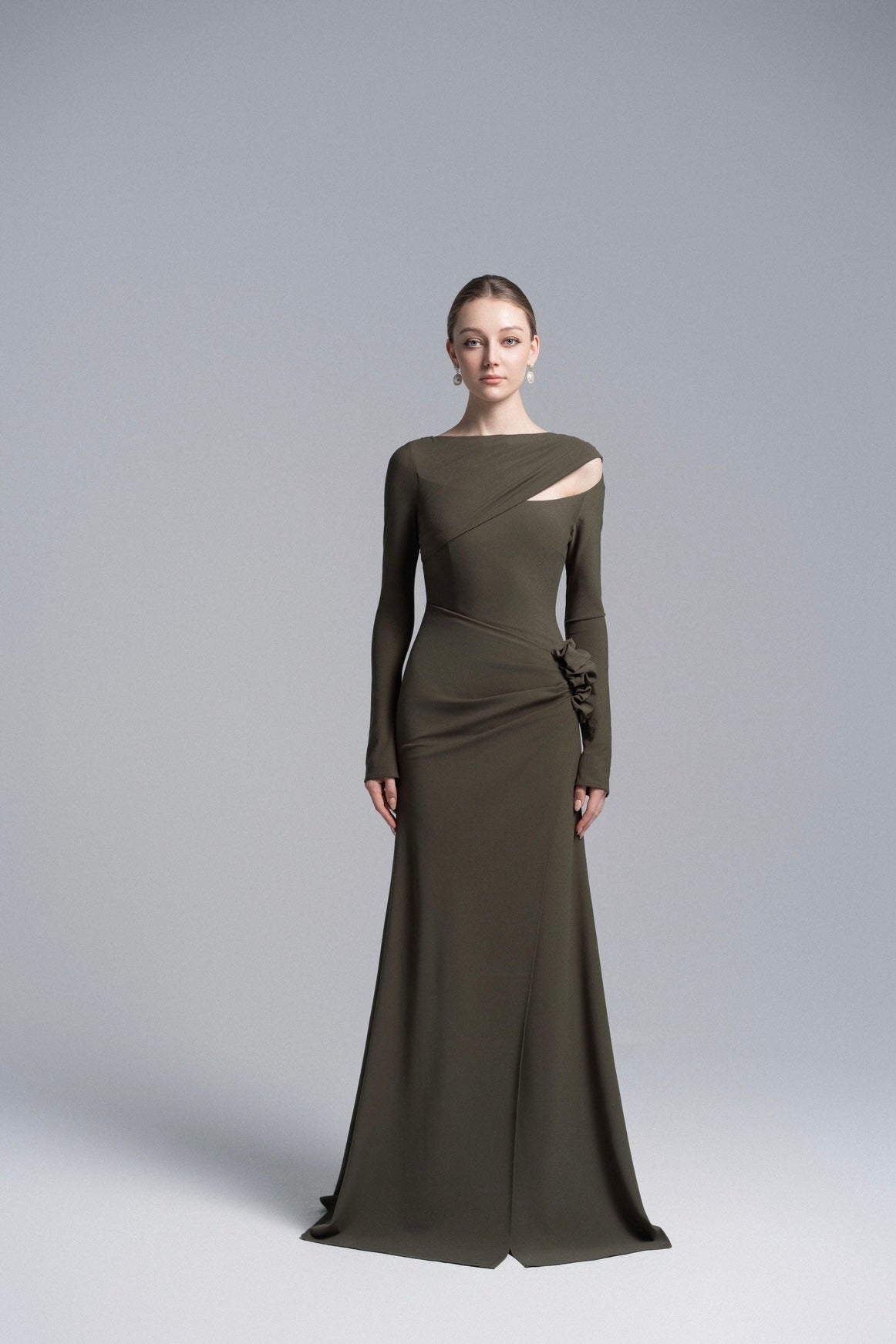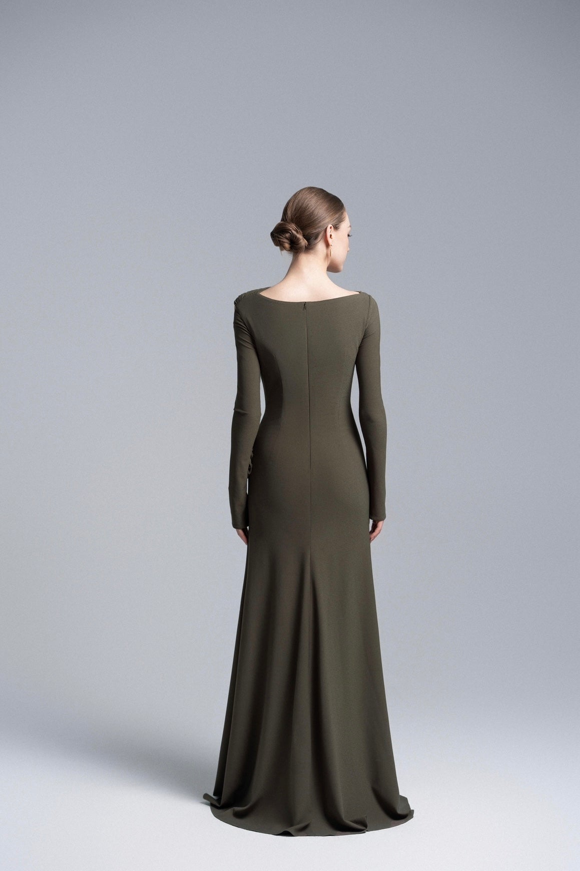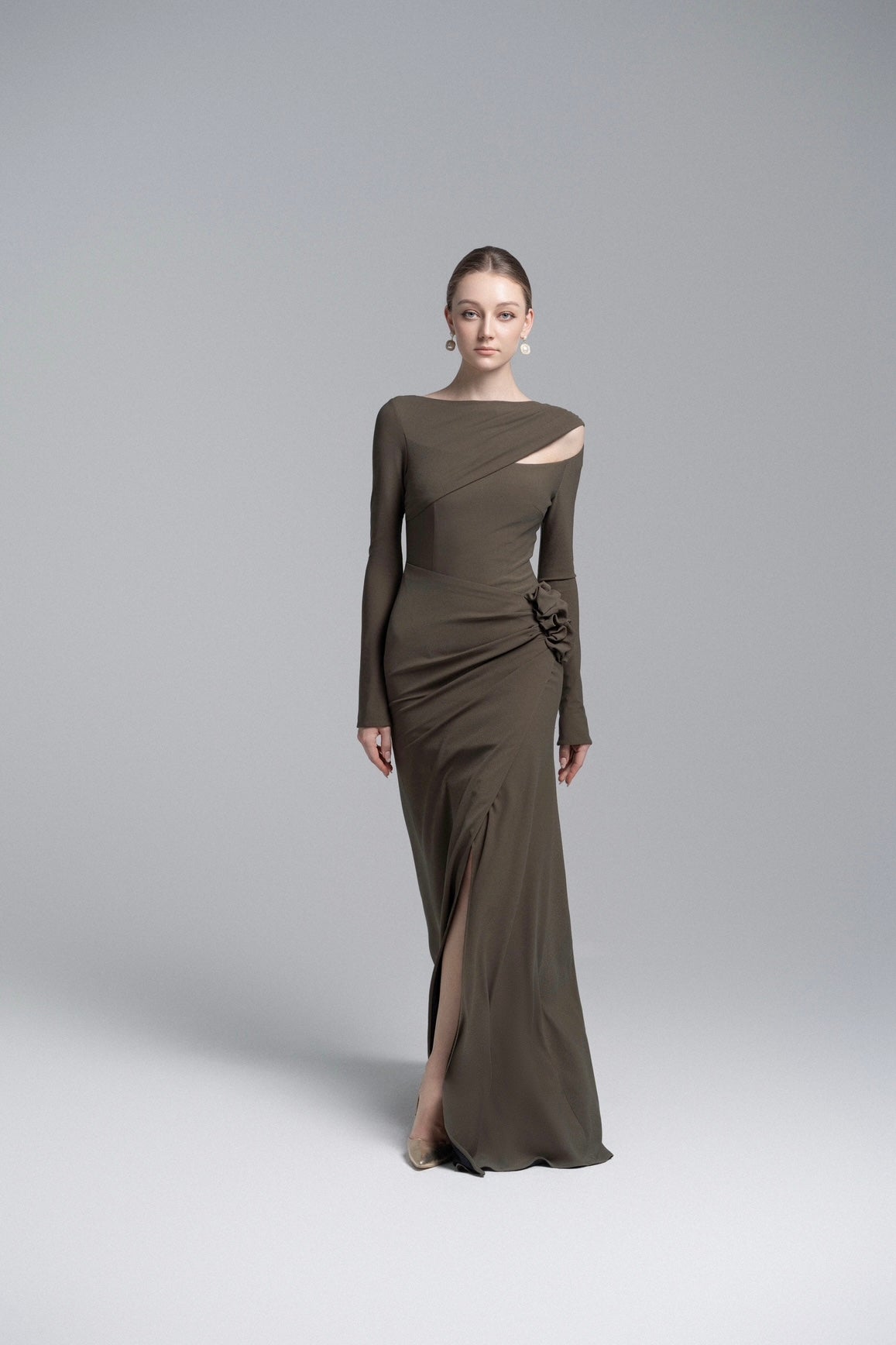 يتميز هذا الفستان العنابي الغني بتصميمه الأنيق مع فتحات جانبية لإطلالة عصرية. تضفي الأكمام الطويلة لمسة راقية، ما يجعله خيارًا متعدد الاستخدامات للمناسبات الرسمية وشبه الرسمية.