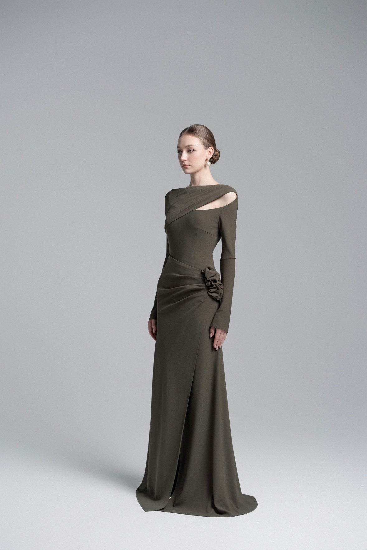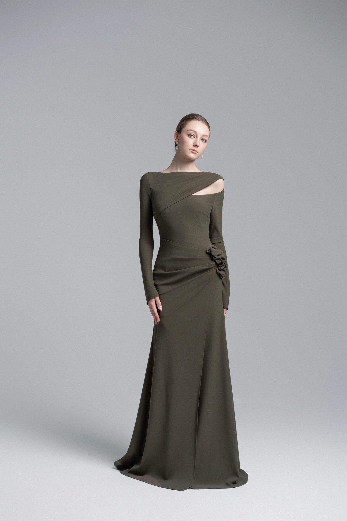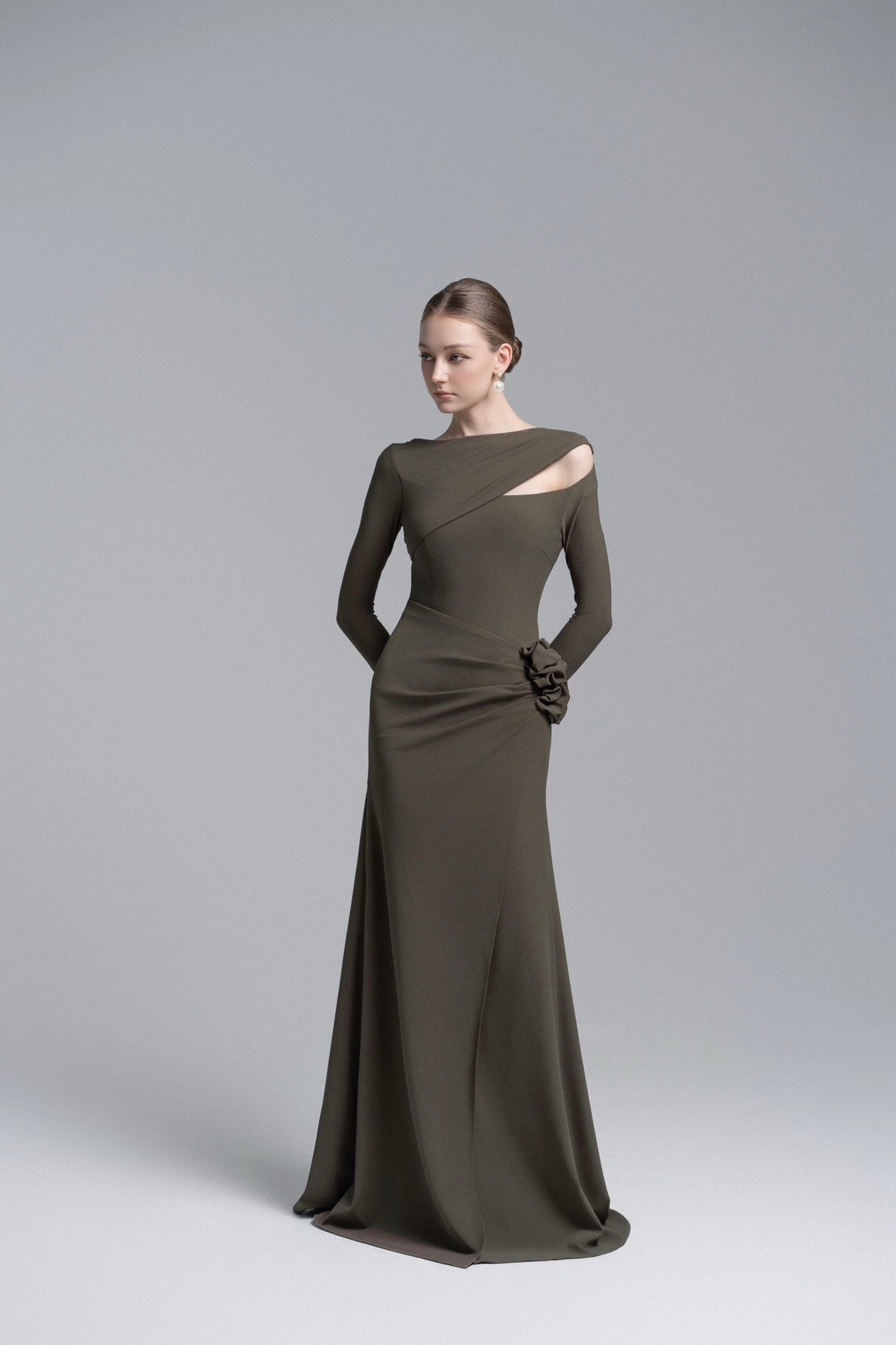 يتميز هذا الفستان العنابي الغني بتصميمه الأنيق مع فتحات جانبية لإطلالة عصرية. تضفي الأكمام الطويلة لمسة راقية، ما يجعله خيارًا متعدد الاستخدامات للمناسبات الرسمية وشبه الرسمية.