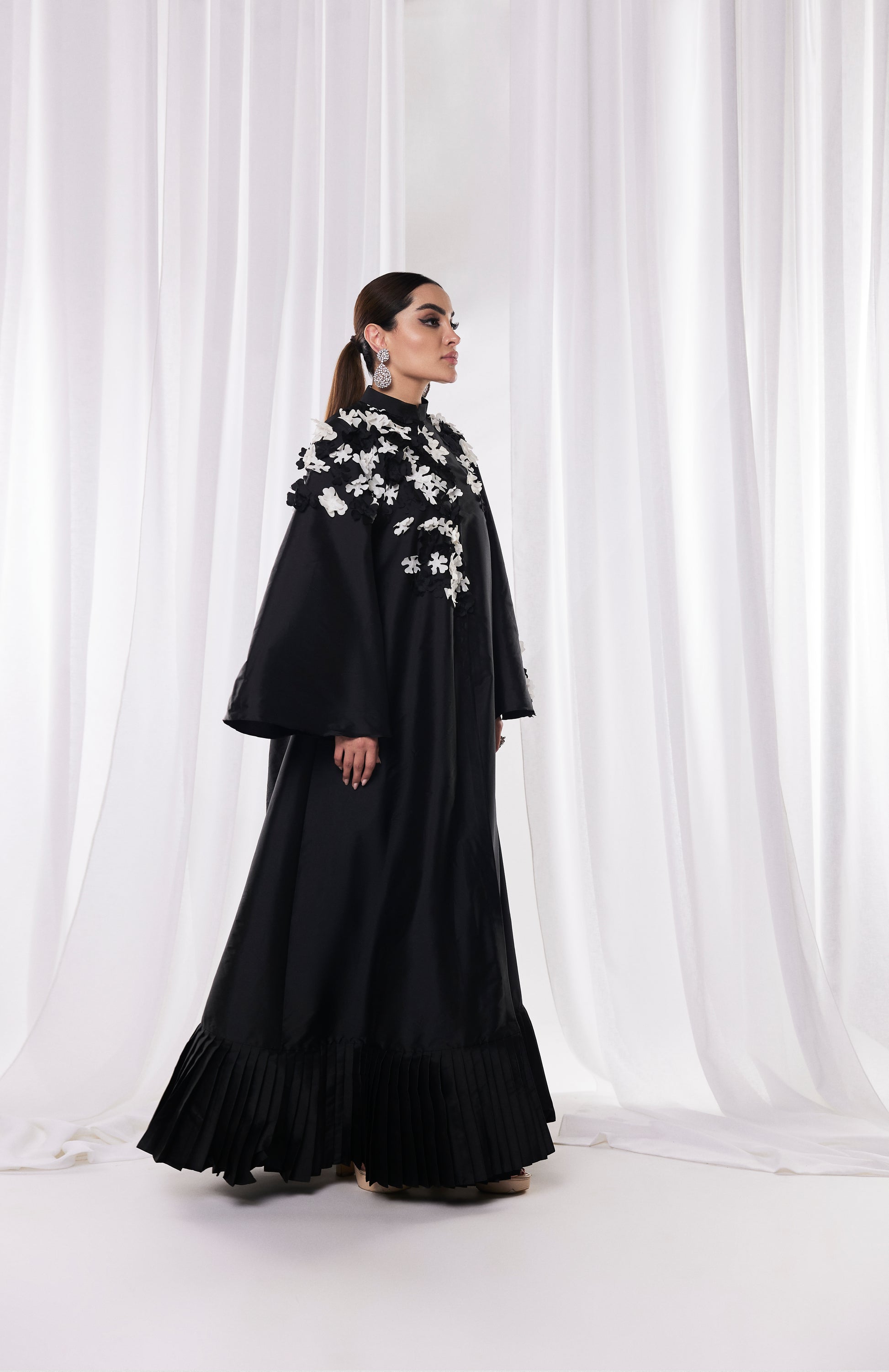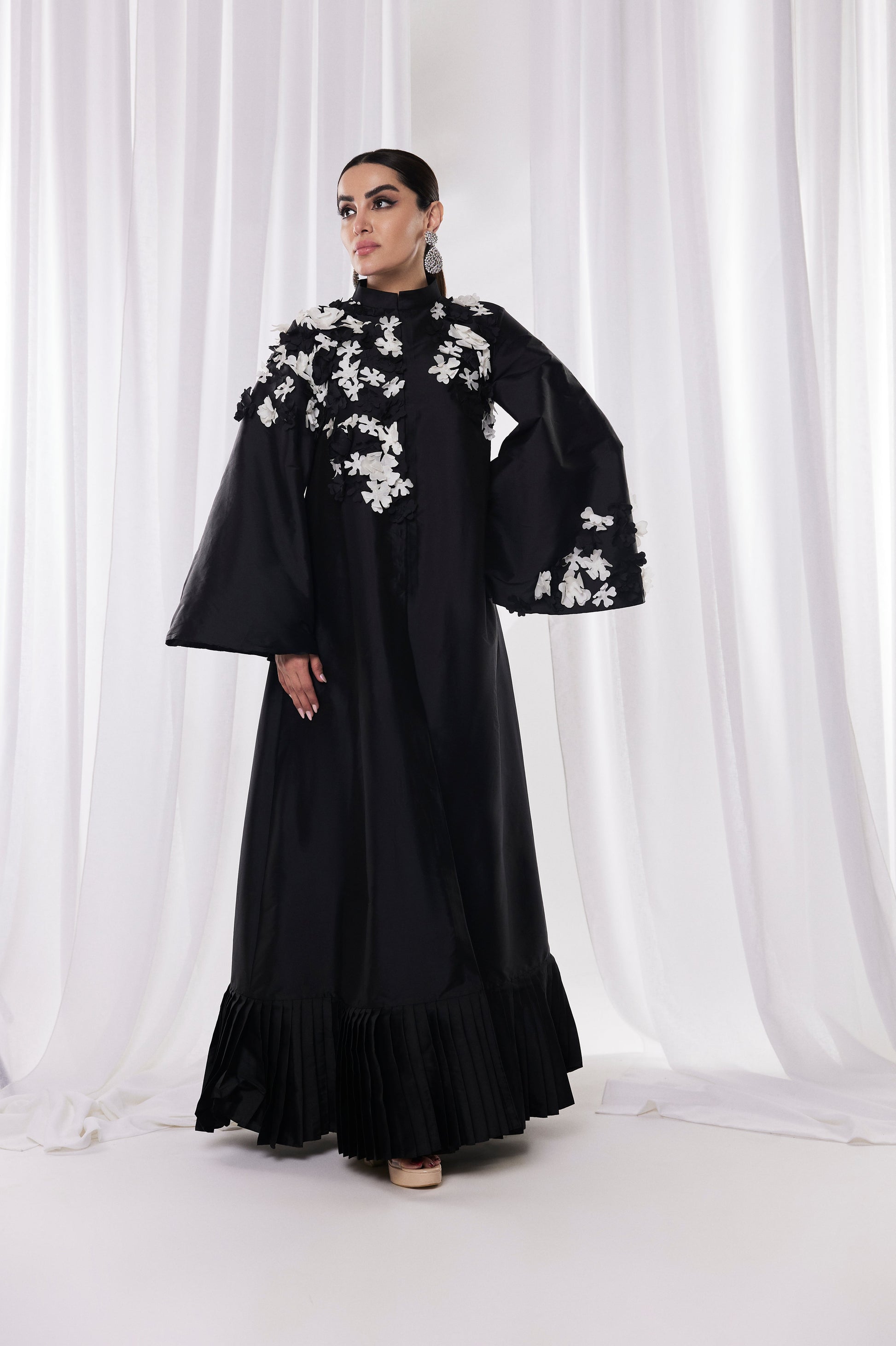 يتميز هذا الفستان الأسود الأنيق بتطريز زهور مذهل يضفي لمسة من الرقي والأناقة. بفضل رقبته العالية وأكمامه الجريئة، يجمع الفستان بين التصميم العصري والعناصر الكلاسيكية. يعزز خط الحافة المطوي من شكله المتدفق، مما يجعله خيارًا مثاليًا للمناسبات الرسمية. مثالي لإضفاء لمسة أنيقة، يمزج هذا الفستان بشكل جميل بين الراحة والأناقة.