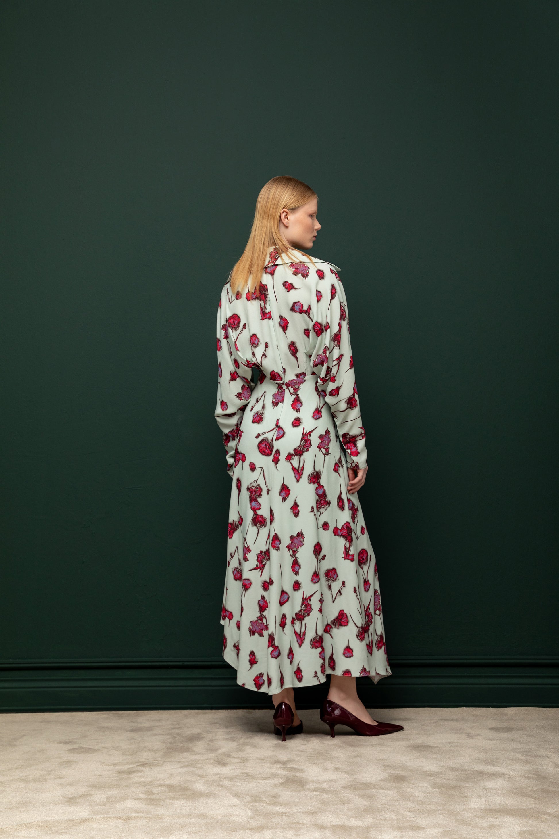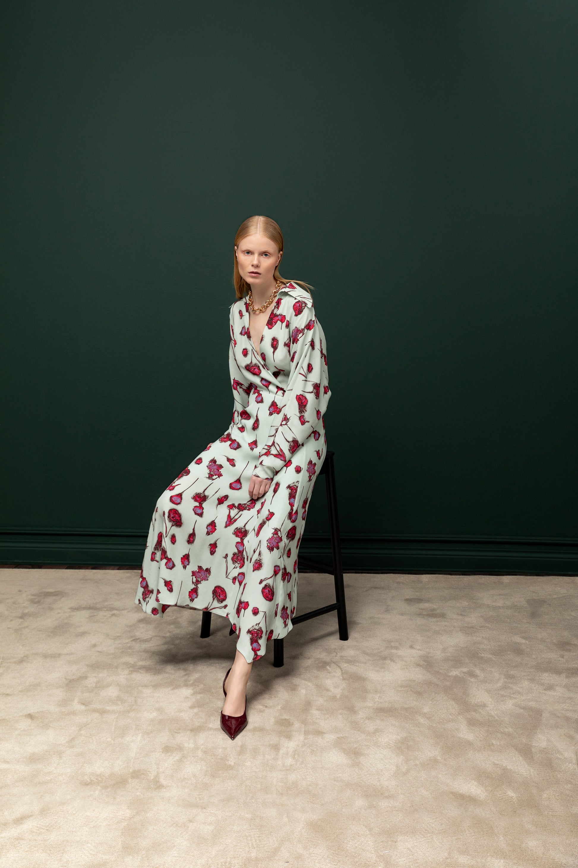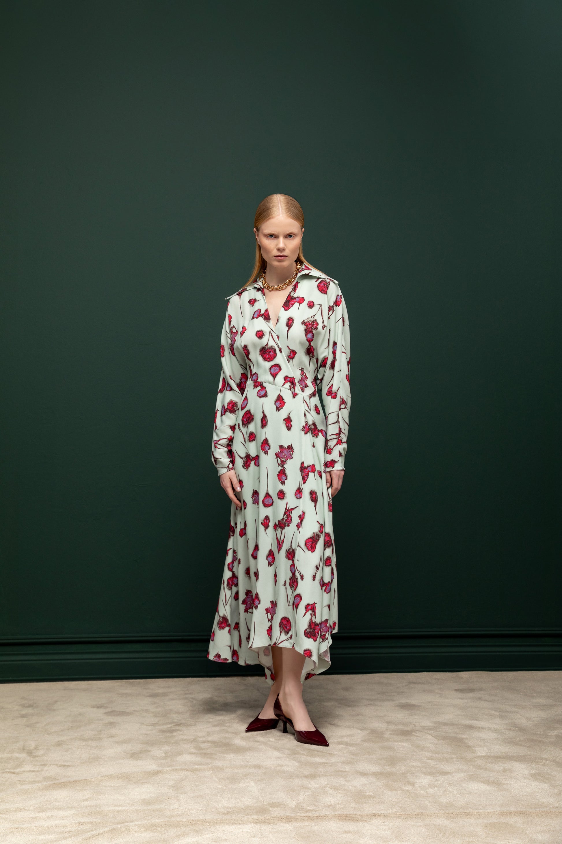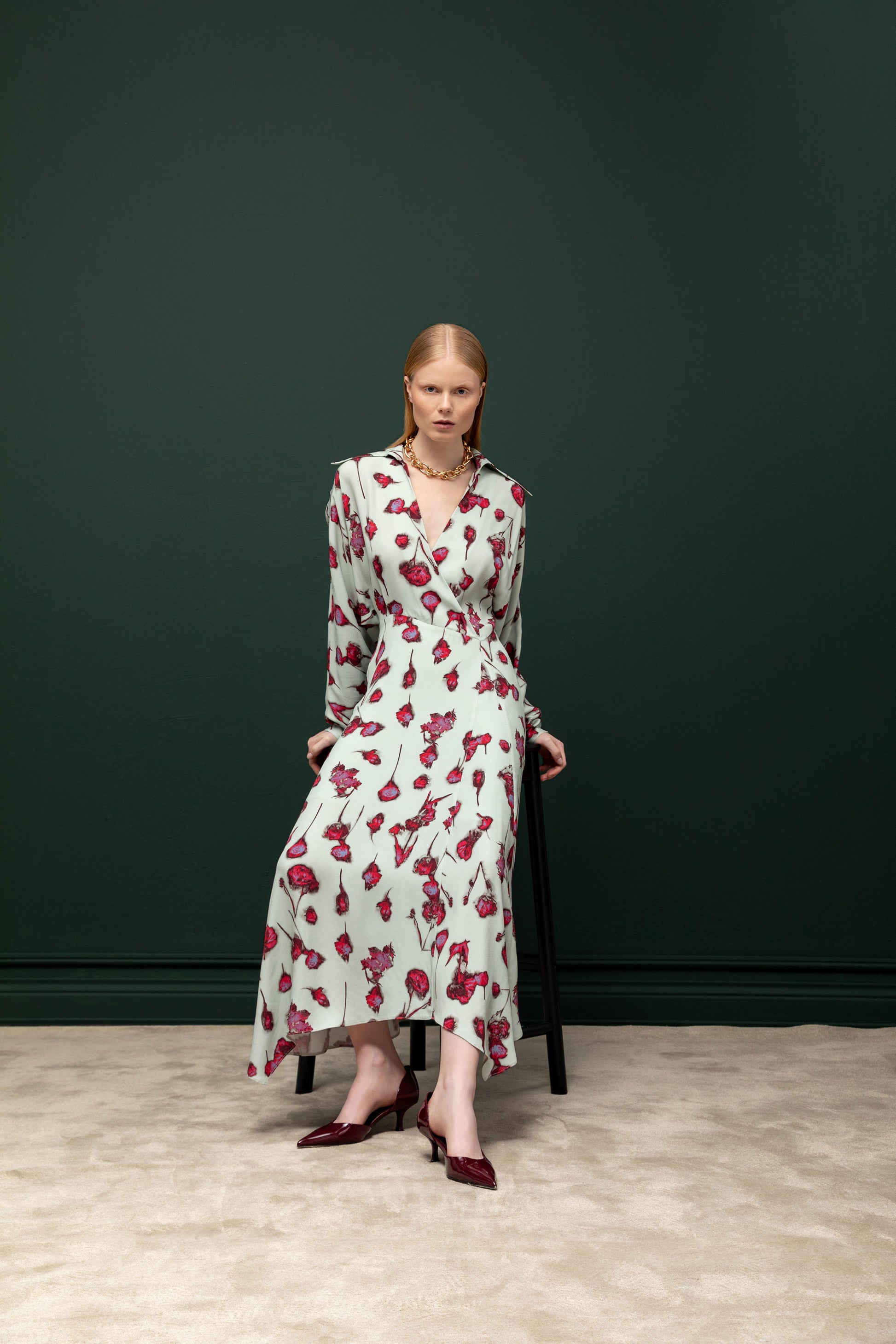 يتميز هذا الفستان الأنيق الملفوف بطبعة زهور رقيقة بدرجات ناعمة من الوردي والأحمر على خلفية خضراء نعناعية هادئة. مع رقبة على شكل حرف V أنيقة وأكمام طويلة، يُضفي عليه مظهرًا أنيقًا مثاليًا لأي مناسبة. يُضفي طوله المتوسط لمسة من الرقي، بينما يُبرز تصميم اللف الخصر لإضفاء لمسة أنثوية. أكملي إطلالتك بحذاء أنيق بكعب عالٍ لإطلالة أنيقة تُناسب جميع المناسبات.