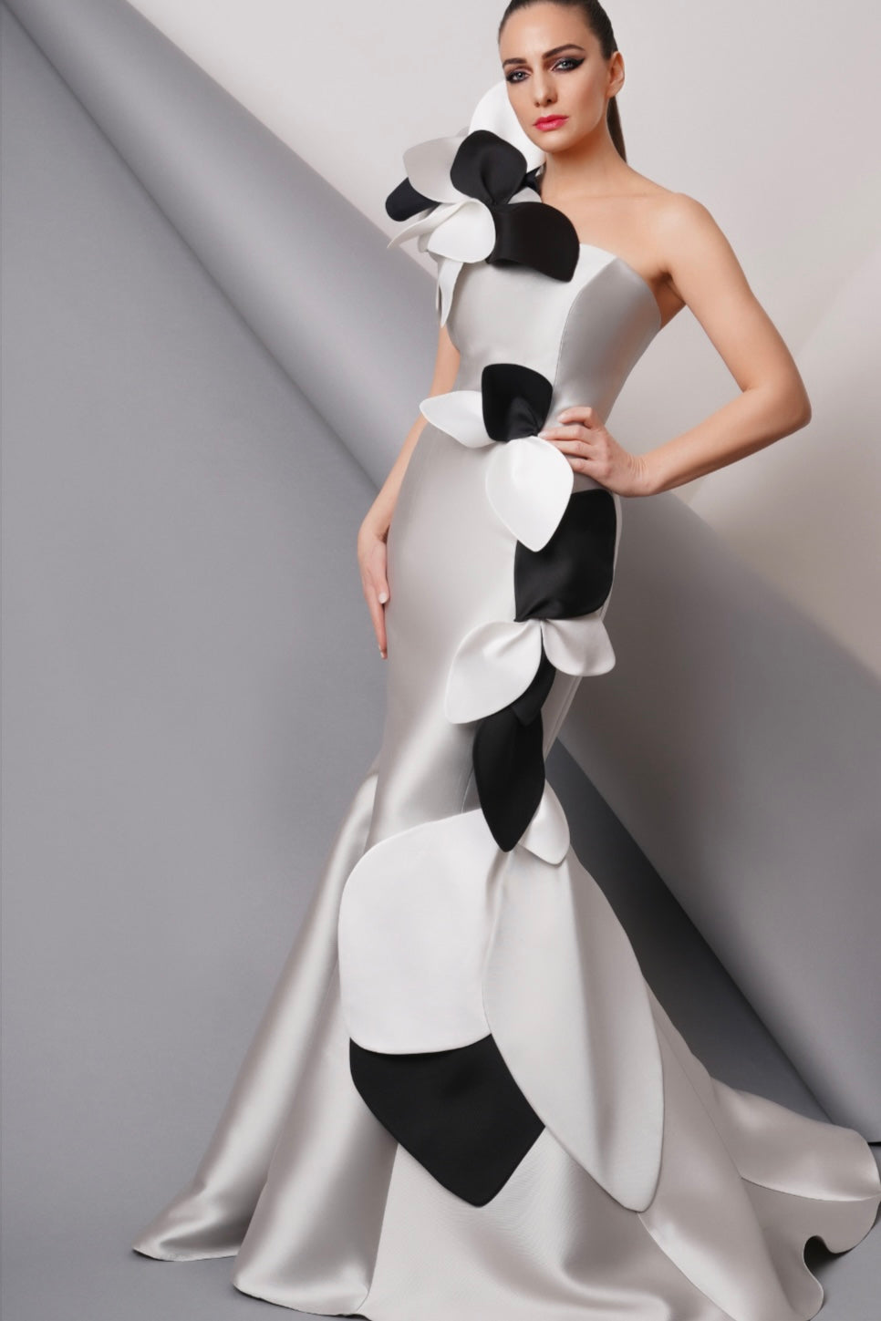يتميز هذا الفستان المذهل بتصميم أنيق ومناسب مع زخارف زهرية جريئة باللونين الأسود والأبيض، مما يخلق مظهرًا عصريًا ومذهلًا. يضيف التصميم ذو الكتف الواحد لمسة أنيقة، مما يجعله مثاليًا للمناسبات الرسمية والمناسبات الخاصة.