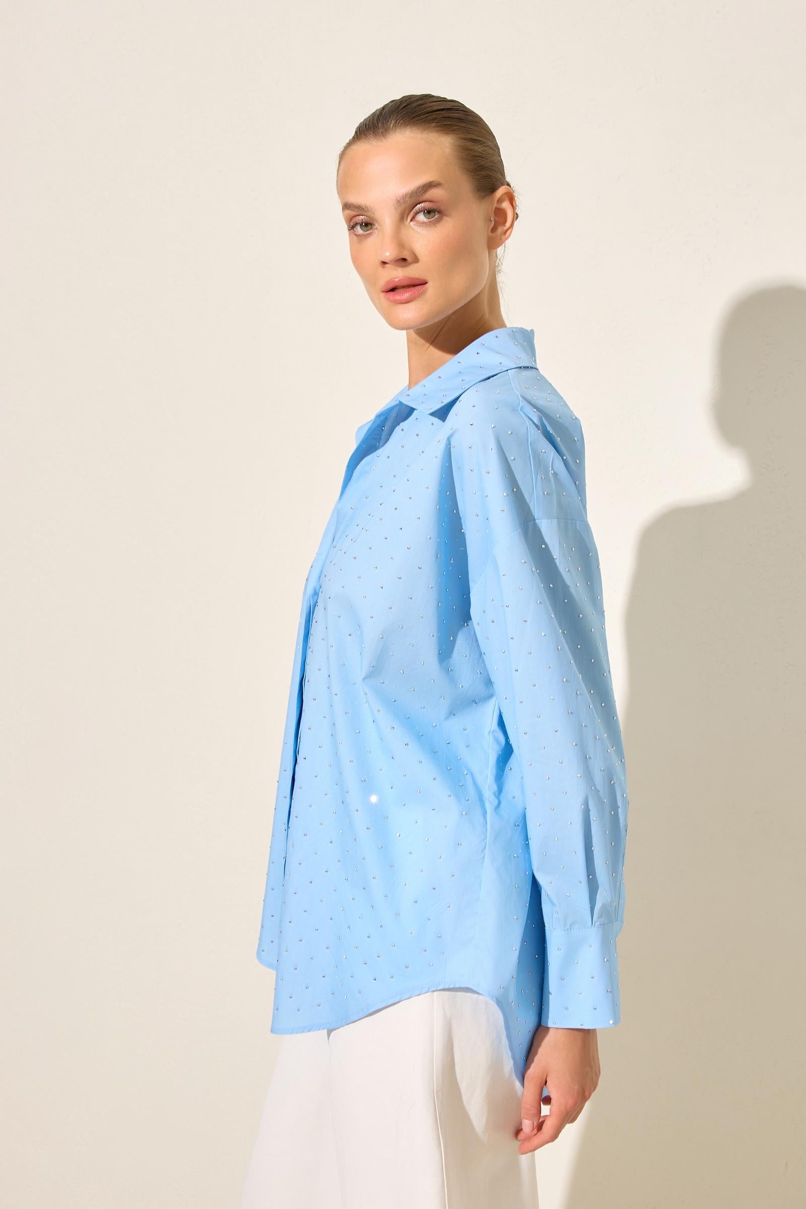 عززي خزانة ملابسك بهذه البلوزة الزرقاء السماوية الأنيقة والواسعة، والمزينة بلمسات كريستالية رقيقة لإضفاء لمسة من التألق. مصنوعة من قماش خفيف الوزن، تتميز بقصّة مريحة وأكتاف منسدلة وياقة كلاسيكية، مثالية لإطلالة رسمية أنيقة أو كاجوال. نسقيها مع بنطال جينز أو بنطال جينز لإطلالة عصرية ومنعشة.