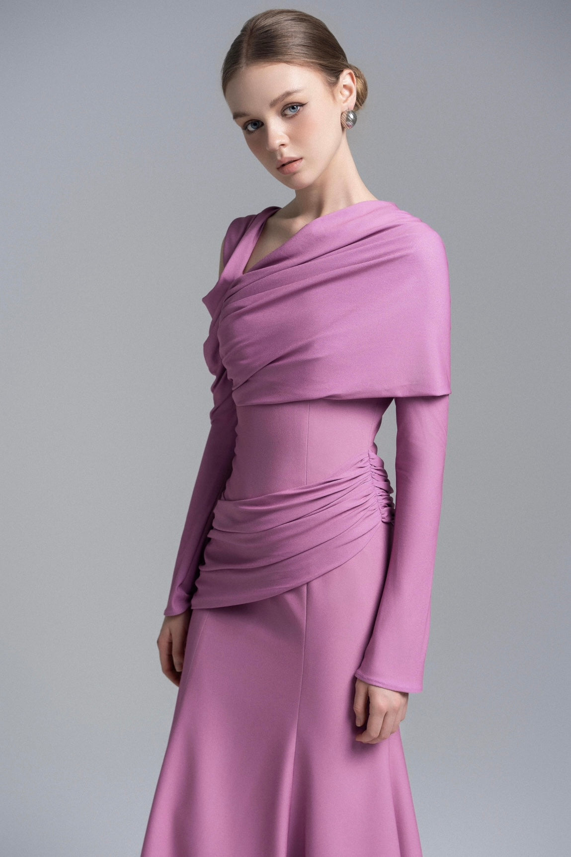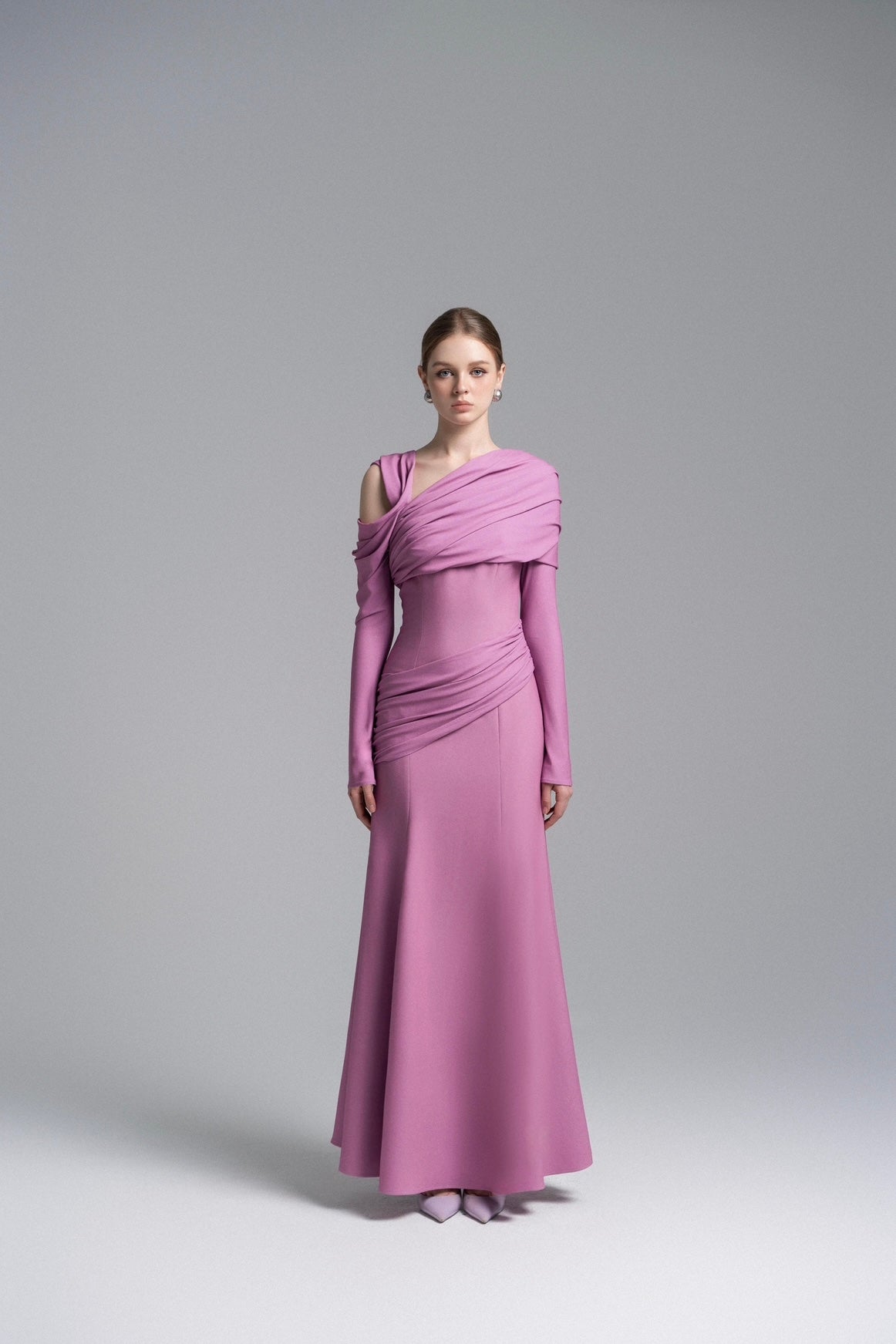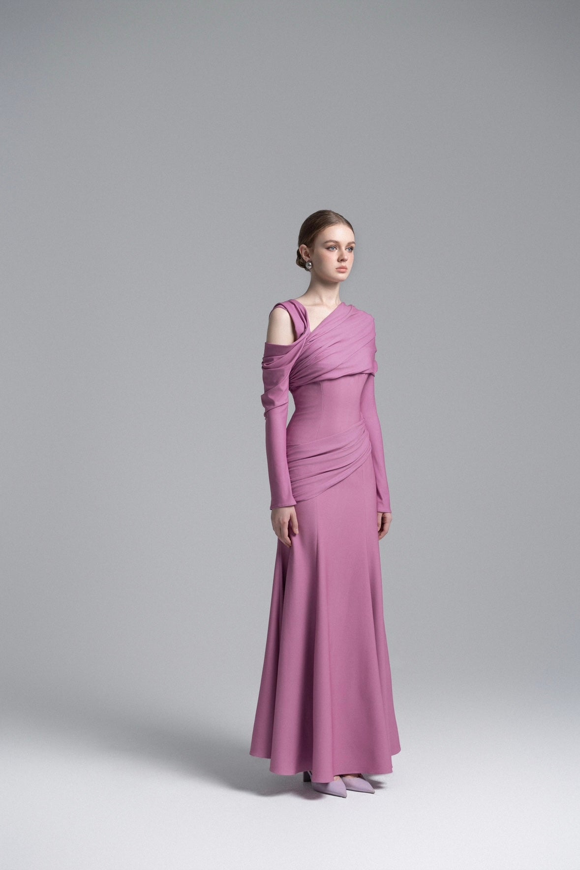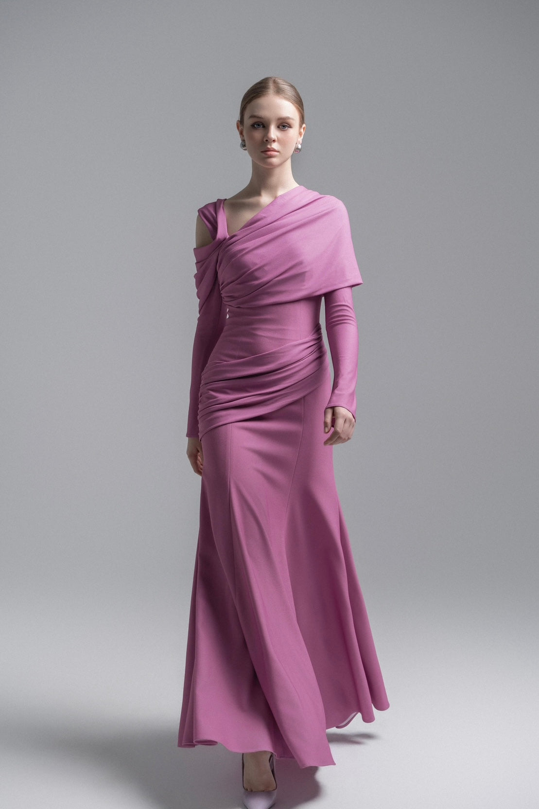 يتميز هذا الفستان الرائع بلون وردي فاتح ناعم مع صدرية منسدلة تُبرز الكتفين بأناقة. تُضفي التفاصيل المُجعّدة لمسةً أنيقةً على القوام، وتنساب بسلاسة لتشكّل تنورةً طويلة. مثالي للمناسبات الرسمية، إذ يُجسّد الأناقة والرقي.