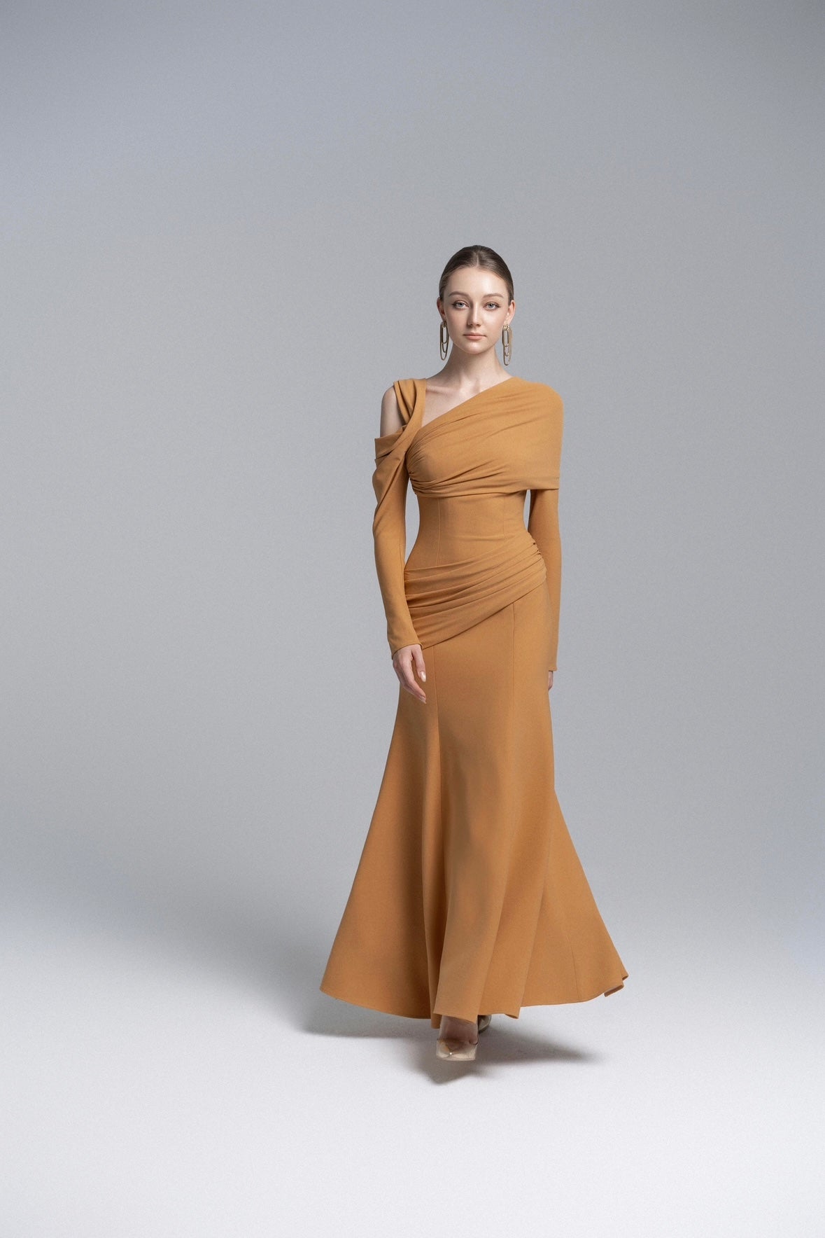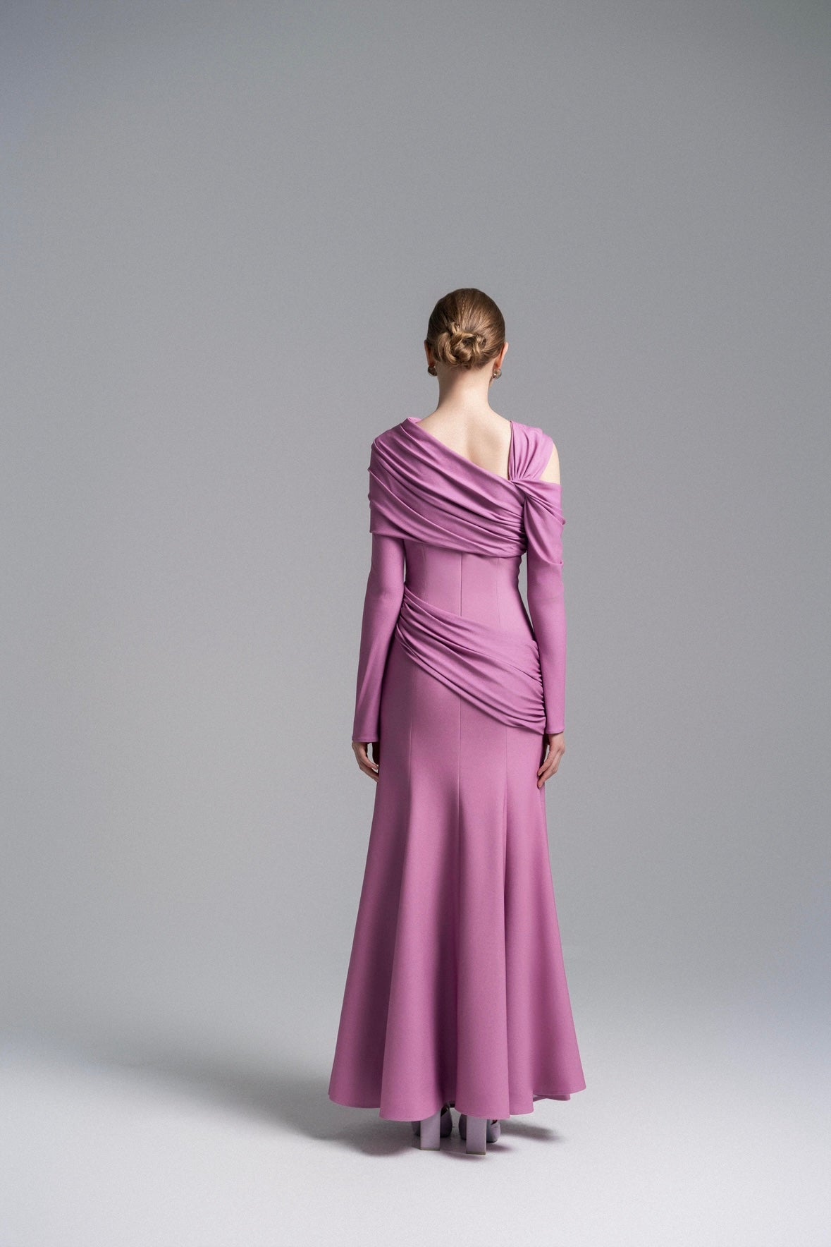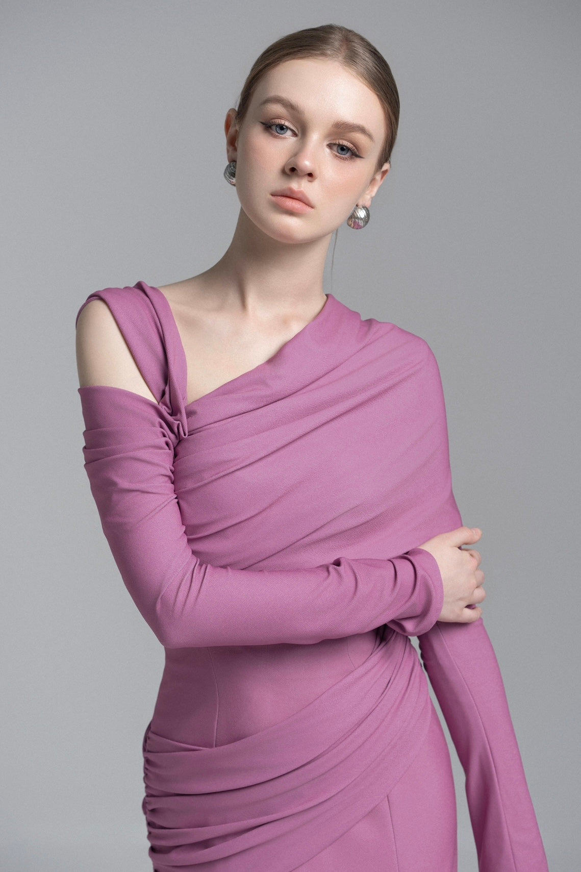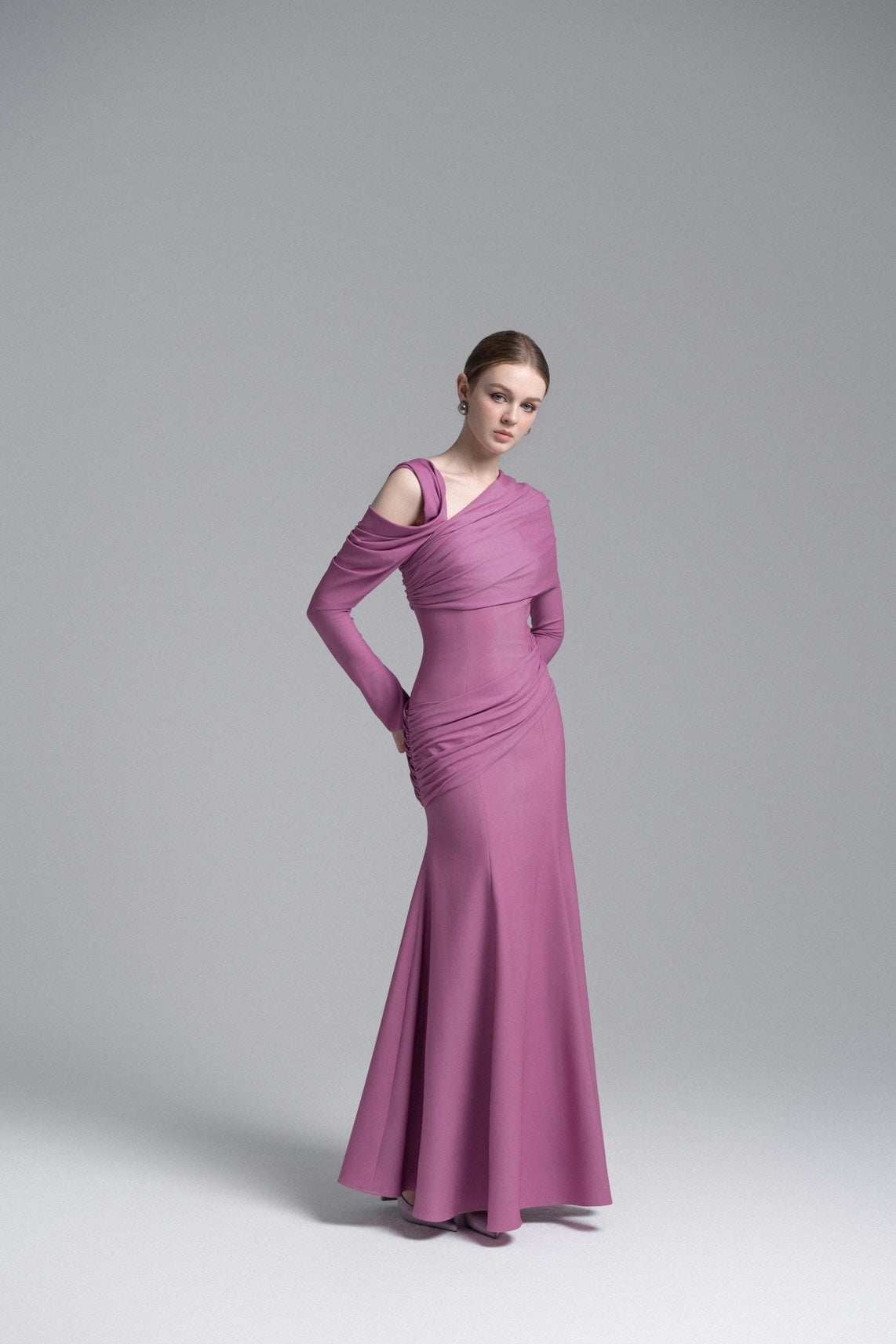 يتميز هذا الفستان الرائع بلون وردي فاتح ناعم مع صدرية منسدلة تُبرز الكتفين بأناقة. تُضفي التفاصيل المُجعّدة لمسةً أنيقةً على القوام، وتنساب بسلاسة لتشكّل تنورةً طويلة. مثالي للمناسبات الرسمية، إذ يُجسّد الأناقة والرقي.