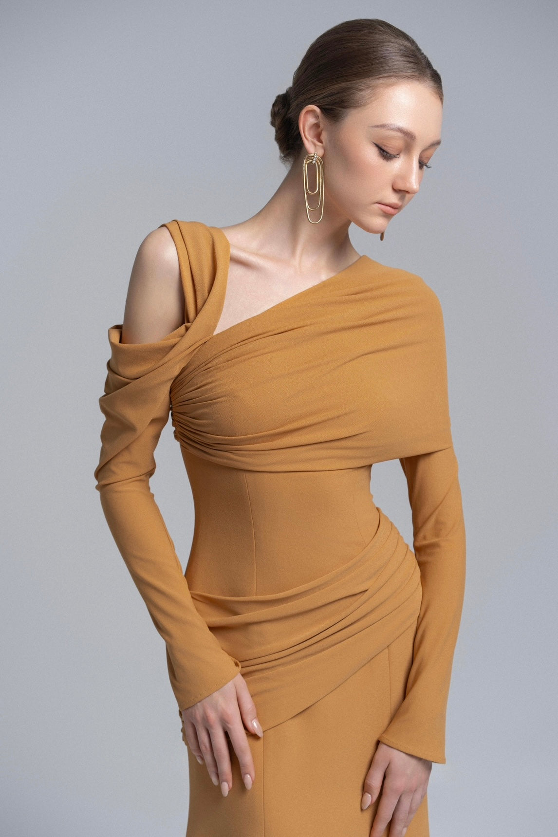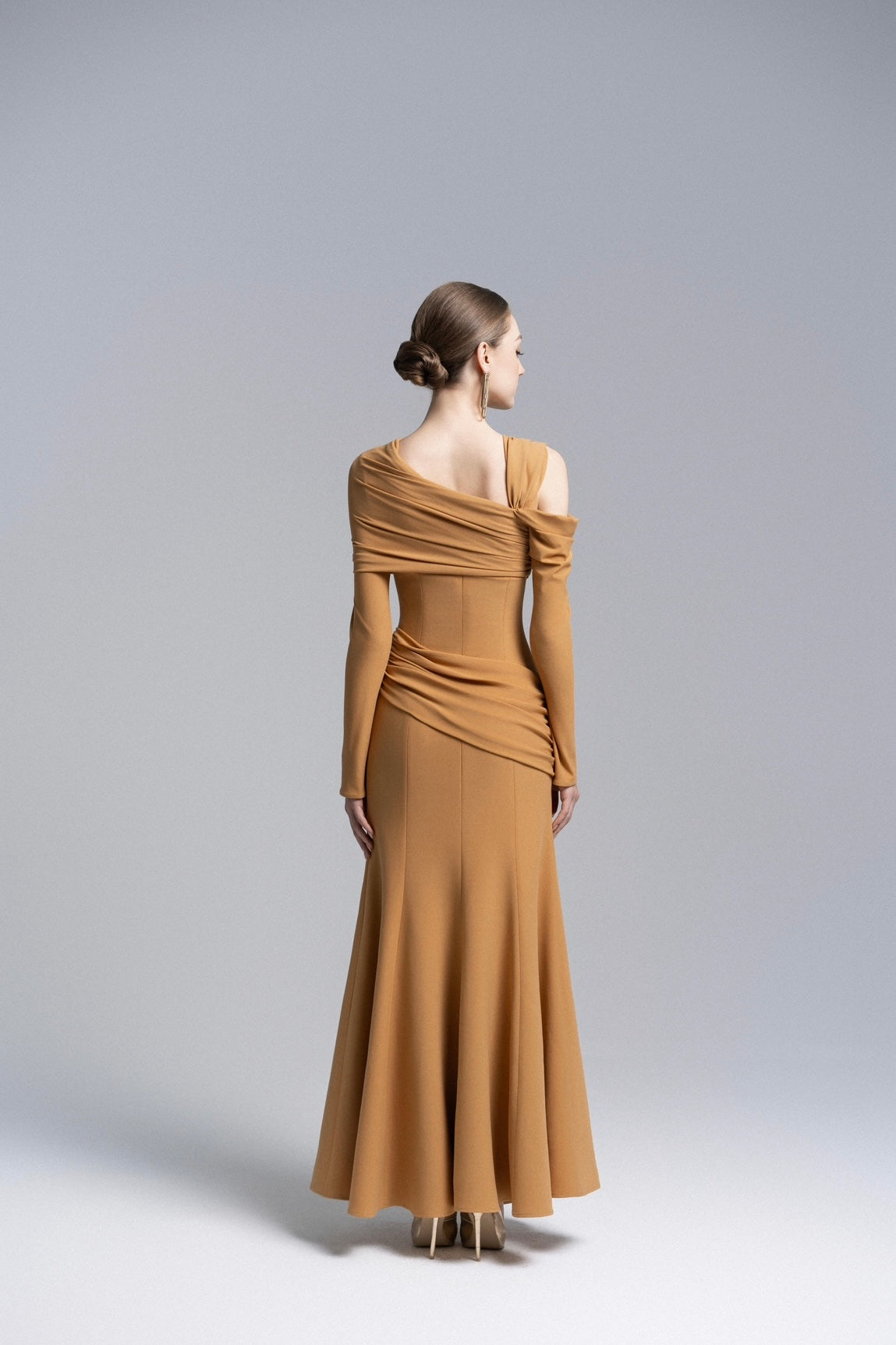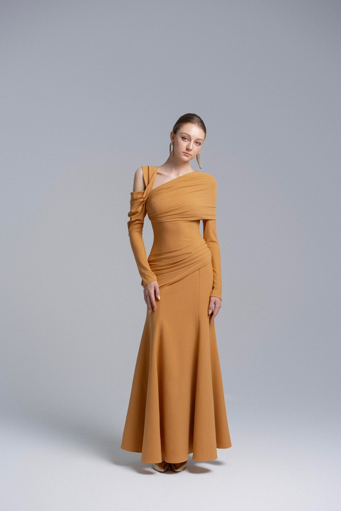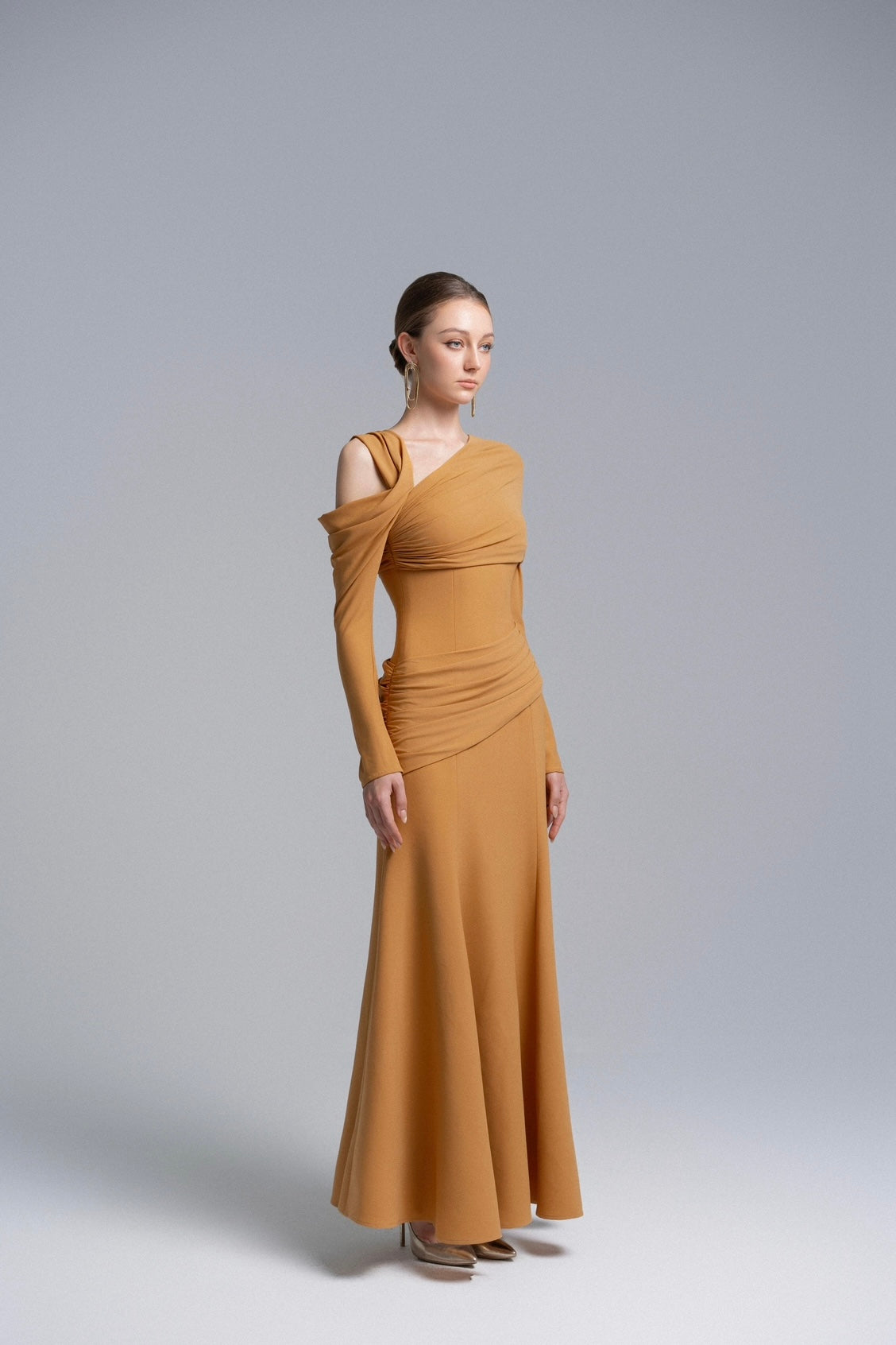 يتميز هذا الفستان الرائع بلون وردي فاتح ناعم مع صدرية منسدلة تُبرز الكتفين بأناقة. تُضفي التفاصيل المُجعّدة لمسةً أنيقةً على القوام، وتنساب بسلاسة لتشكّل تنورةً طويلة. مثالي للمناسبات الرسمية، إذ يُجسّد الأناقة والرقي.