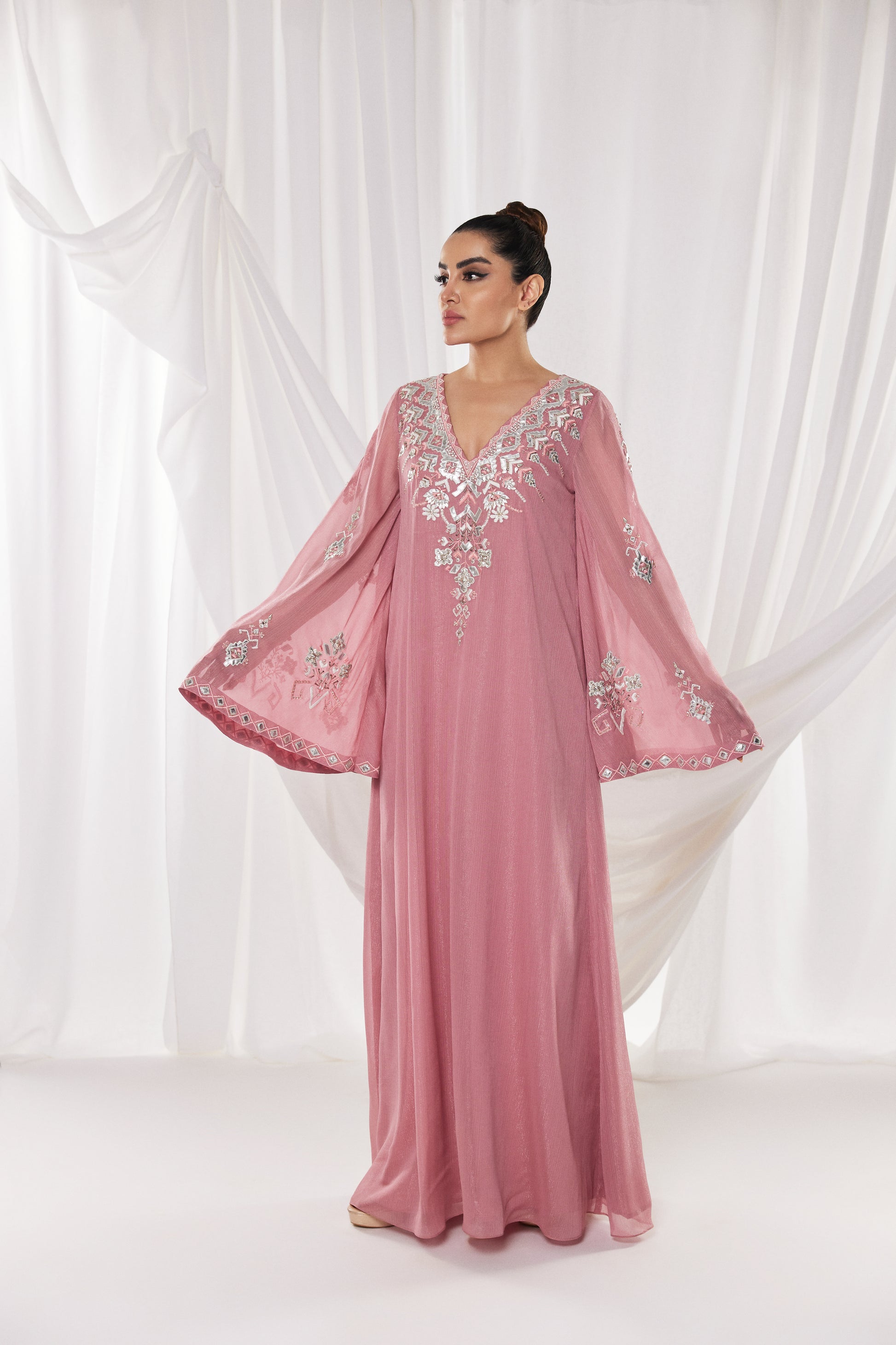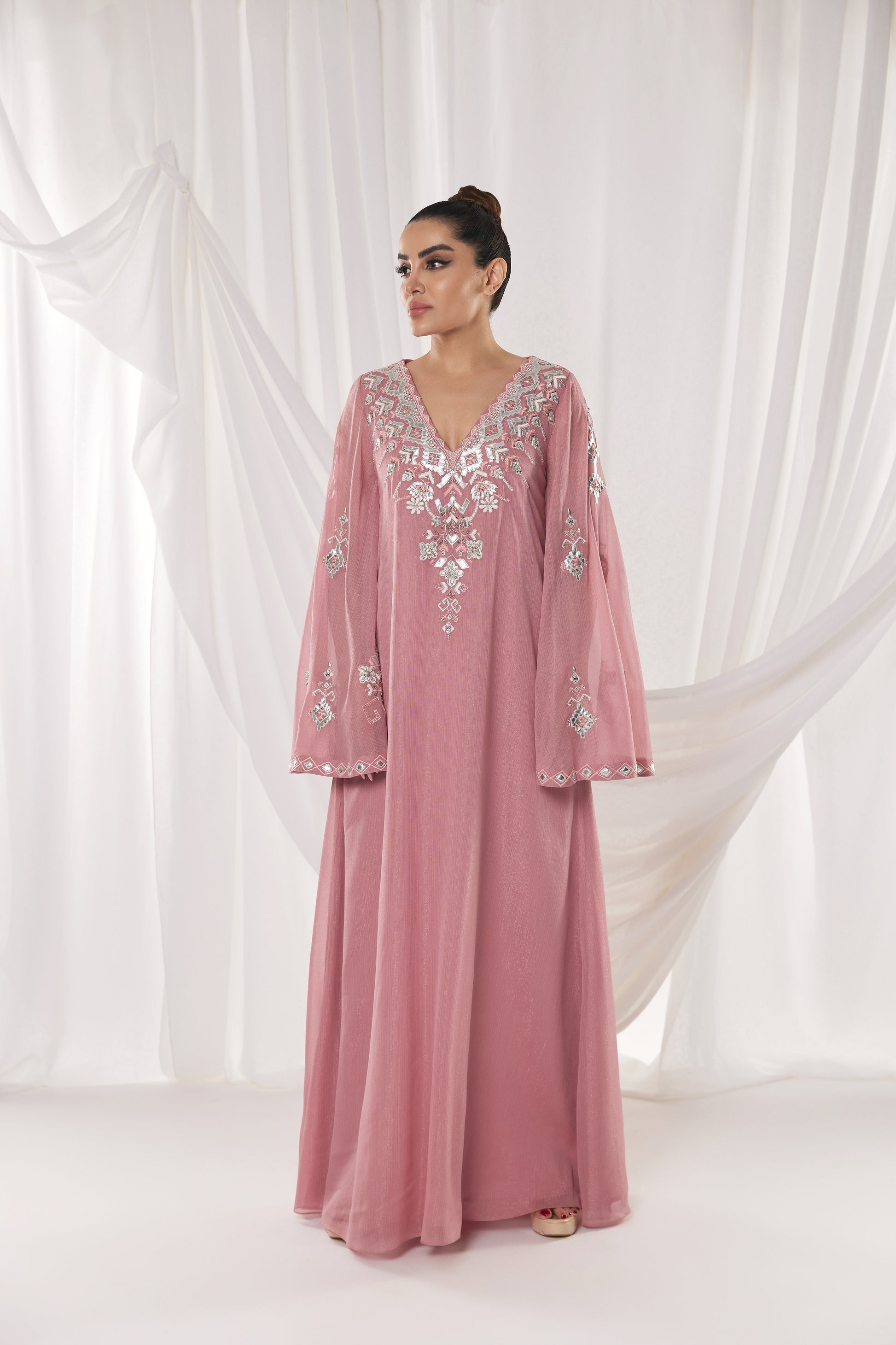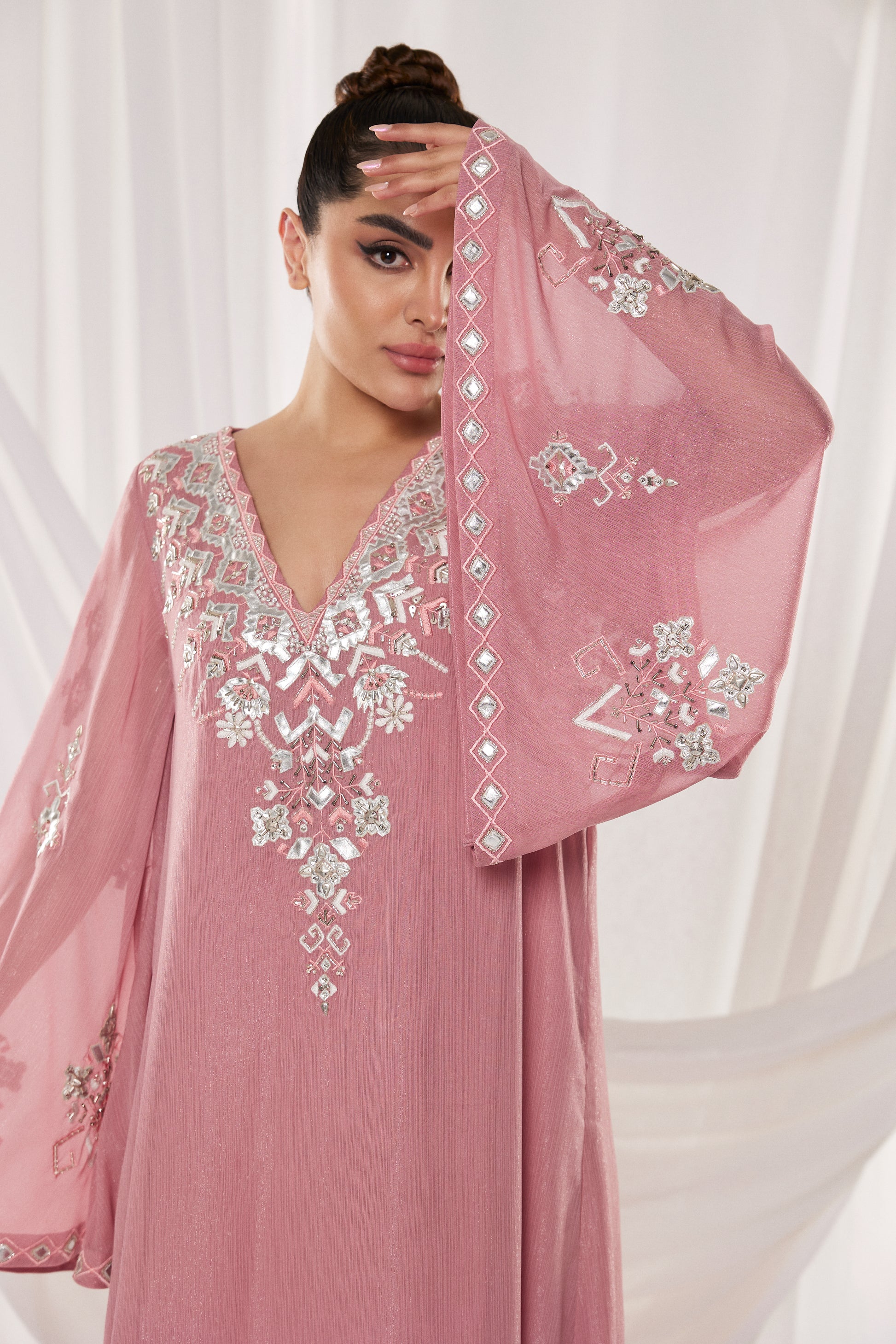 يتميز هذا الفستان الوردي المذهل بقصته المنسدلة التي تنضح بالرشاقة والرقي. كما يضفي التطريز المعقد على طول خط العنق والأكمام الواسعة لمسة من التألق، مما يجعله مثاليًا للمناسبات الخاصة أو المناسبات المسائية. يضمن القماش خفيف الوزن الراحة، بينما يعزز اللون الغني أناقته الخالدة. مثالي لأولئك الذين يقدرون الأناقة والتراث الثقافي، هذا الفستان إضافة جميلة لأي خزانة ملابس.