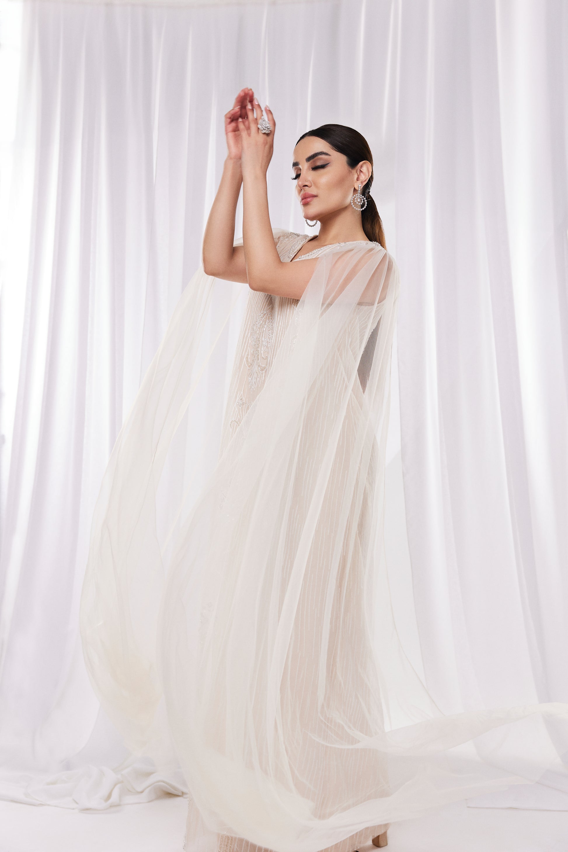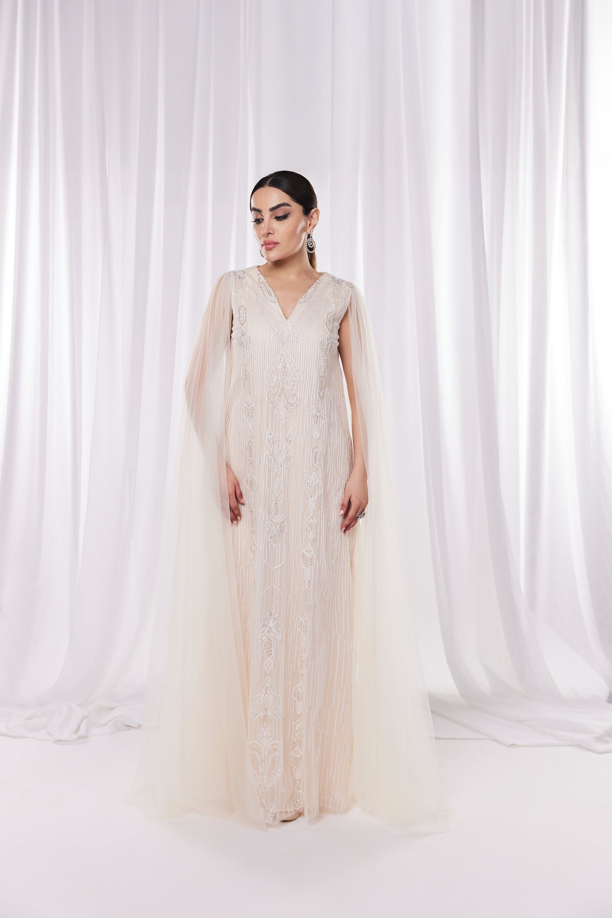 يتميز هذا الفستان الكريمي الساحر بتصميم عباءة منسدلة وتطريزات خرزية معقدة. يضفي خط العنق العميق على شكل حرف V لمسة عصرية، بينما يضمن القماش خفيف الوزن الراحة والأناقة. مثالي للمناسبات المسائية، يجمع هذا الفستان بين الرقي والأناقة المعاصرة.