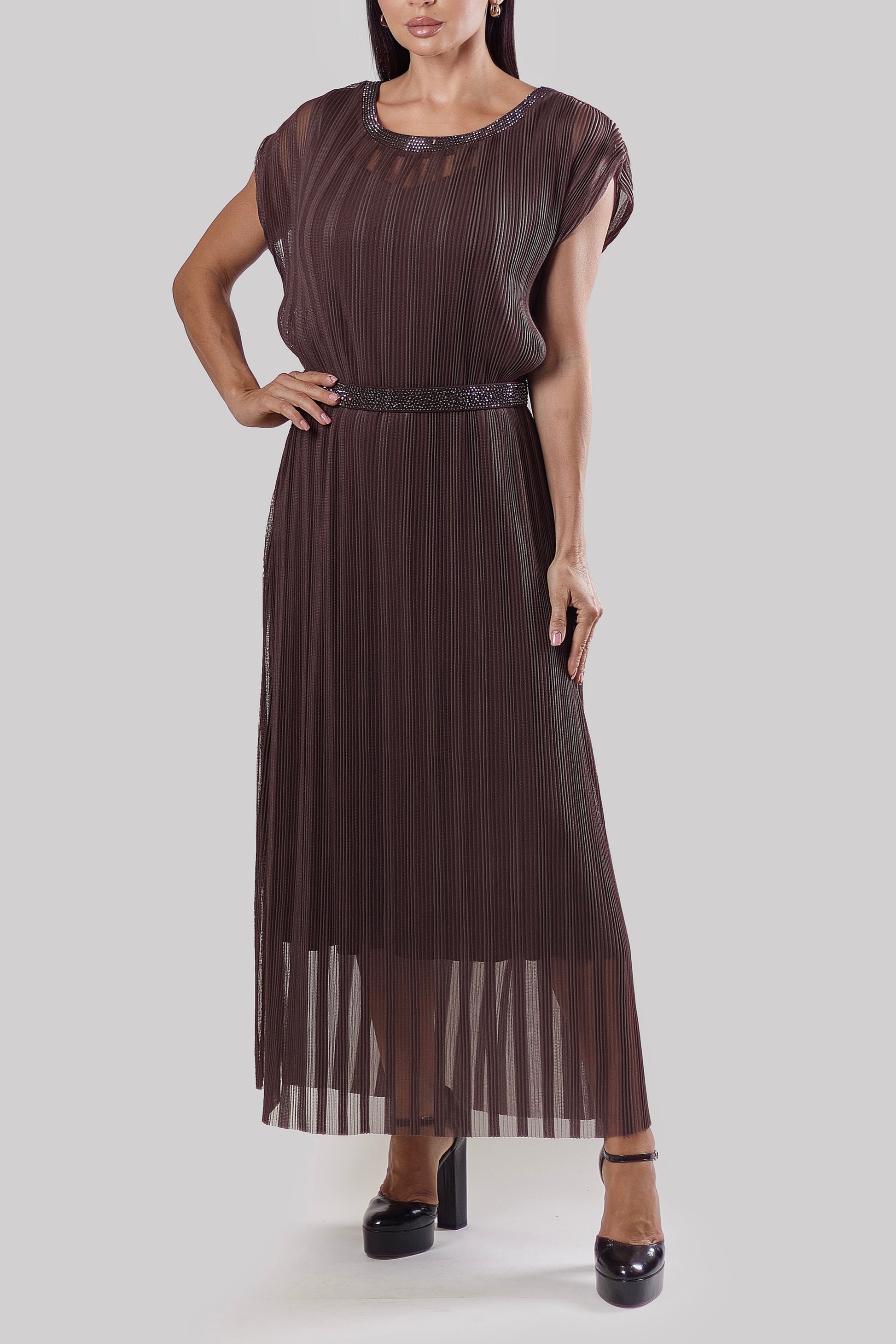 A sophisticated pleated maxi dress in a rich chocolate hue, featuring a subtly shimmering neckline and waistband for a refined touch. Designed with a relaxed silhouette and sheer overlay that flows effortlessly with every movement.