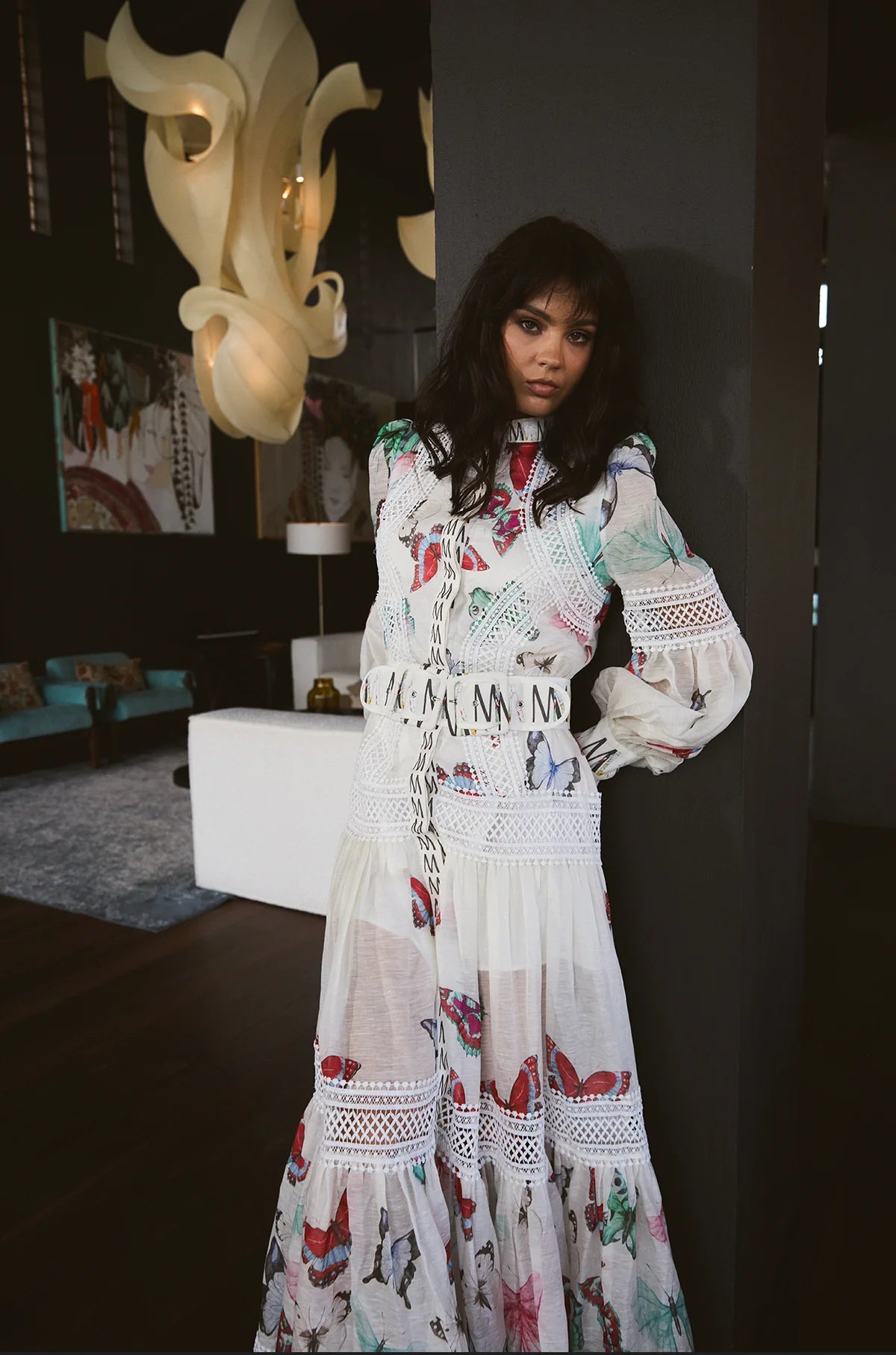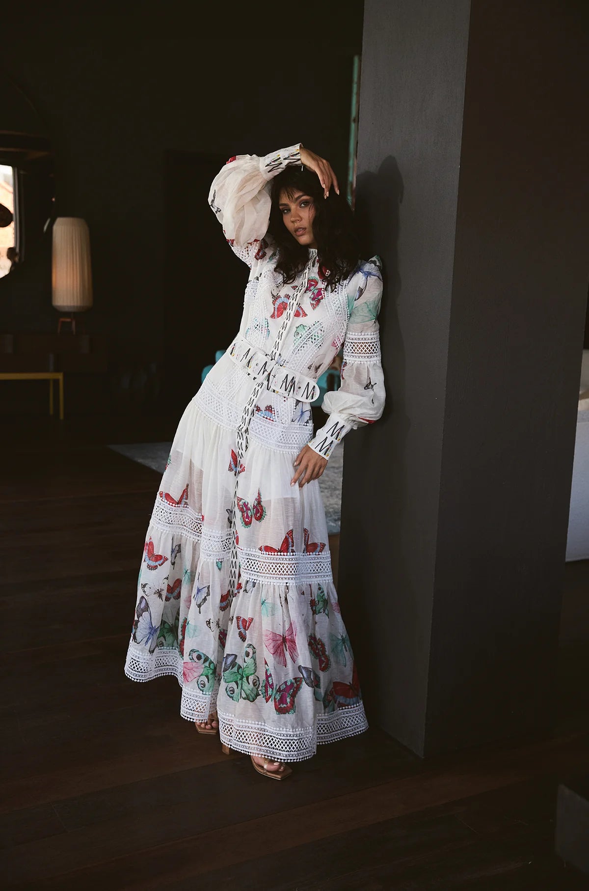 نقدم لكم فستان "الفراشة الباهتة" ماكسي. لمسة من سحر الطبيعة، يجسد هذا الفستان جمالاً رقيقاً في حركته. مصنوع من حرير الرامي الأبيض الرقيق، وينبض تصميمه الانسيابي بالحياة بفضل فراشات كبيرة الحجم مطبوعة يدوياً بألوان مائية ناعمة - كل واحدة فريدة كرفرفة أجنحة عابرة. تضفي حواف الدانتيل الفرنسي لمسة رومانسية كلاسيكية، حيث ترسم خط العنق والتنورة والأكمام بأناقة هادئة. تتحرك التنورة الواسعة بسلاسة ساحرة، بينما يوفر الجزء الداخلي المبطن بالكامل والحزام القابل للتعديل الراحة والشكل المثالي. سواء ارتديته حافية القدمين في الحديقة أو مع حذاء بكعب عالٍ لقضاء أمسية مميزة، فهذا الفستان هو حلم منسوج من الحرير والحبر.