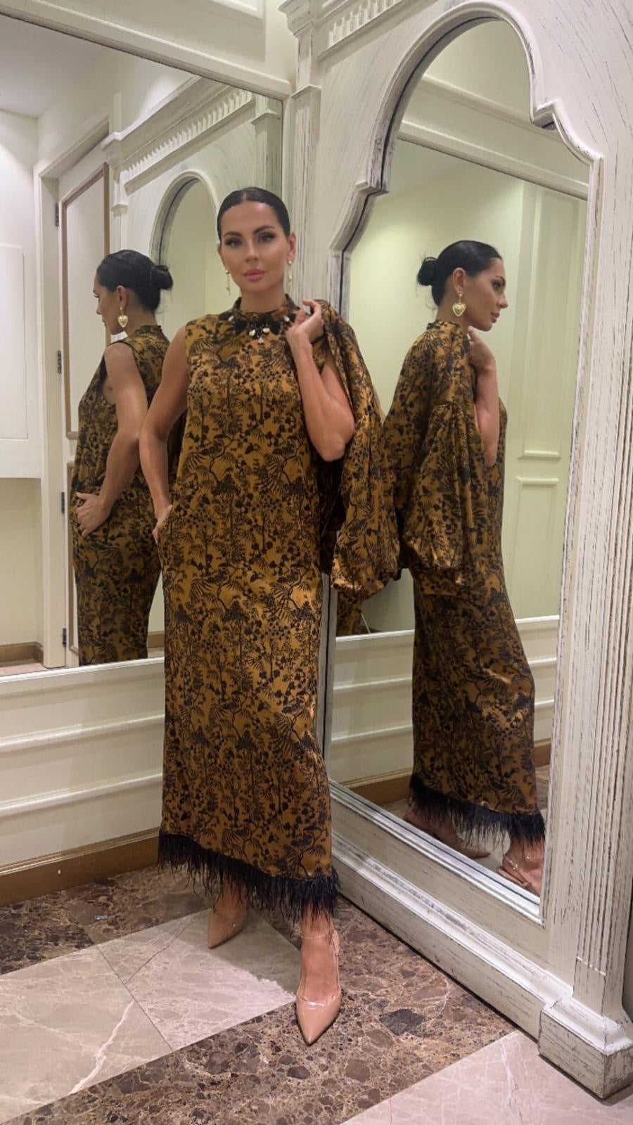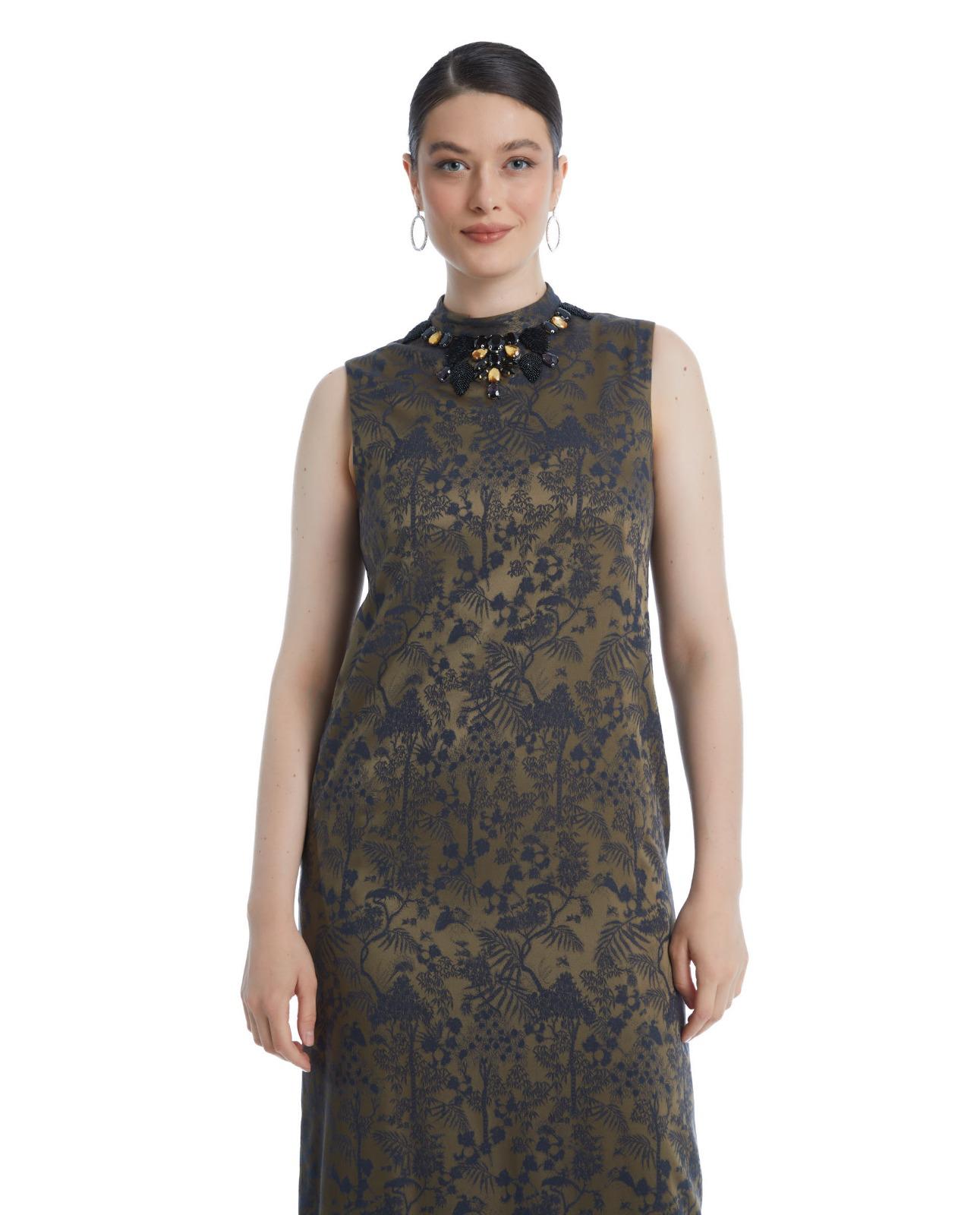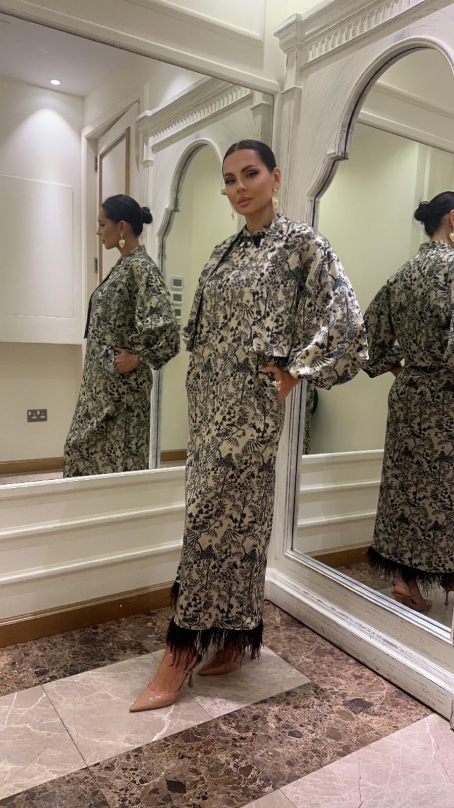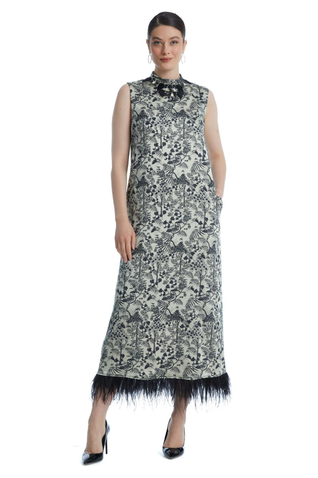 يتميز هذا الفستان بطبعة زهور فنية مذهلة في لوحة ألوان أحادية اللون من الأسود والأبيض. يتميز التصميم بدون أكمام بياقة عالية على شكل ماندرين وتنورة متوسطة الطول. تم تصميم الفستان بتداخل دقيق عند خط العنق، مما يخلق تأثيرًا متعدد الطبقات. تم تزيين جزء التنورة بحاشية ريشية مثيرة، مما يضيف لمسة من الأناقة الغريبة للمجموعة. يتميز المظهر الجمالي العام للفستان بالرقي الحديث، حيث يمزج بين العناصر الرسومية الجريئة والشكل الأنثوي المكرر. ينتج عن الجمع بين التفاصيل الهيكلية والطباعة المجردة المذهلة قطعة جذابة بصريًا ومتطورة.
