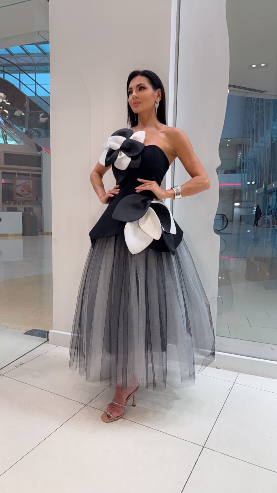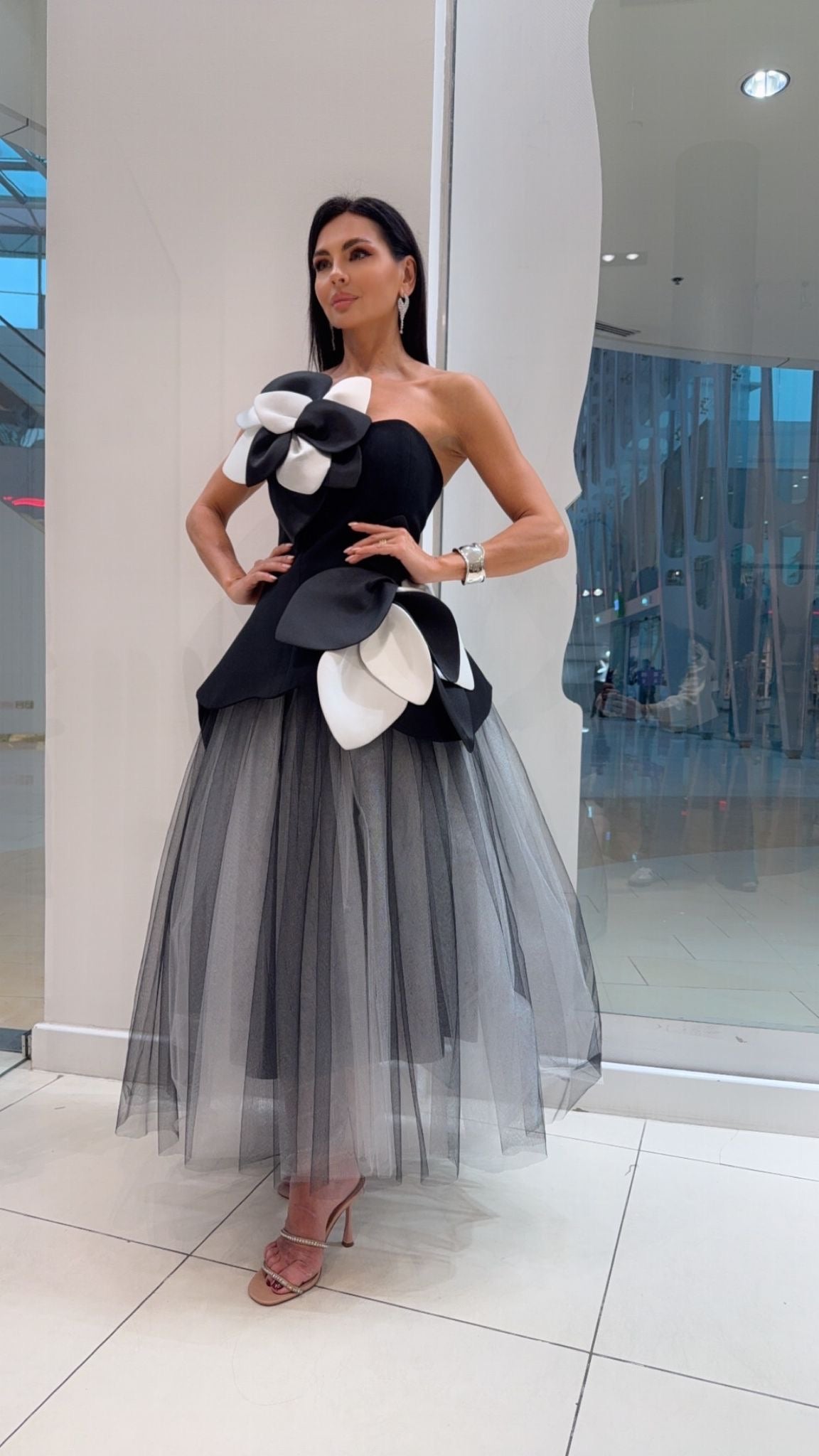 يتميز هذا الفستان بدون حمالات بصدرية سوداء أنيقة وتنورة من التول المتدفقة. العنصر المميز هو الزخارف الزهرية كبيرة الحجم باللونين الأبيض والرمادي، مما يضفي لمسة فنية جريئة. مثالي للمناسبات الرسمية.