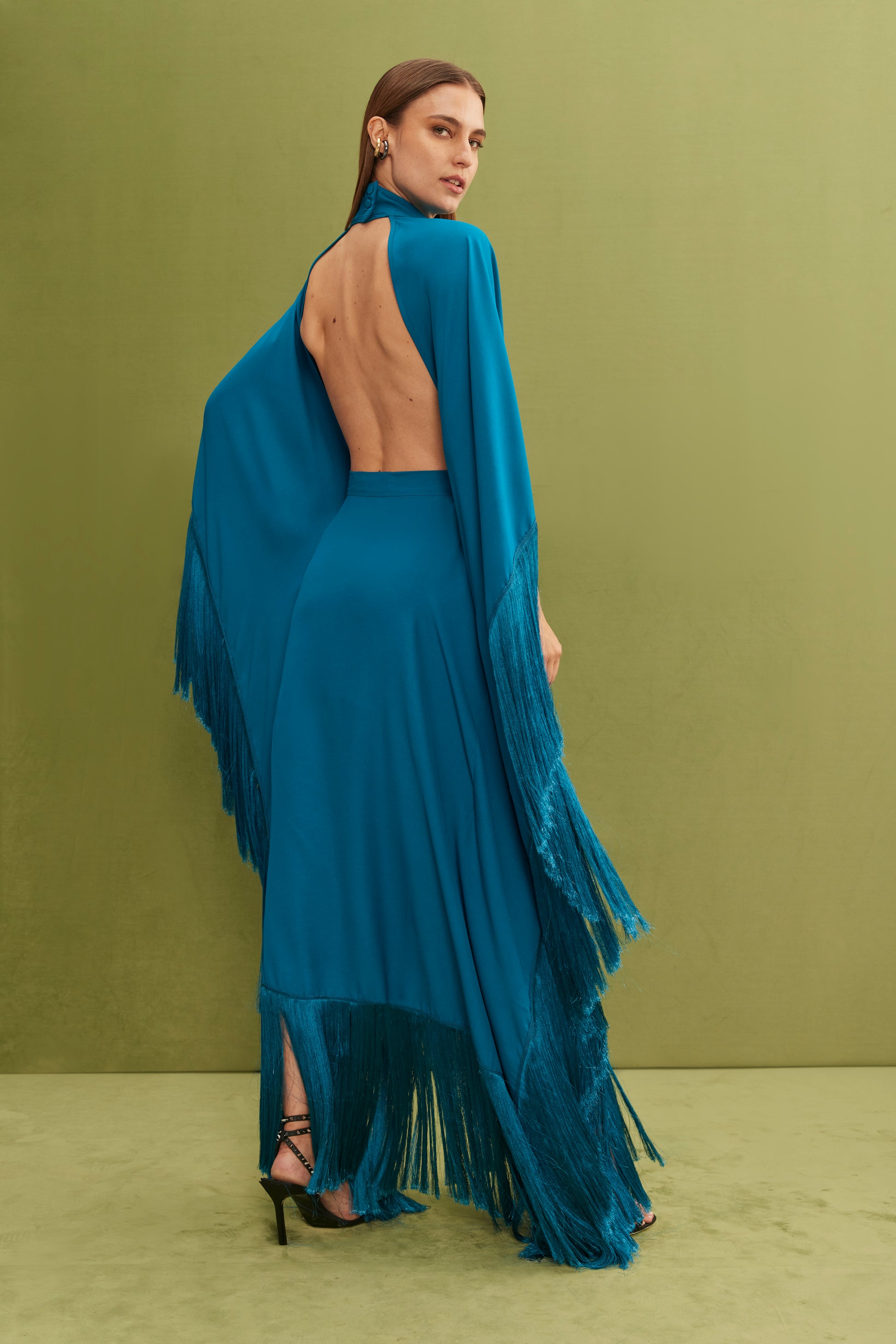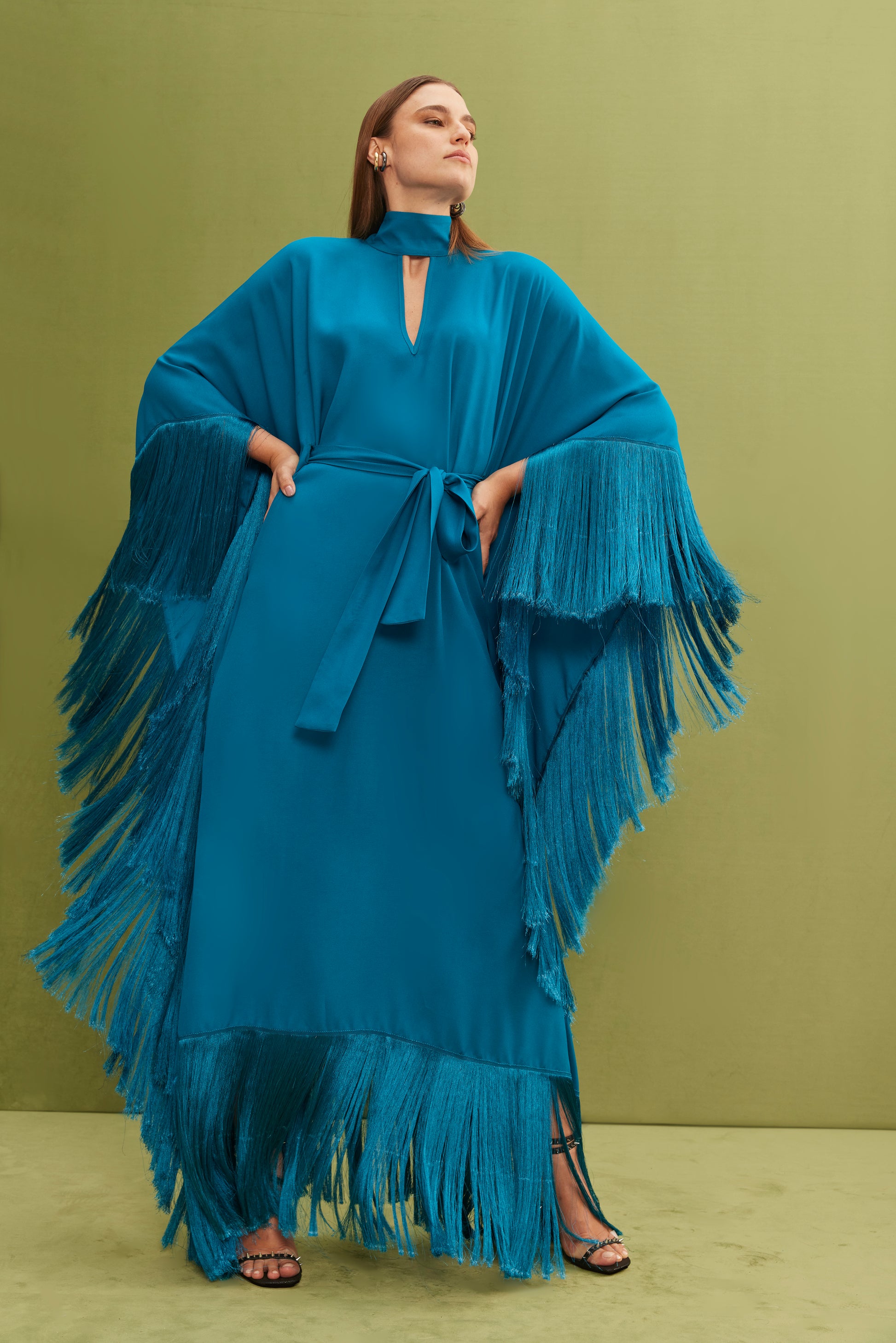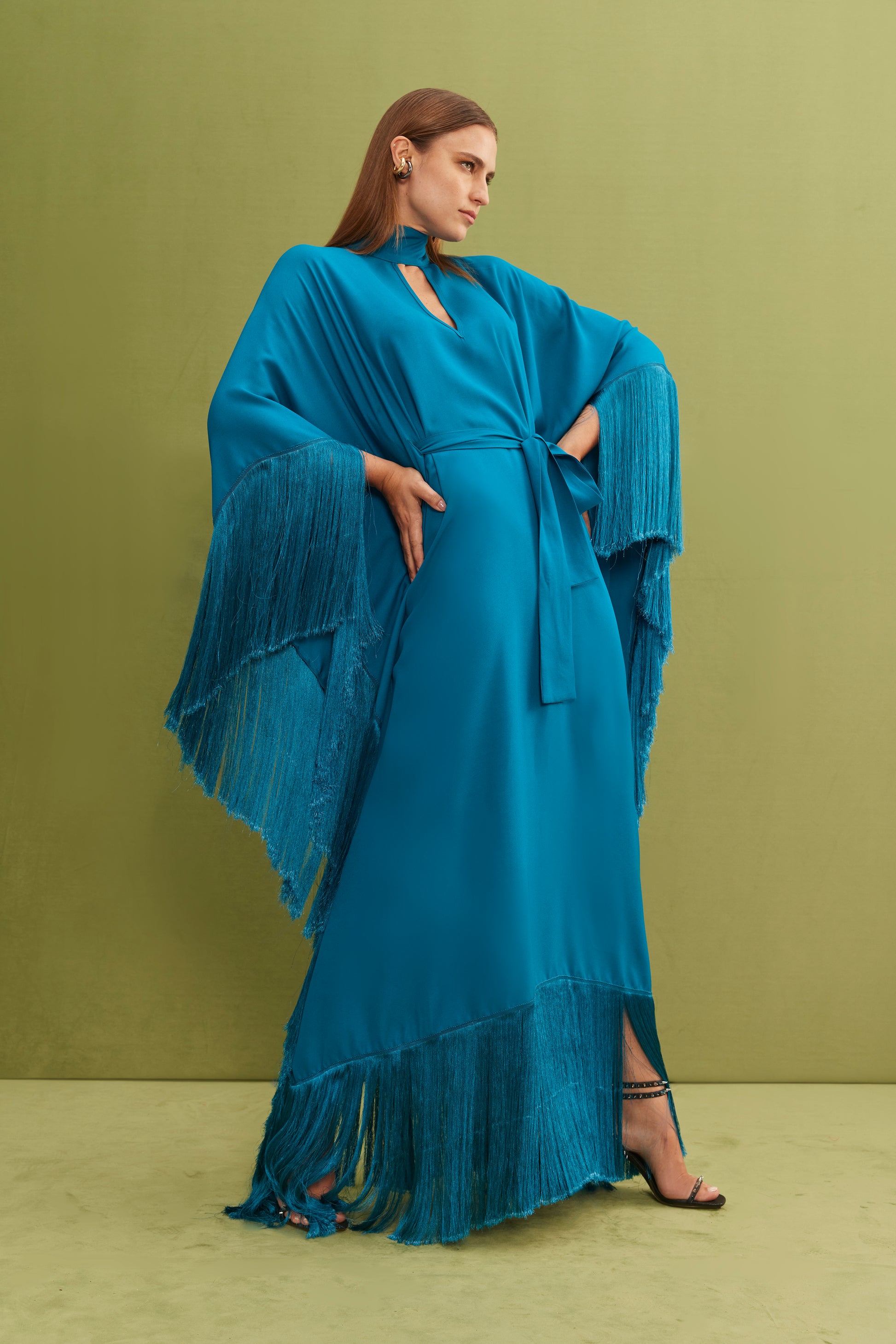 اخطفي الأنظار بهذا الفستان الطويل الرائع ذي الحواف، والذي صُمم ليترك انطباعًا لا يُنسى. صُنع هذا الفستان من قماش فاخر بلون أخضر مخضر نابض بالحياة، ويتميز بفتحة رقبة عالية فريدة وفتحة على شكل مفتاح تضيف لمسة من الجاذبية. تخلق تفاصيل الحواف الدرامية على طول الأكمام والحاشية حركة جميلة، مما يجعل كل خطوة مميزة. مع حزام الخصر لملاءمة جذابة، يعزز هذا الفستان من شكلك الظلي مع توفير الراحة والأناقة.