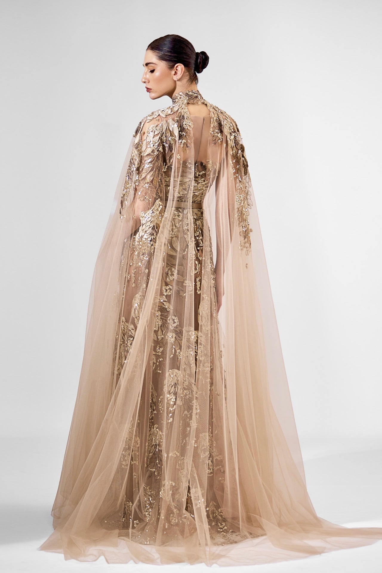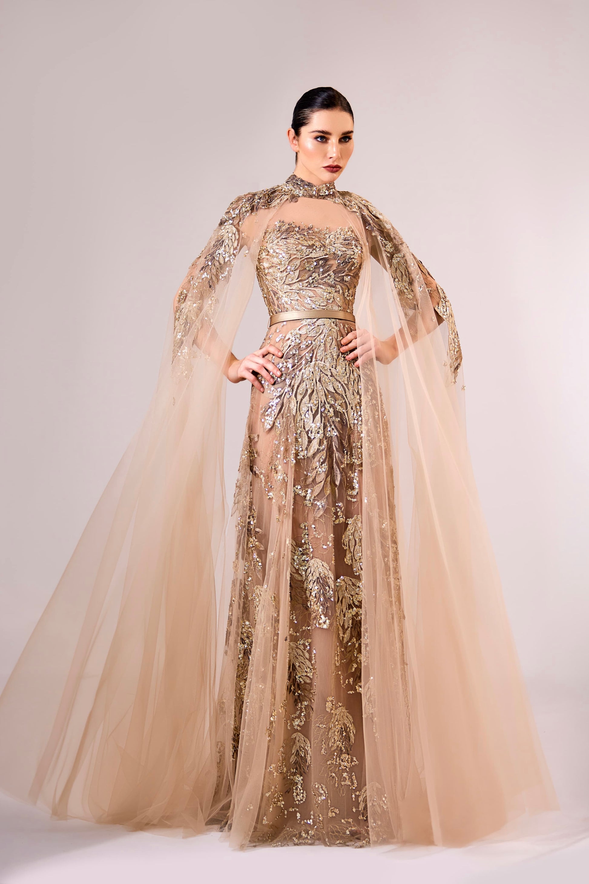 تصميم برقبة عالية، وتطريز ذهبي معقد، وعباءة شفافة متدفقة.