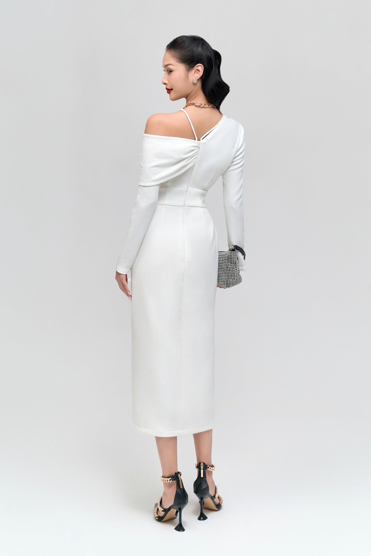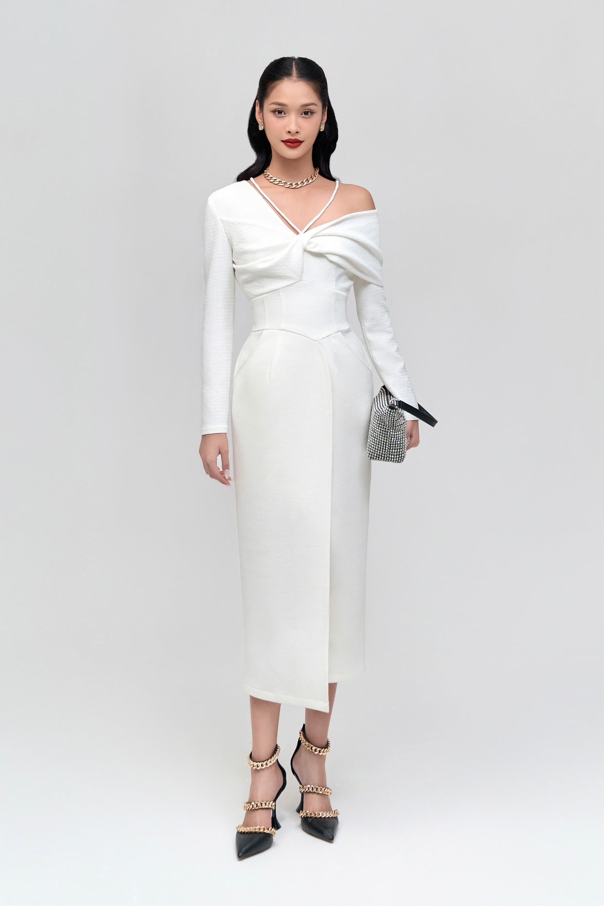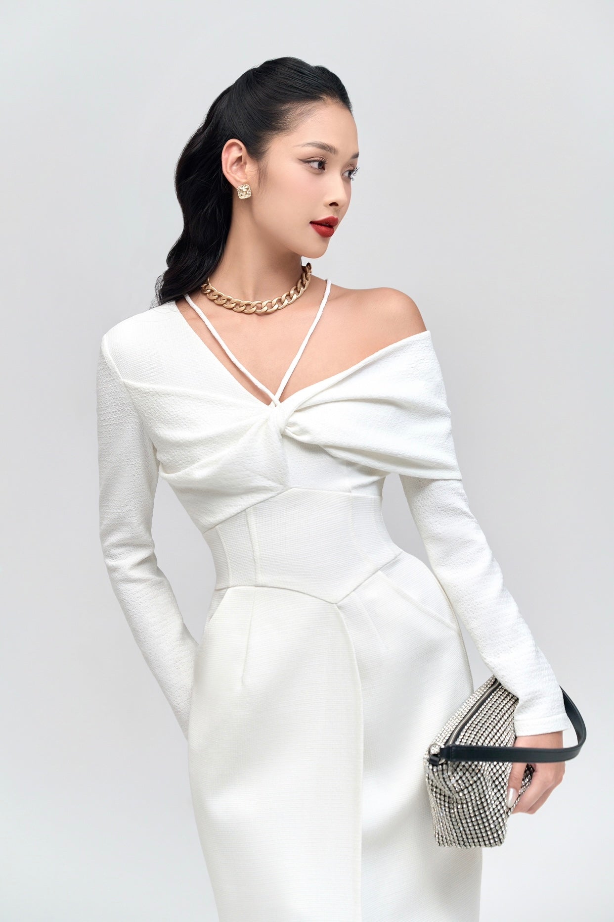 فستان "جريفل" ذو الكتف المائل يُضفي أناقةً وسحرًا على كل إطلالة. مصنوع من نسيج محبوك مموج بسماكة ومرونة مثالية، ويضيف لمسةً من الدانتيل الرقيق مع كل حركة. ولا تزال تقنية شد الخصر ورفع الوركين تُستخدم بسلاسة لمساعدة النساء على إبراز قوامهن بثقة، وجذب الأنظار.