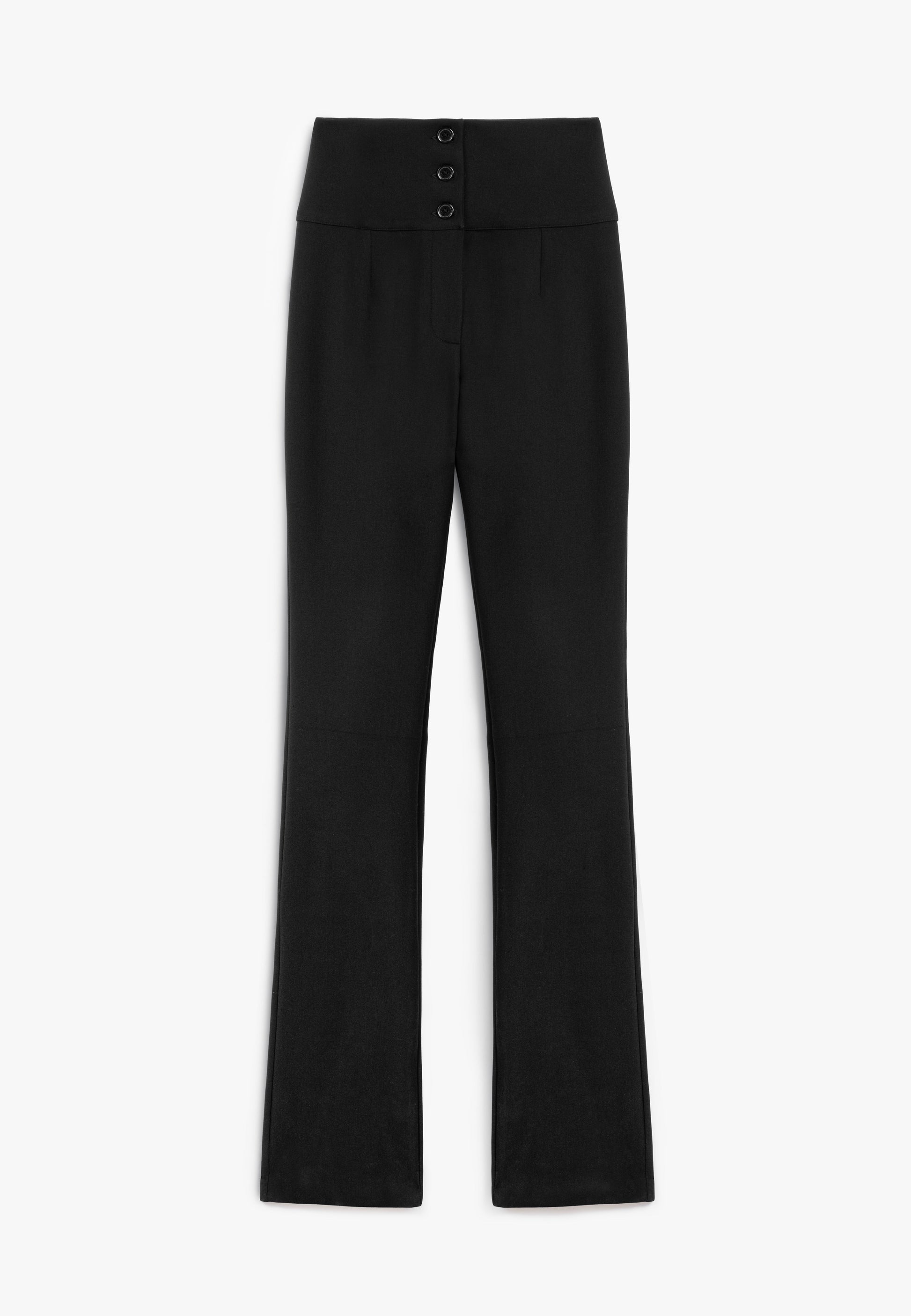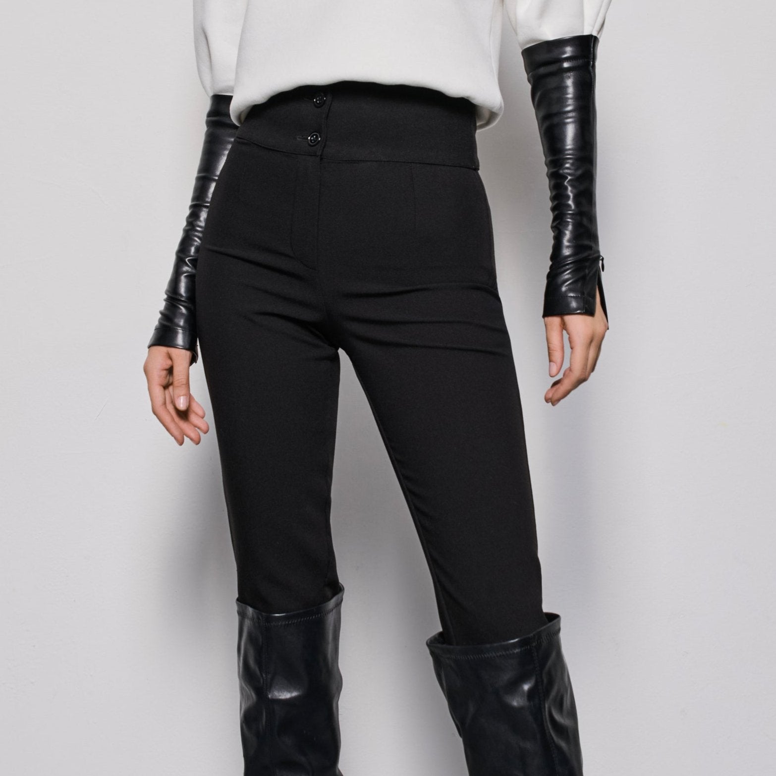 بنطلون كلاسيكي أسود بقصة ضيقة وخصر مرتفع مع تطريز معدني أسود من KKoncept على الجانب الخلفي.