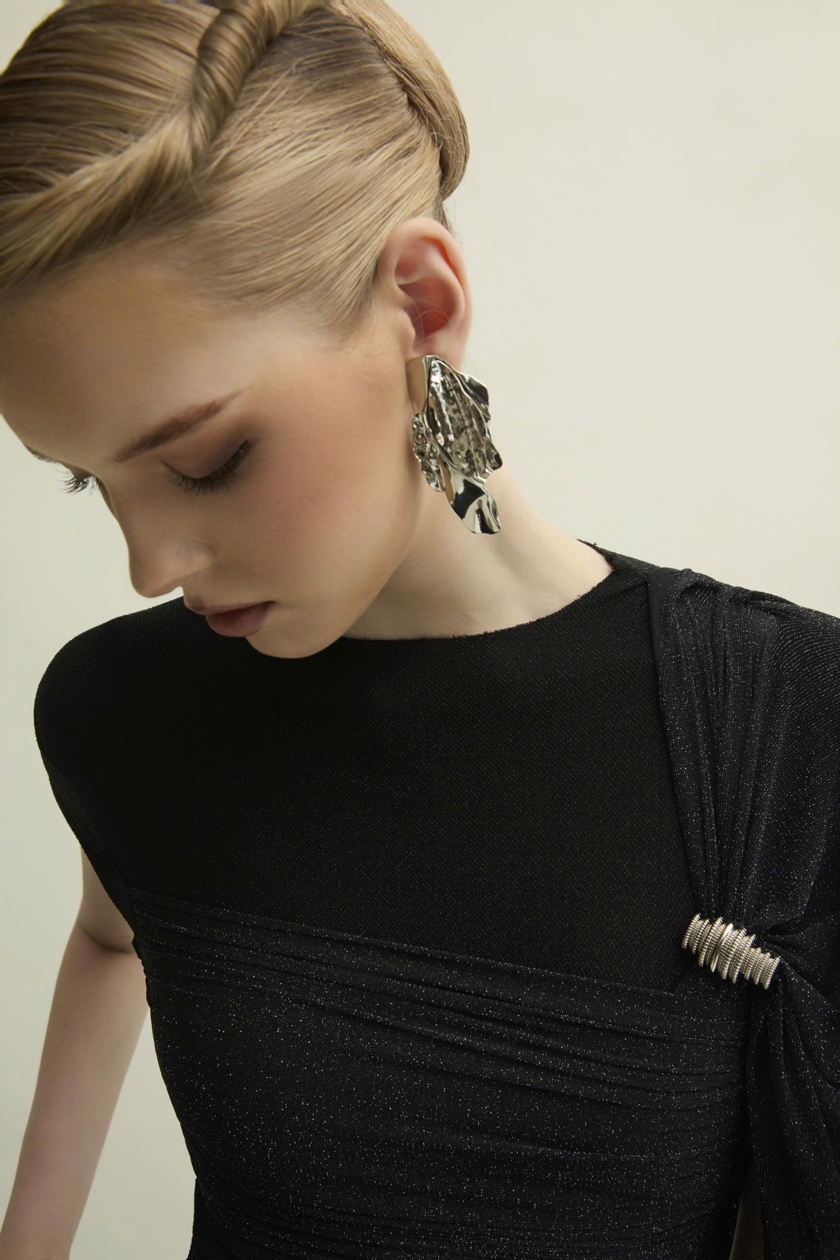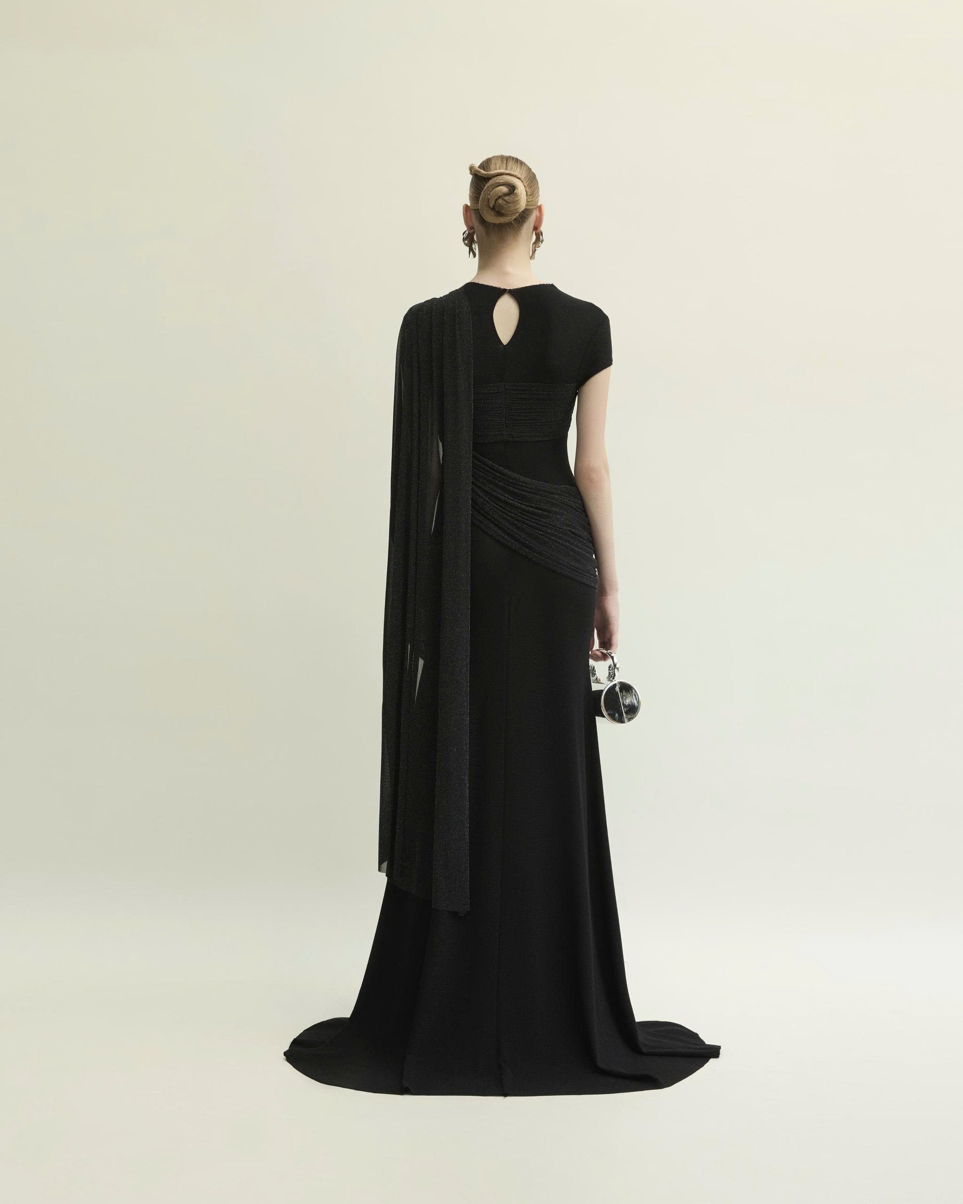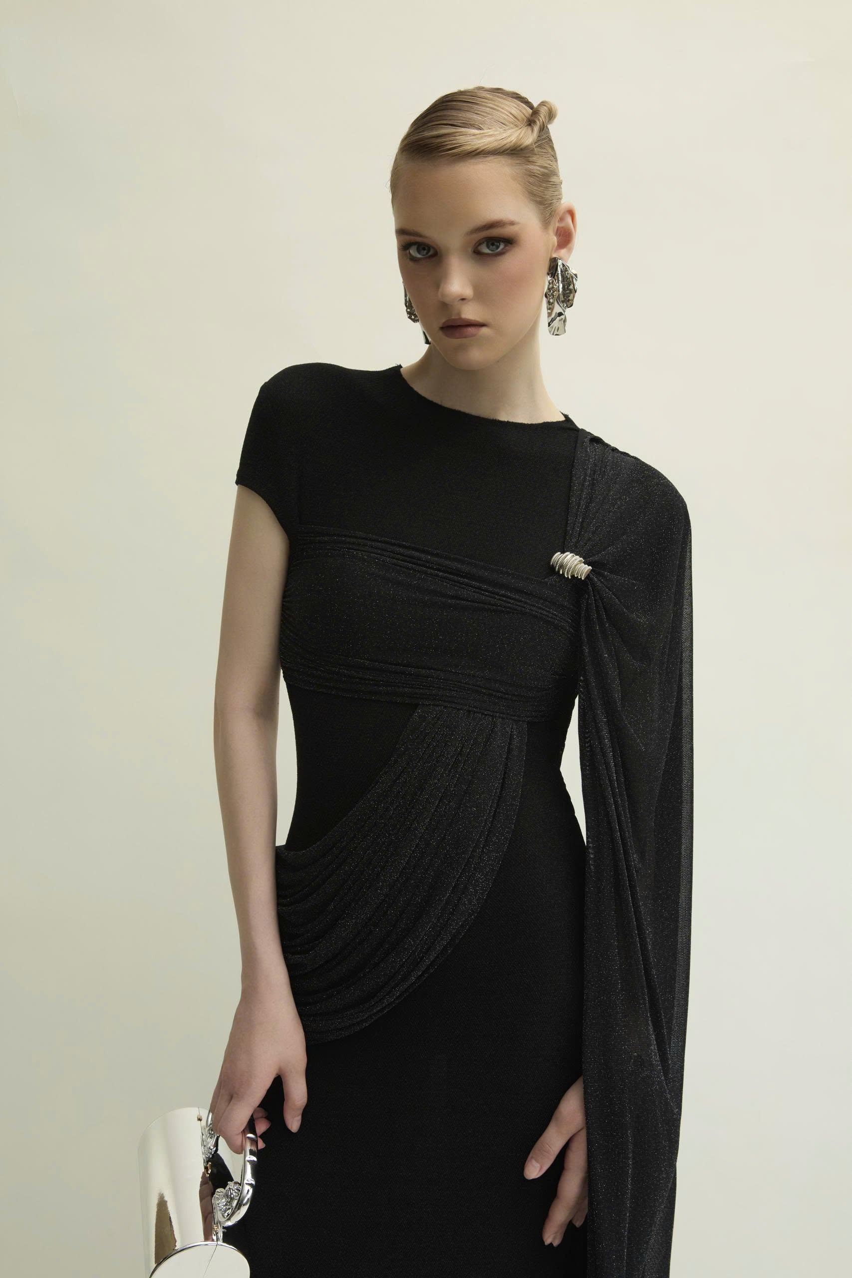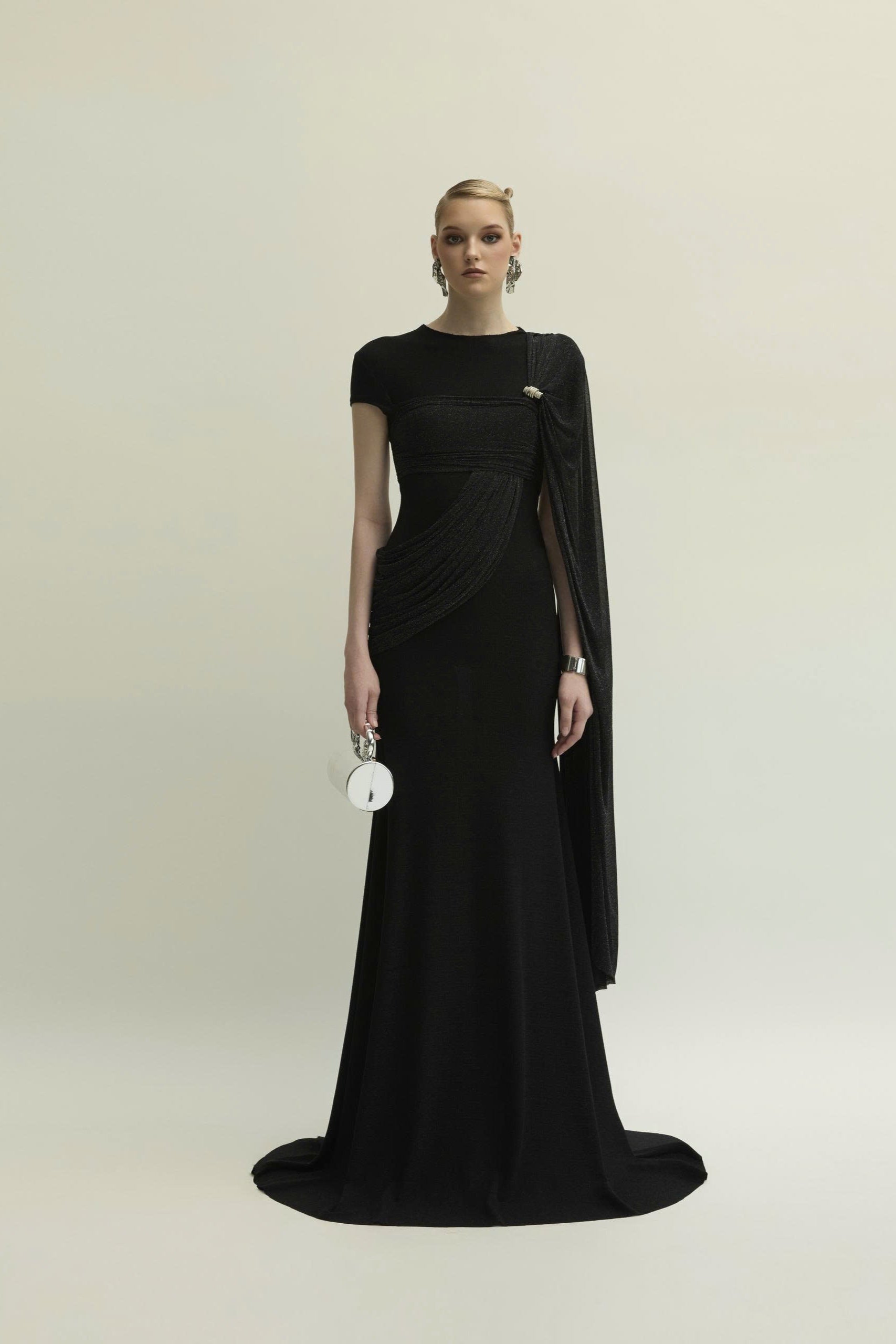 فستان سهرة أسود ساحر، مصمم بأناقة راقية. يتميز بقصة ضيقة وتفاصيل أنيقة على الصدر والخصر، مما يضفي عليه إحساسًا راقيًا بالحركة. يرتقي الفستان بتأثير الكاب المثير بكتف واحد، مثبتًا بدبوس مرصع بالجواهر لإضفاء لمسة من الأناقة. قطعة خالدة وجريئة في آن واحد، مثالية للحظات السجادة الحمراء والسهرات الأنيقة.