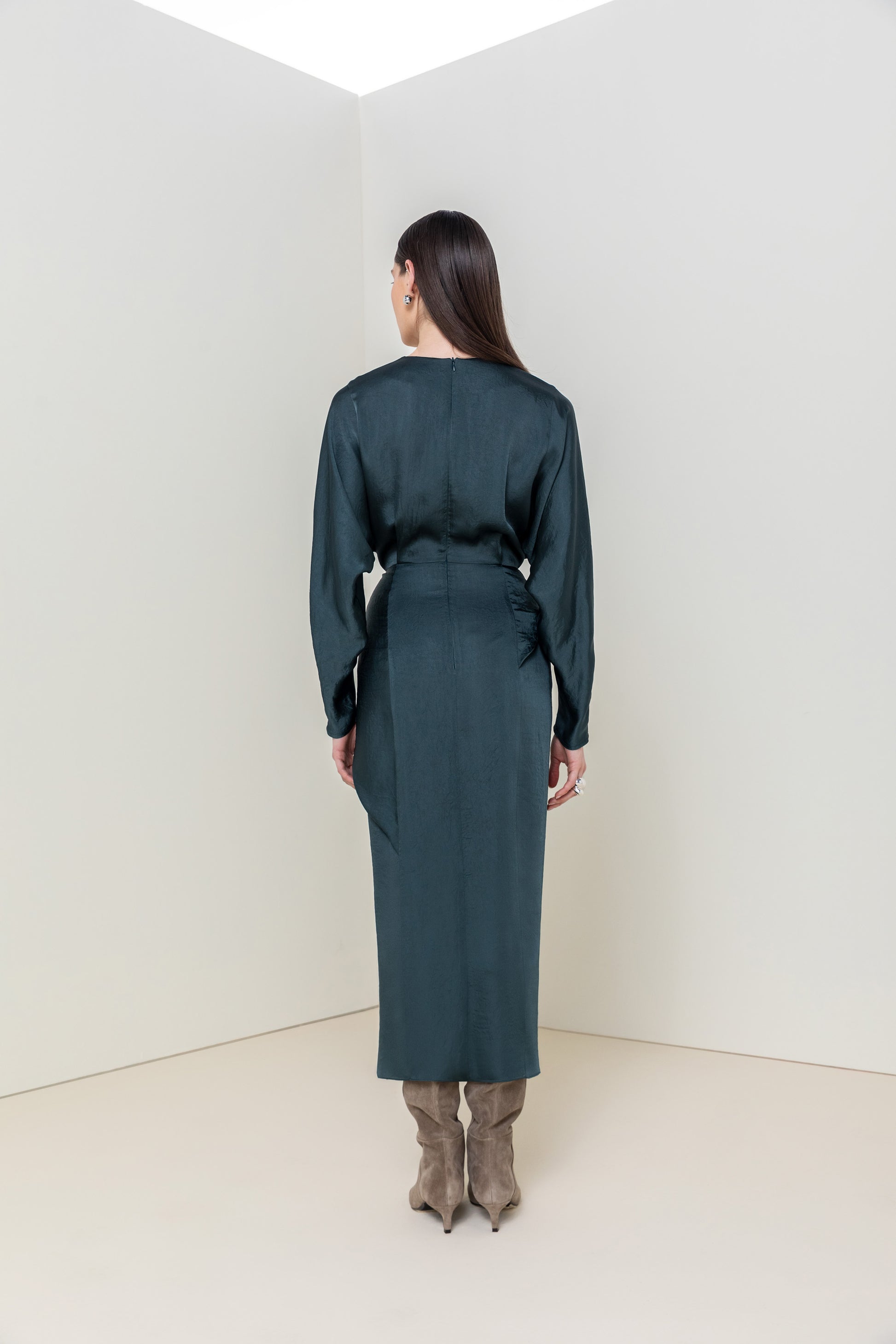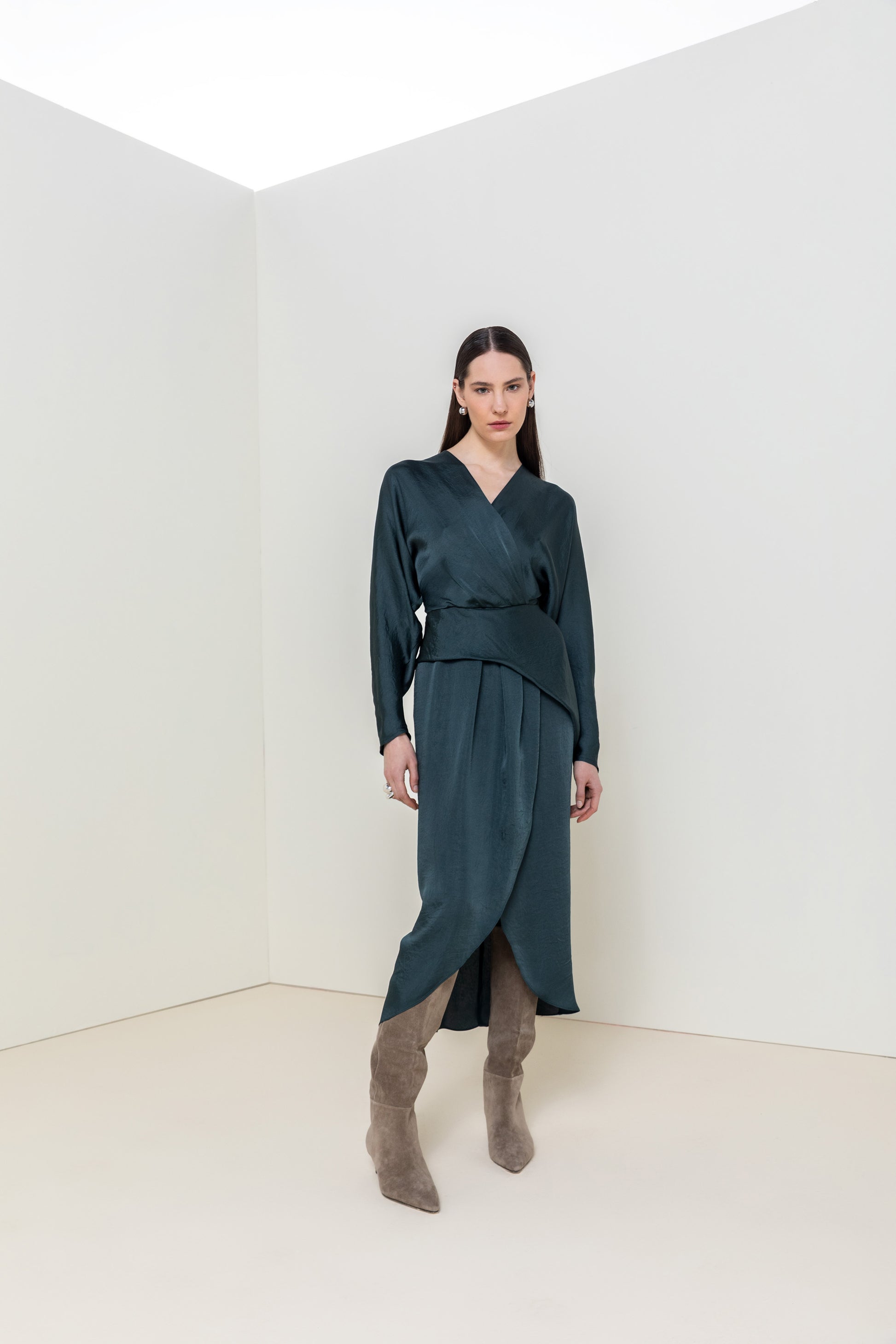 فستان "ميدنايت ويلو" الملفوف، الأنيق والبسيط، مصنوع من ساتان أزرق مخضر غامق غني، ينساب بسلاسة مع كل خطوة. يتميز بتصميم ملفوف مع حزام خصر عريض يُبرز جمال قوامك، وأكمامه الطويلة وياقته الرقيقة على شكل حرف V تُضفي عليه لمسة من الأناقة. تُضفي الحافة غير المتماثلة لمسة عصرية، بينما يُضفي لمعان القماش الناعم لمسةً مثالية. نسقيه مع حذاء من جلد الغزال لإطلالة جريئة ومُتباينة، أو ارتديه مع حذاء بكعب عالٍ لإطلالة مسائية أنيقة. مثالي للتجمعات الراقية، أو حفلات العشاء الحميمة، أو حتى للمناسبات المميزة.