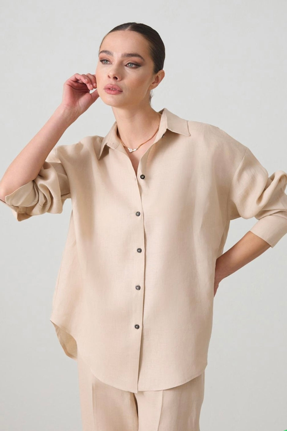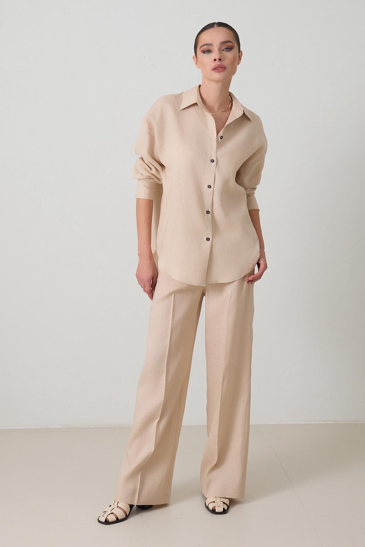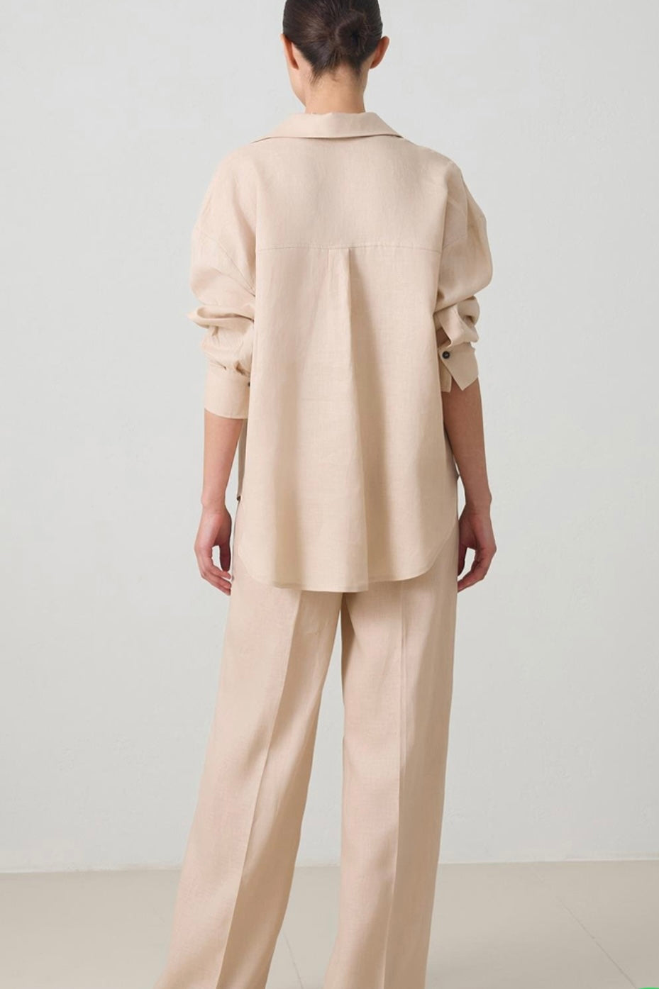 استمتعي بأناقة أنيقة وبسيطة مع طقم الكتان البيج هذا، المصمم لراحة وأناقة فائقة. يتميز الطقم بقميص مريح بأزرار وياقة كلاسيكية وأزرار سوداء أنيقة، مع بنطال واسع الساقين بتصميم مميز لإطلالة كلاسيكية. مصنوع من الكتان عالي الجودة، مما يجعله الخيار الأمثل للطقس الدافئ، سواءً كنتِ ترغبين في ارتداء ملابس أنيقة للعمل أو لقضاء يوم عادي. نسقيه مع صندل أو حذاء بدون كعب لإطلالة أنيقة وطبيعية.