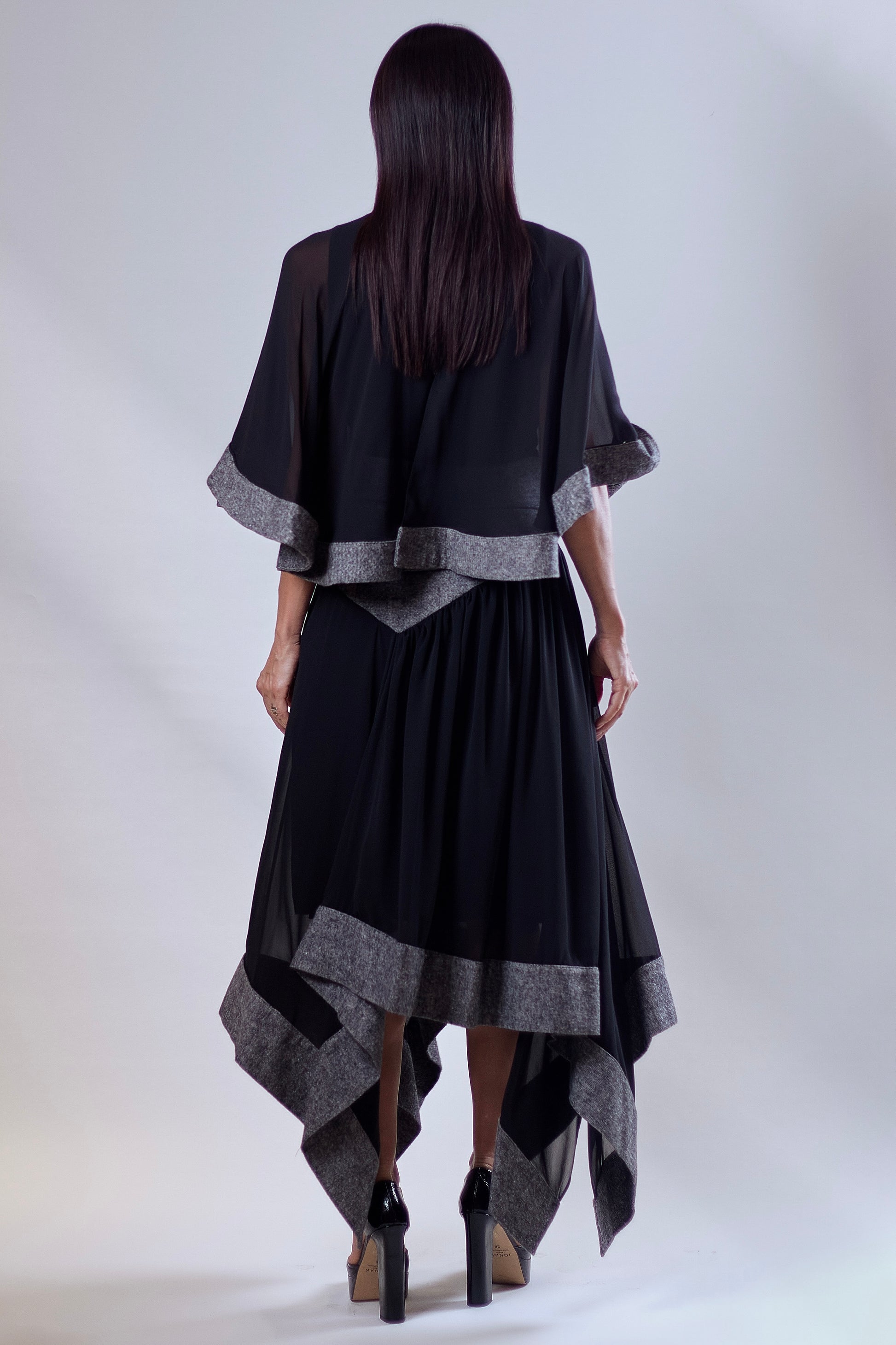 An elegant two-tone ensemble blending sheer black chiffon with textured grey accents. The flowing layered cape and asymmetrical hemline create a refined yet modern silhouette, finished with statement gold buttons for a touch of sophistication.