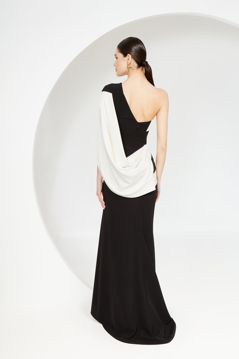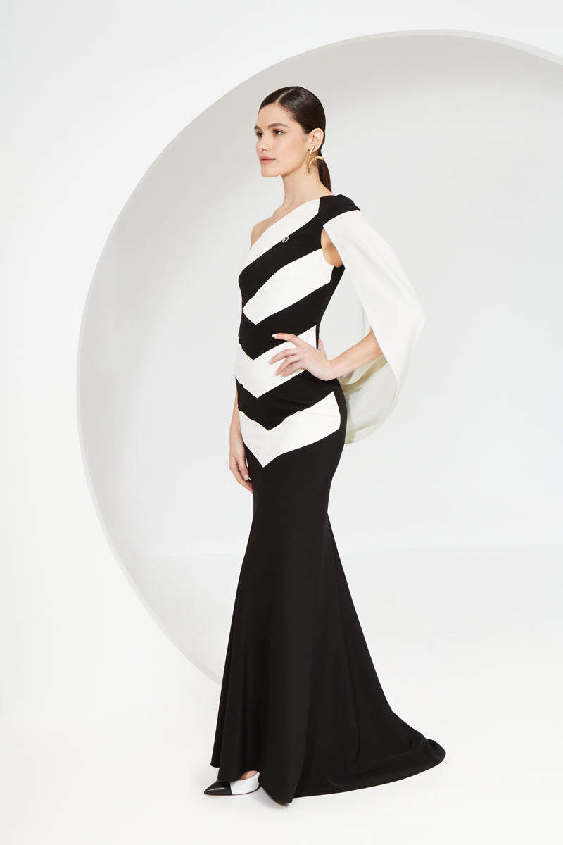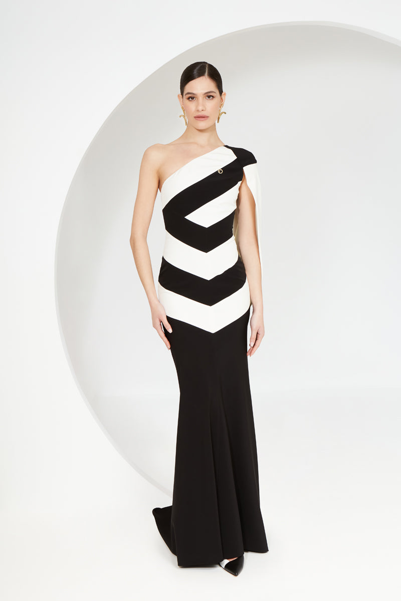 تعرض الصورة فستان سهرة مذهل بكتف واحد بألوان جريئة باللونين الأسود والأبيض. يتميز الفستان بنمط مخطط قطري غير متماثل يخلق صورة ظلية مذهلة بصريًا ومعمارية. يضيف الصدر الضيق والتنورة الواسعة التي تصل إلى الأرض لمسة أنيقة ودرامية إلى التصميم. يمنح مخطط الألوان البسيط عالي التباين والأنماط الهندسية هذا الفستان جمالية عصرية ومتطورة.