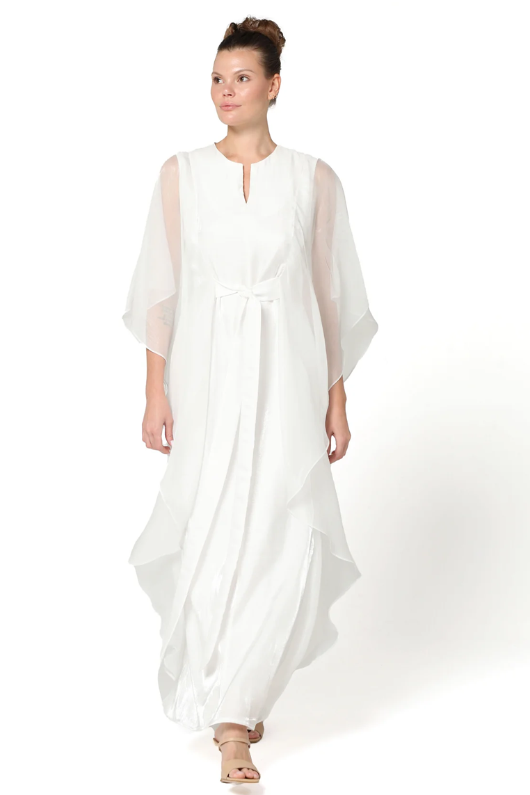 فستان طويل مصنوع من أقمشة متباينة الألوان، يتميز بأكمام مكشكشة وحزام متصل لإبراز الخصر، الفستان مبطن بقماش رايون ناعم لمزيد من الراحة.
