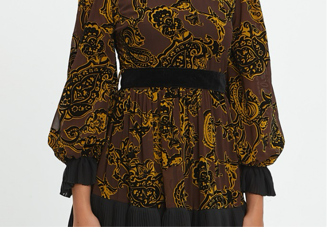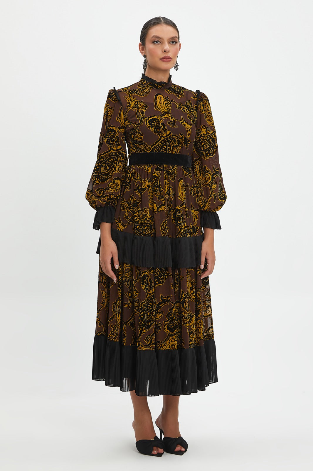 الفستان عبارة عن طبعة بيزلي مذهلة ودرامية بدرجات دافئة من اللون البني والذهبي. يتضمن التصميم الفضفاض رقبة عالية مكشكشة وأكمامًا درامية منتفخة. الفستان مشدود عند الخصر بحزام أسود، مما يخلق شكلًا جذابًا ومنظمًا. يتميز جزء التنورة بتصميم متعدد الطبقات مع ألواح شيفون سوداء مطوية، مما يضيف لمسة من الحركة والأناقة. النمط الجريء المزخرف، جنبًا إلى جنب مع عناصر التصميم الرومانسية المستوحاة من العصر الفيكتوري، يمنح هذا الفستان إحساسًا آسرًا وعصريًا.