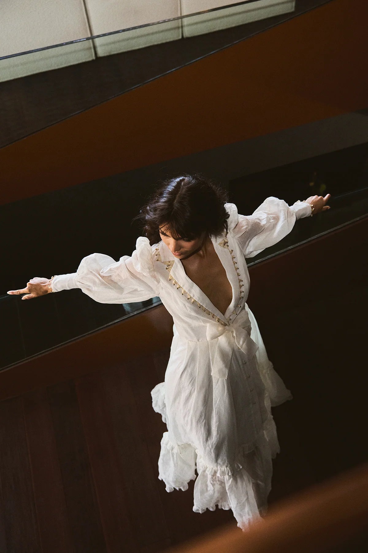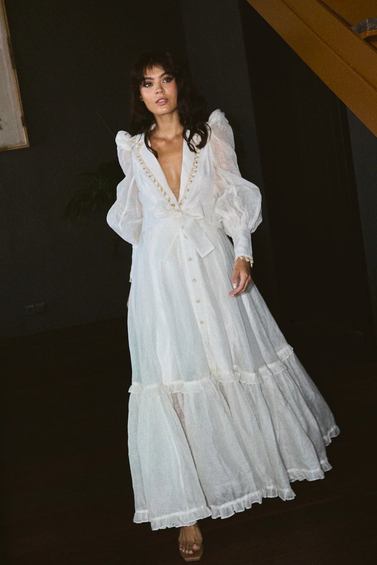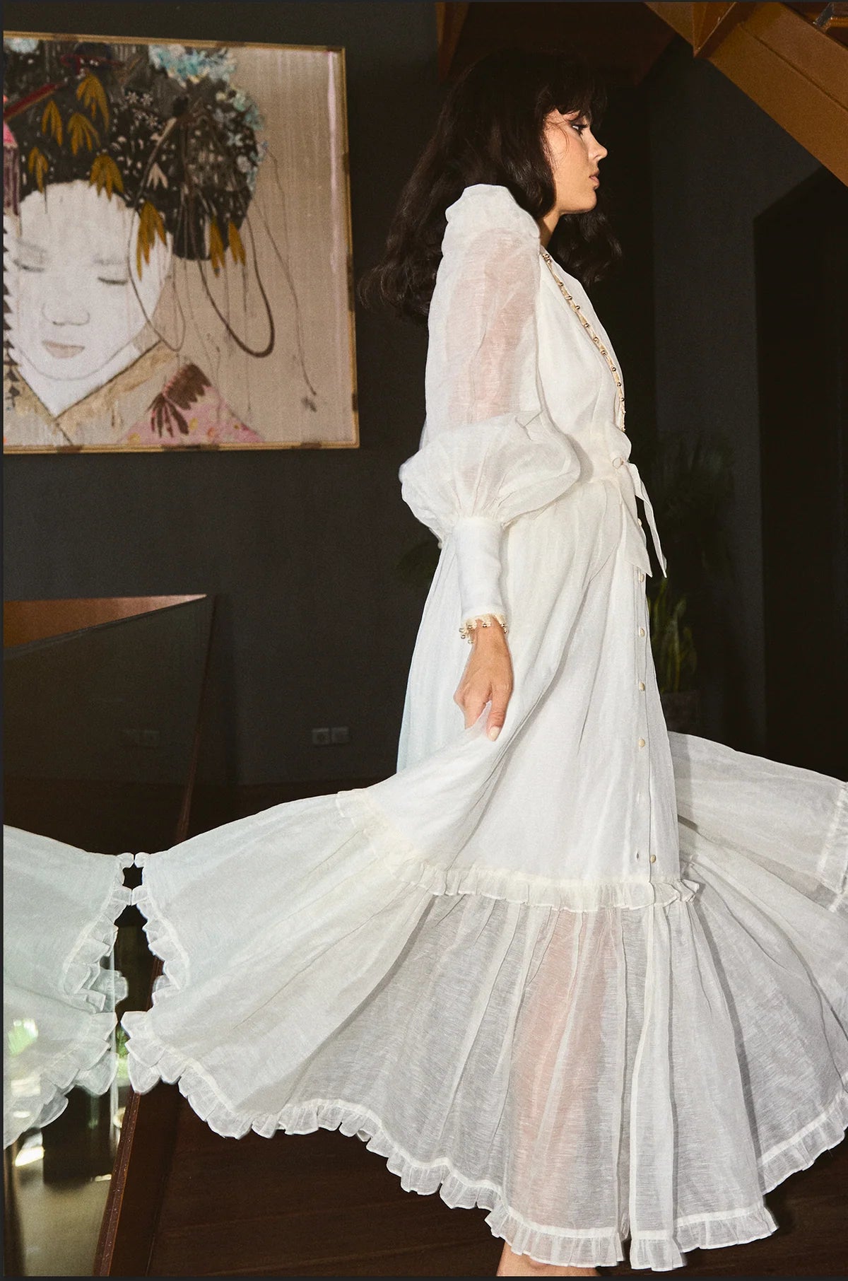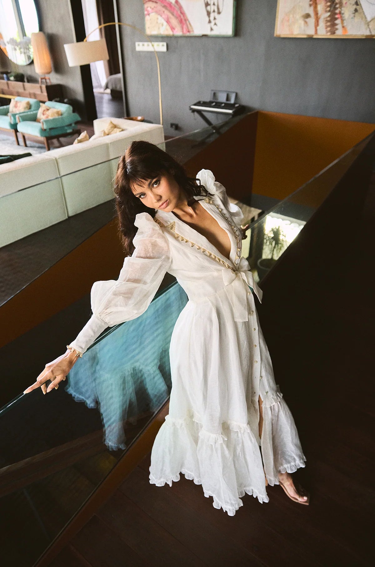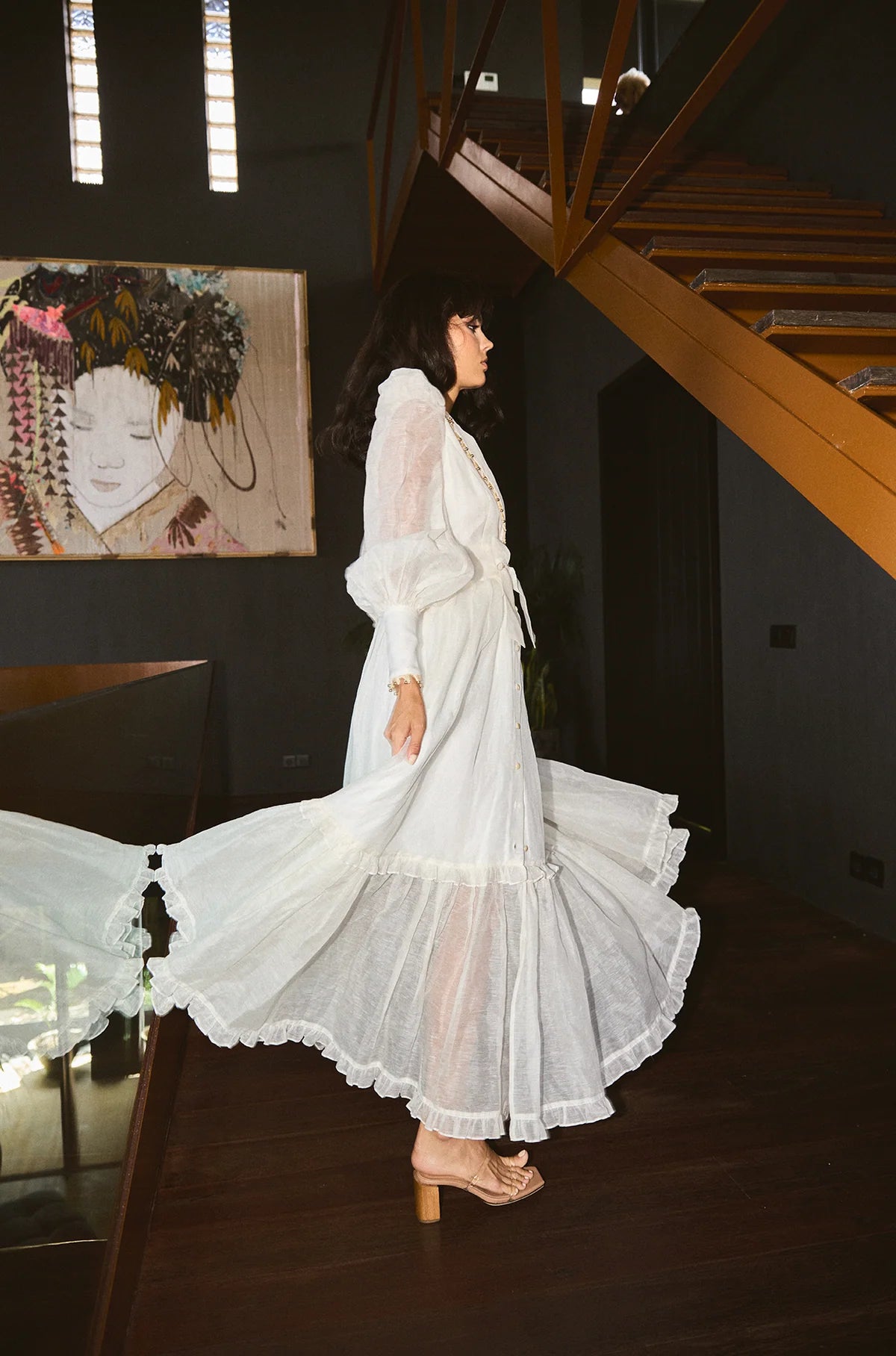 تلتقي الأناقة الكلاسيكية بالرومانسية العصرية في فستان ريفييرا ماكسي - فانيلا بين . صُمم هذا الفستان الماكسي متعدد الطبقات بلون أبيض شتوي ناعم، ويتميز بتفاصيل كشكشة رقيقة تضفي عليه لمسة أنثوية أنيقة.