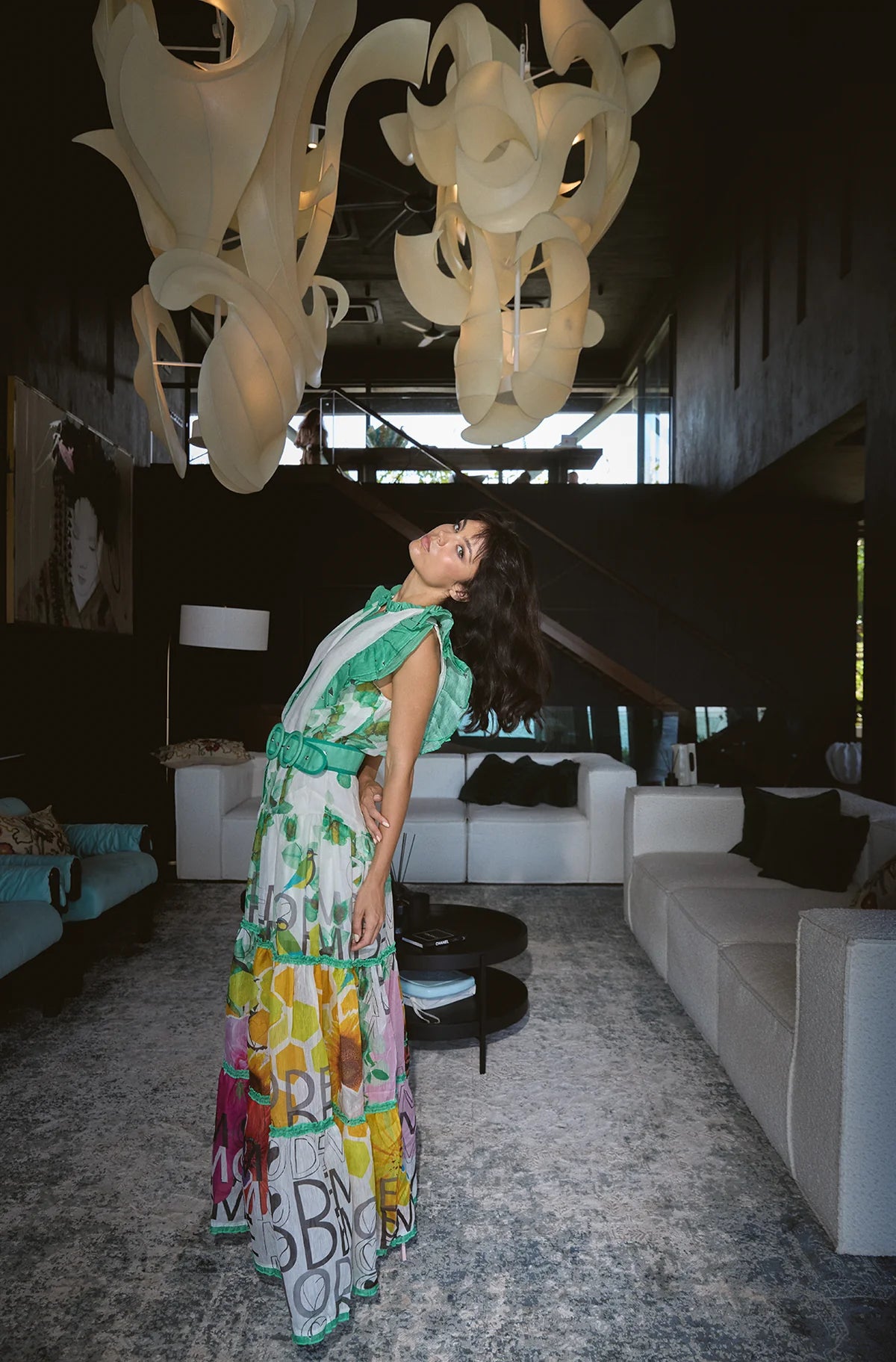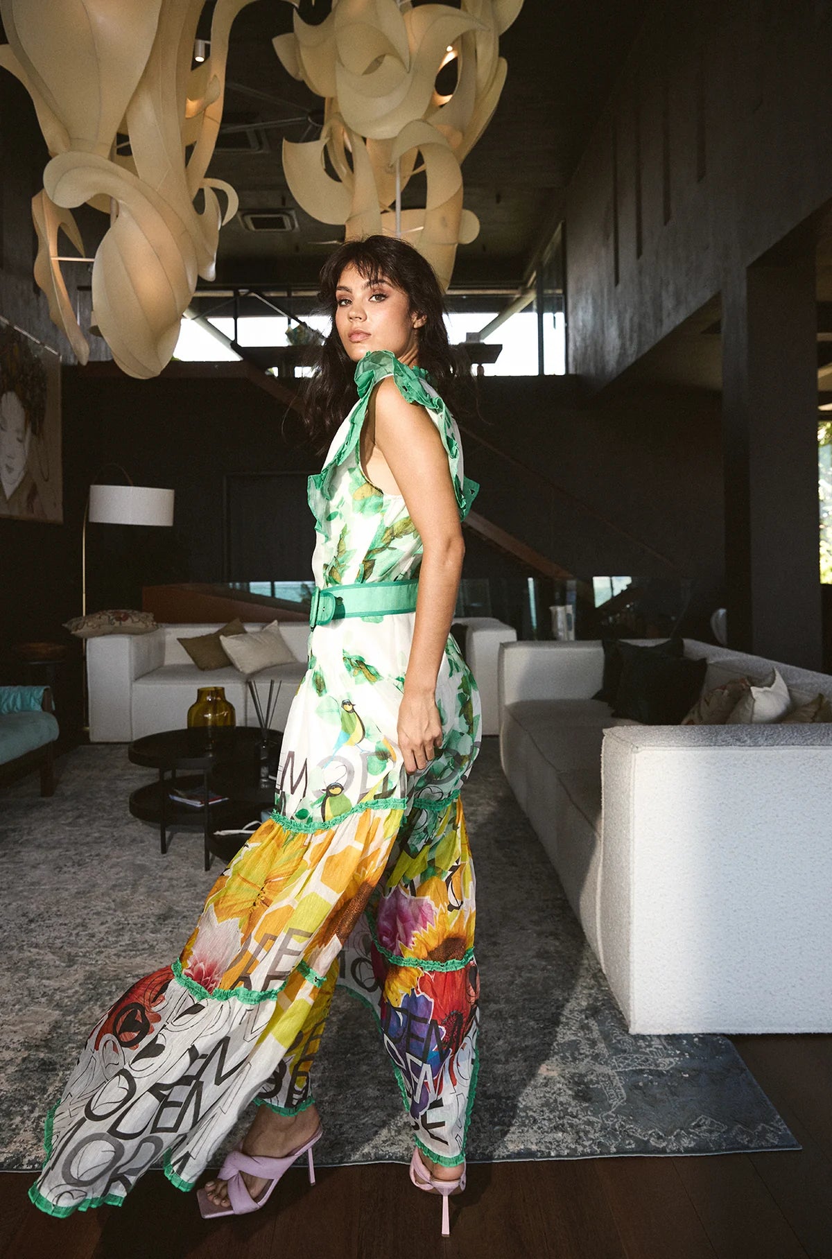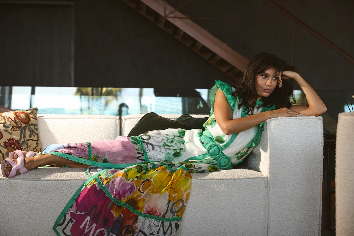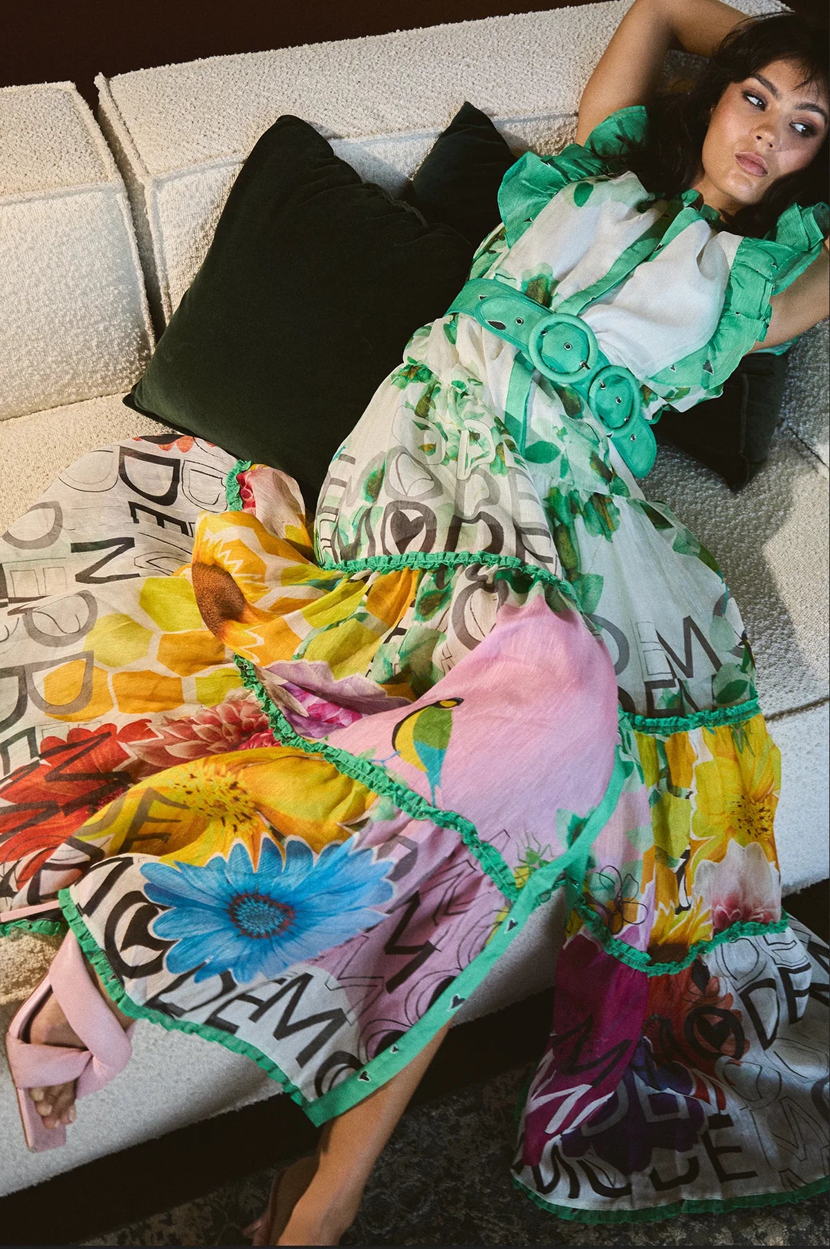 اكشفي عن سحركِ الكامن في هذا الفستان الحريري الطويل الرامي، حيث تلتقي الأناقة بخيالٍ نباتي. صُمم هذا الفستان بأكمام فراشات درامية ترفرف مع كل حركة، وهو مزين بسلسلة من طبعات الكرمة الخضراء وأزهار كبيرة الحجم ومشرقة تتفتح على طول التنورة - كل بتلة تنبض بالحياة والألوان. ترسم حواف خضراء زمردية الشكل، مما يضيف لمسة من الفخامة إلى قماش الحرير الانسيابي الذي ينساب بسلاسة. يتميز الجزء الأمامي بأزرار رقيقة وحزام أنيق قابل للتعديل، مما يسمح بمقاس شخصي يناسب كل منحنى. ويكمل شعار MODE المميز المطبوع على منطقة التنورة كعلامة على الفخامة الراقية. أنيق وجريء بلا خجل - صُمم هذا الفستان ليلفت الأنظار.