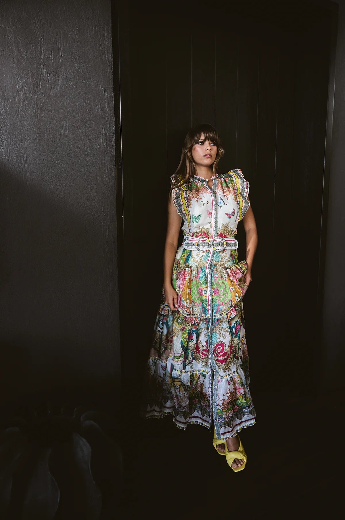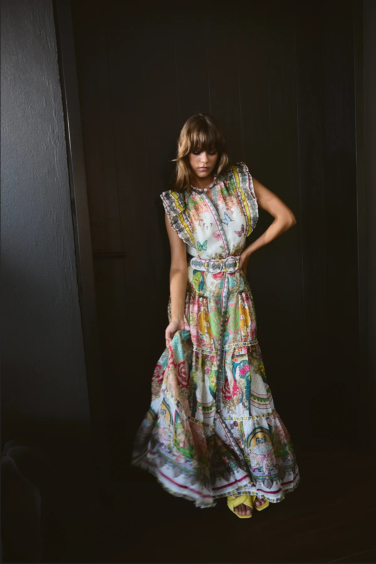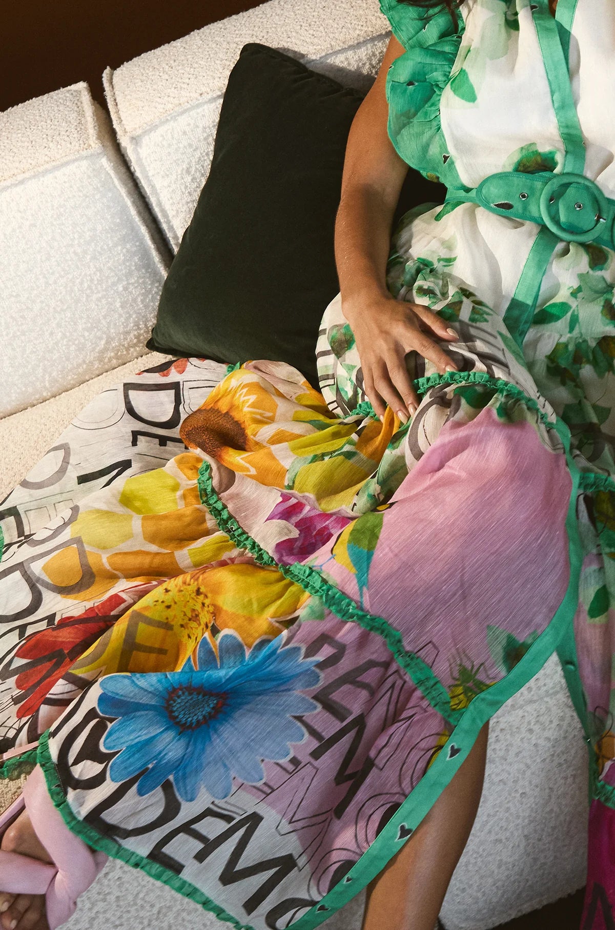 اكشفي عن سحركِ الكامن في هذا الفستان الحريري الطويل الرامي، حيث تلتقي الأناقة بخيالٍ نباتي. صُمم هذا الفستان بأكمام فراشات درامية ترفرف مع كل حركة، وهو مزين بسلسلة من طبعات الكرمة الخضراء وأزهار كبيرة الحجم ومشرقة تتفتح على طول التنورة - كل بتلة تنبض بالحياة والألوان. ترسم حواف خضراء زمردية الشكل، مما يضيف لمسة من الفخامة إلى قماش الحرير الانسيابي الذي ينساب بسلاسة. يتميز الجزء الأمامي بأزرار رقيقة وحزام أنيق قابل للتعديل، مما يسمح بمقاس شخصي يناسب كل منحنى. ويكمل شعار MODE المميز المطبوع على منطقة التنورة كعلامة على الفخامة الراقية. أنيق وجريء بلا خجل - صُمم هذا الفستان ليلفت الأنظار.