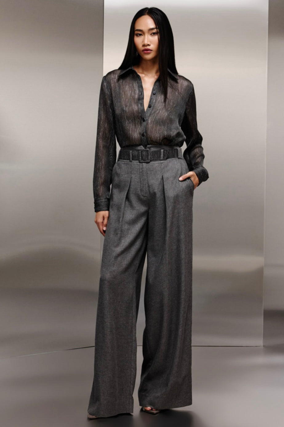 بنطال رمادي أنيق وعصري، يتميز بقصّة واسعة وحزام متناسق لإطلالة أنيقة وبسيطة. صُمم ليمنحكِ الراحة والأناقة، ويتناسق مع كل خطوة، مثالي لإطلالات العمل الأنيقة والسهرات الأنيقة.