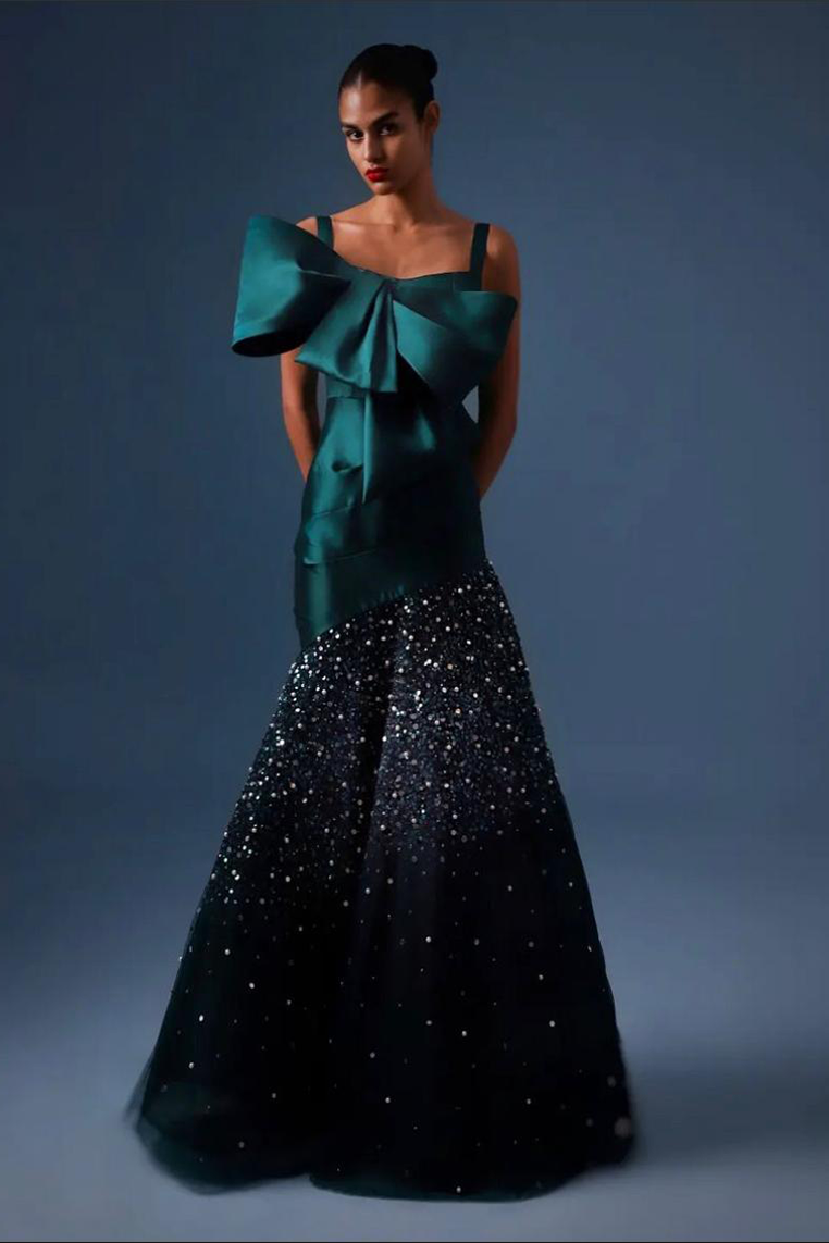 فستان أزرق مخضر بتفاصيل فيونكة وزينة من اللؤلؤ والترتر