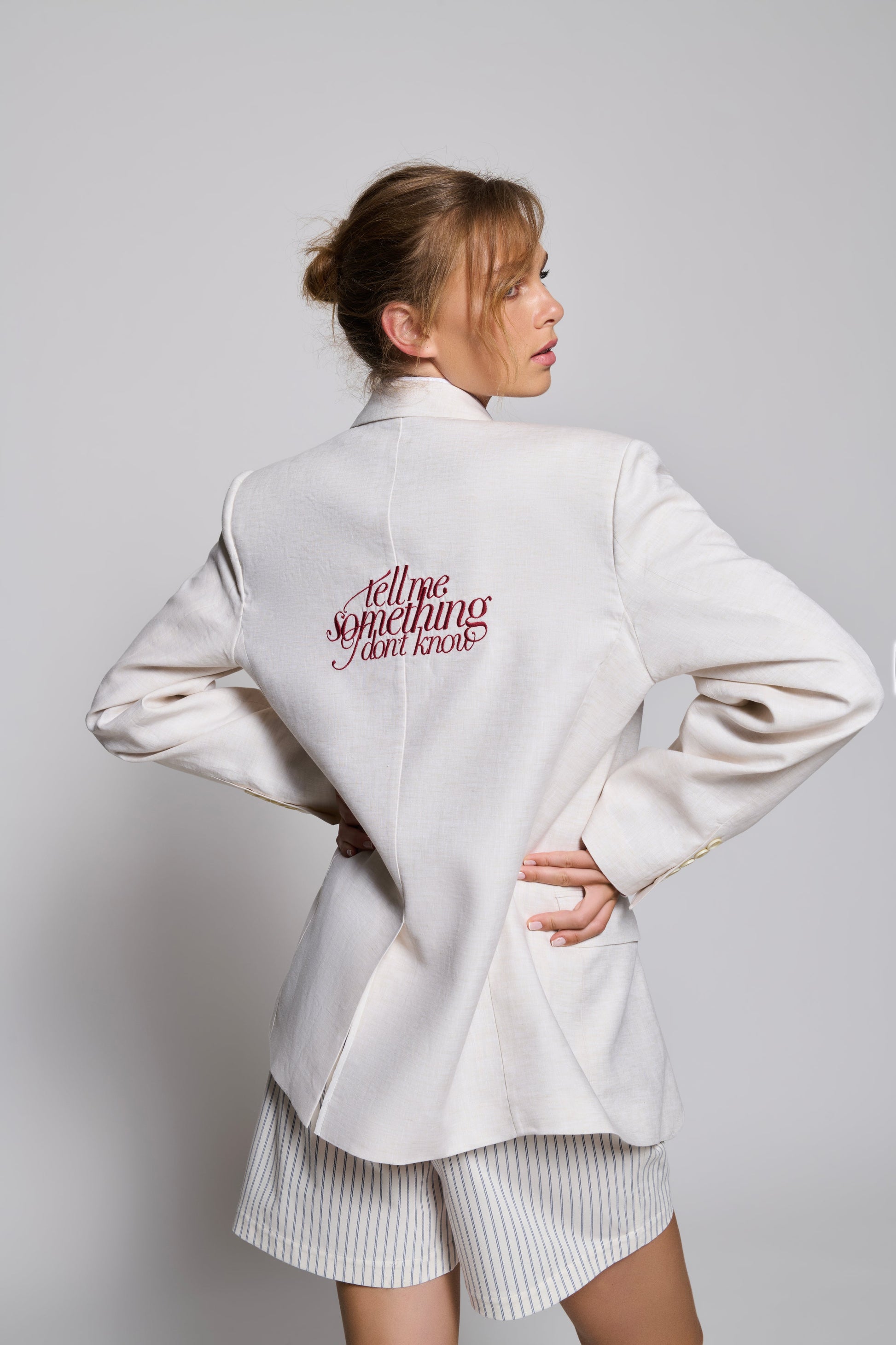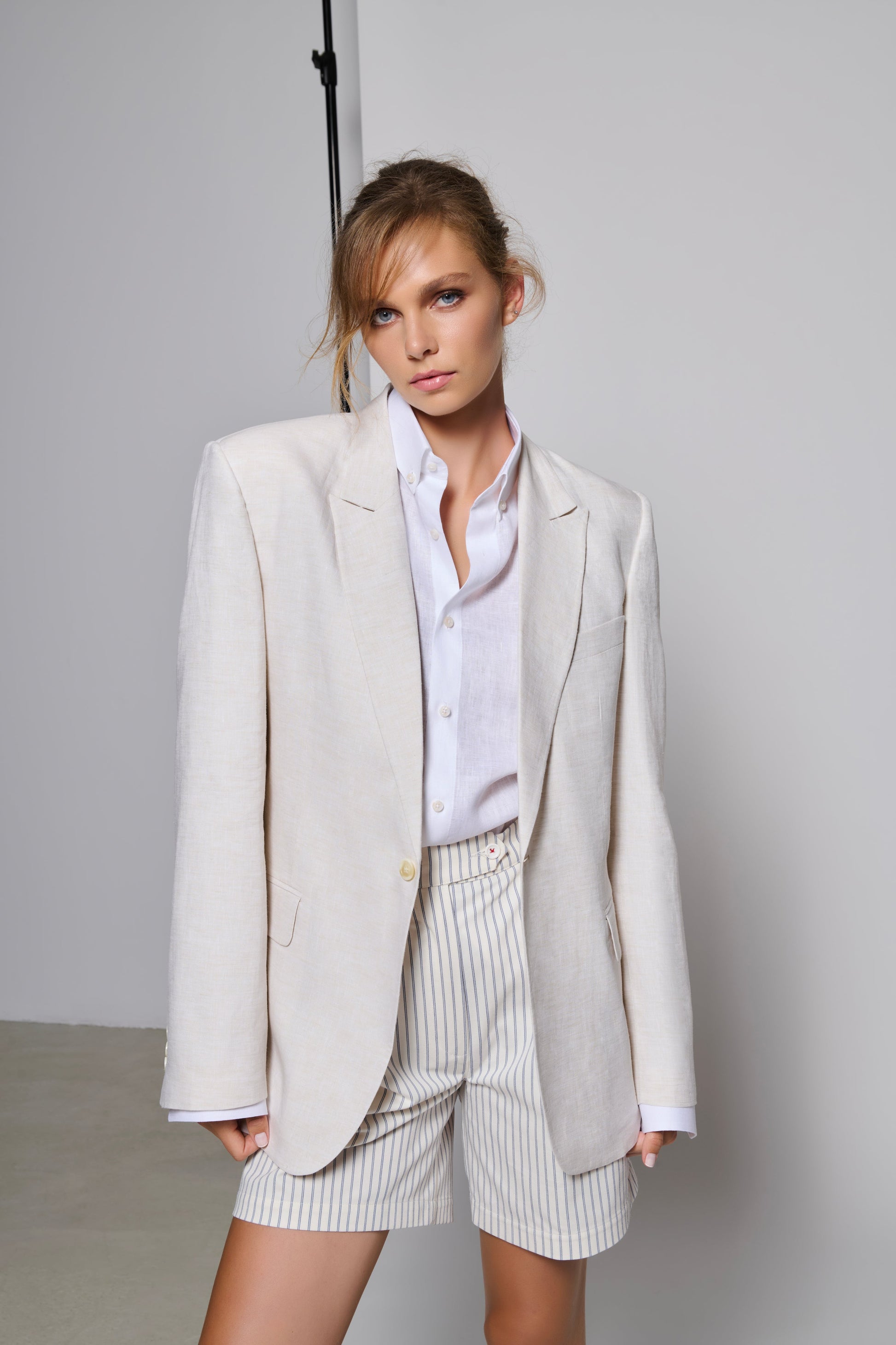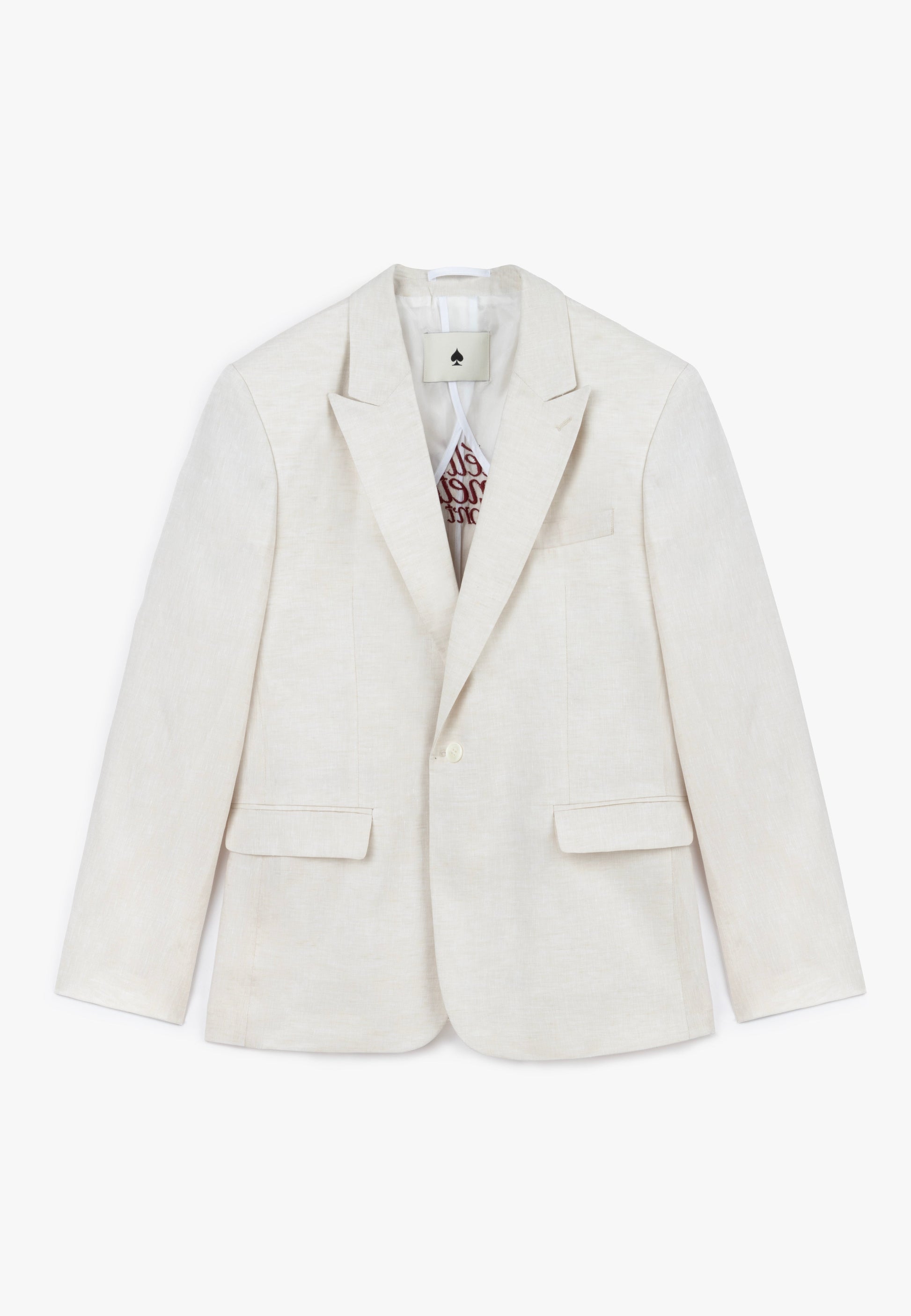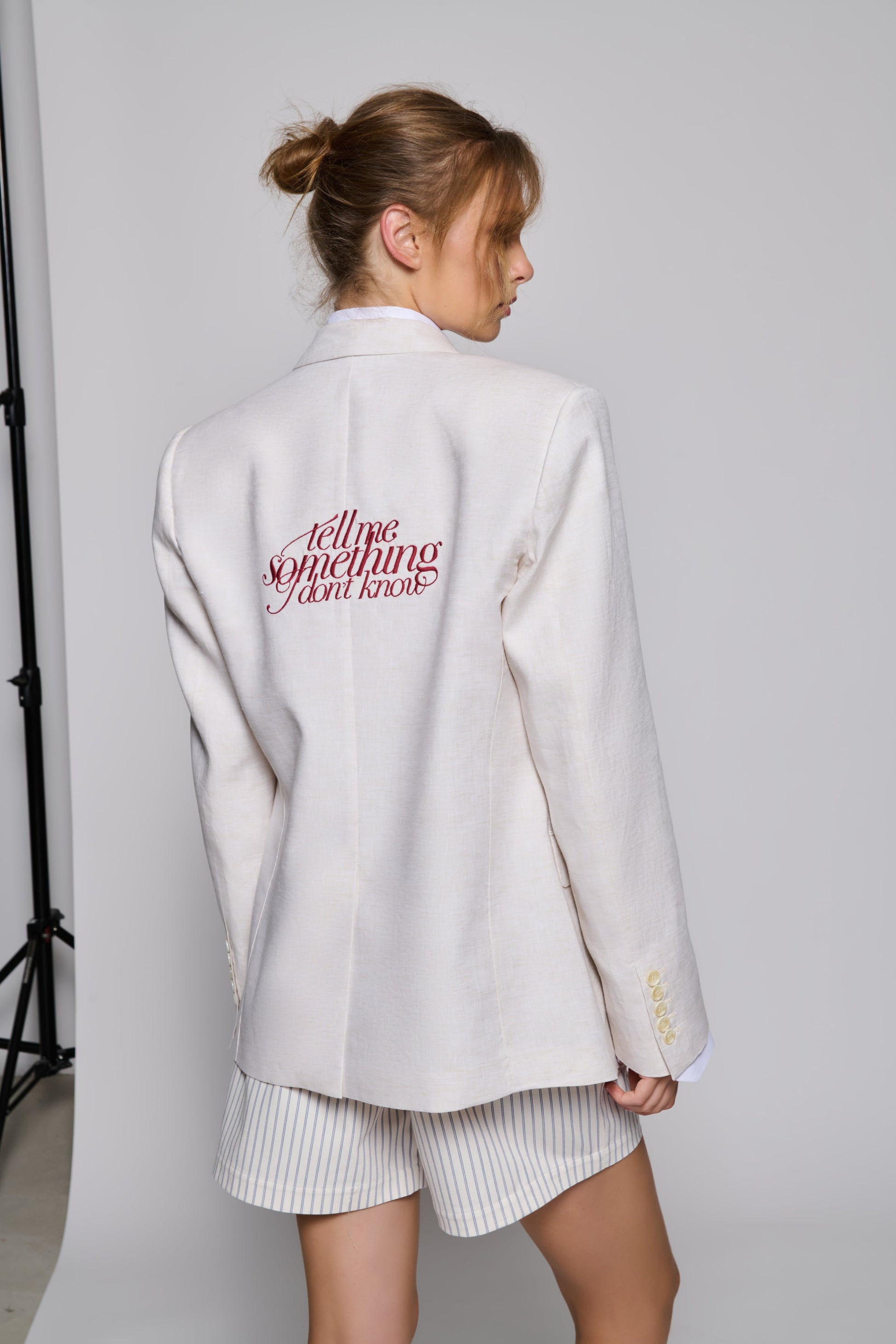 سترة لينين بيضاء كريمية اللون بمقاس كبير مصنوعة بحب على يد أفضل الخياطين.
