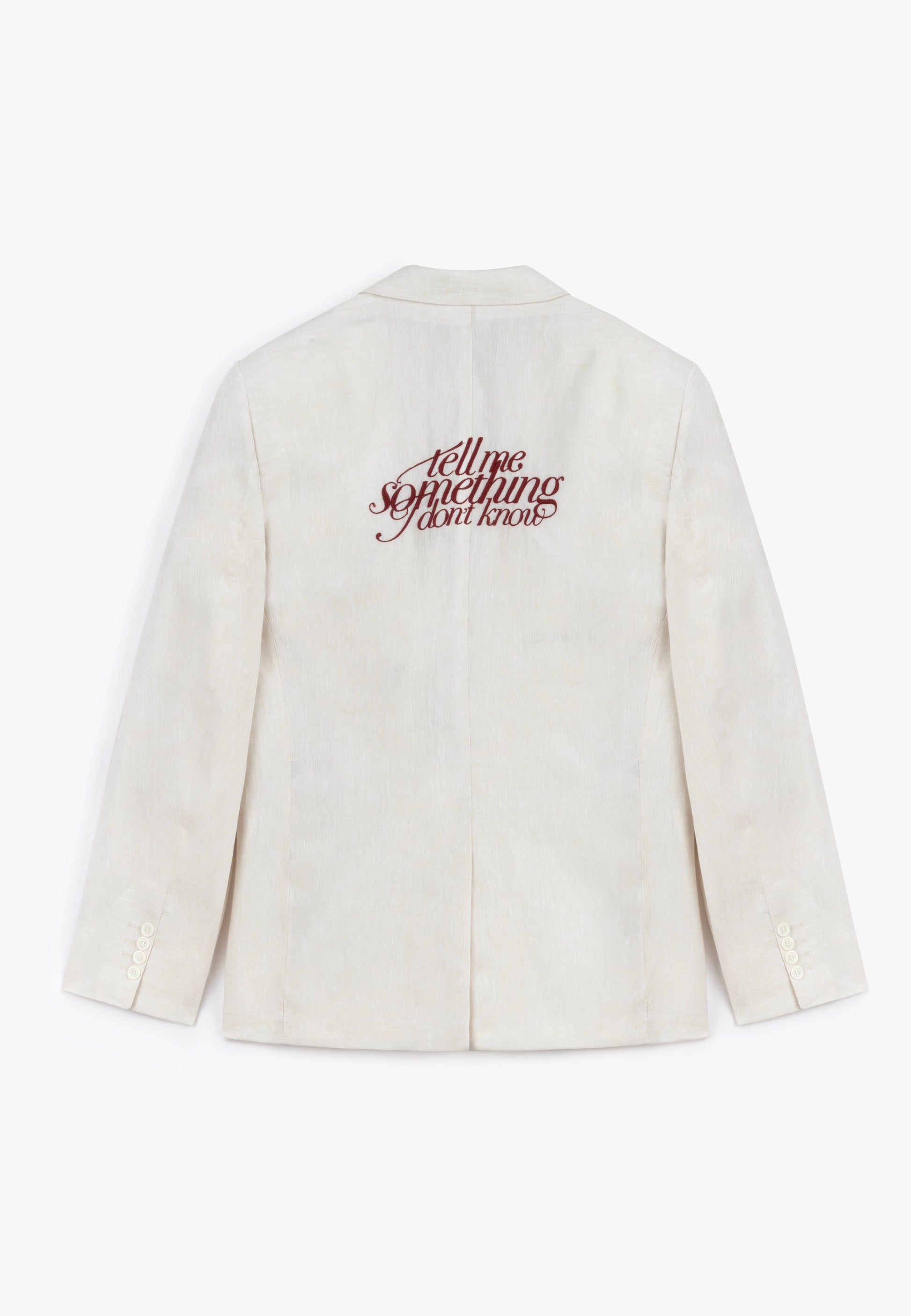 مُزخرف بتطريز "أخبرني بشيء لا أعرفه" على الجزء العلوي الخلفي من الثوب بلون بورجوندي حيوي.