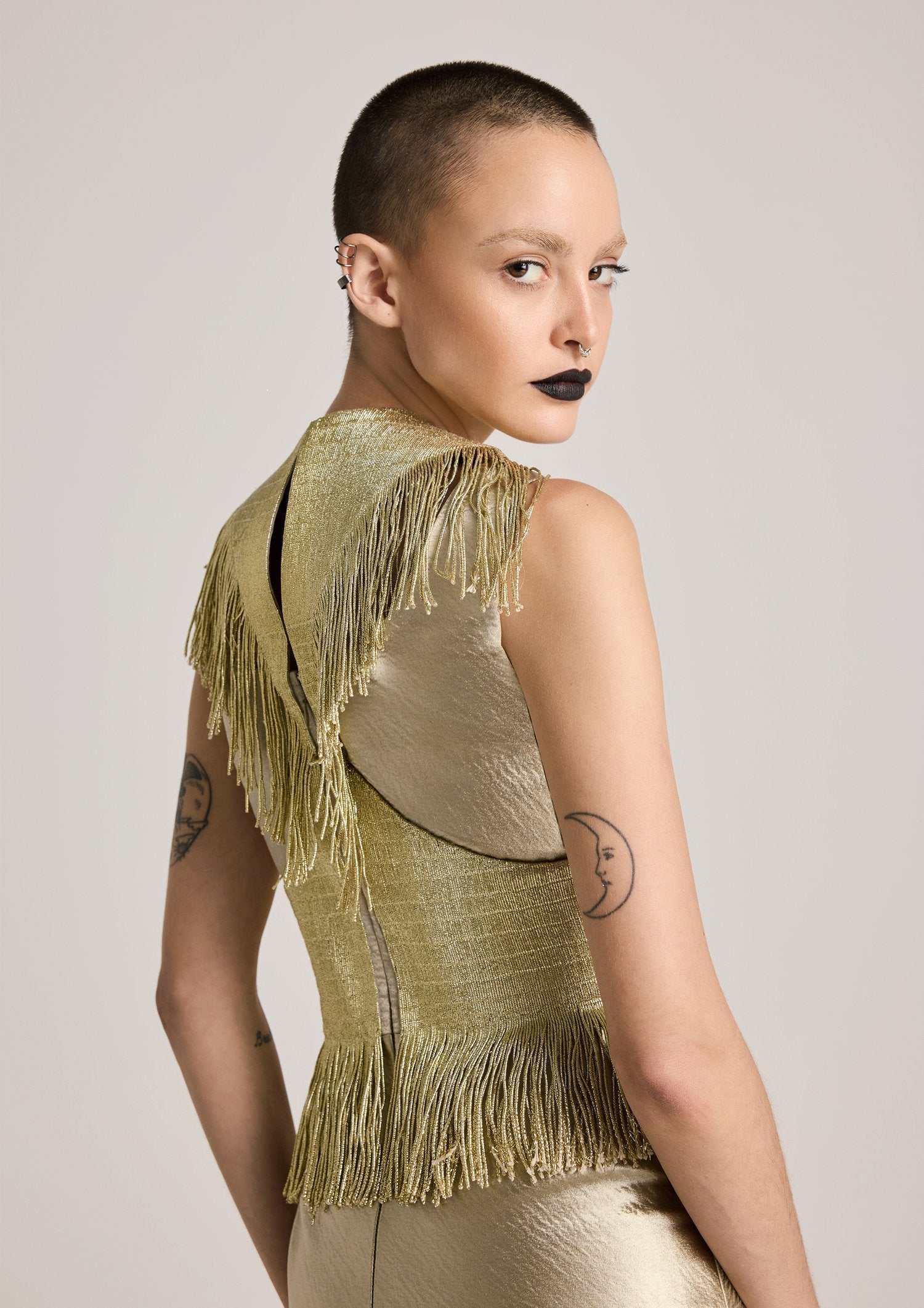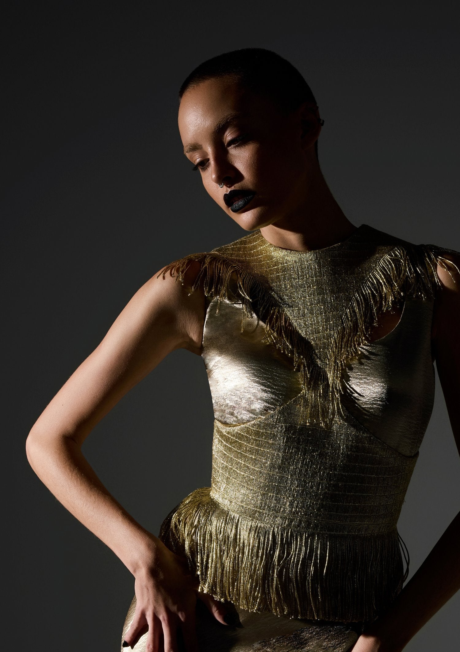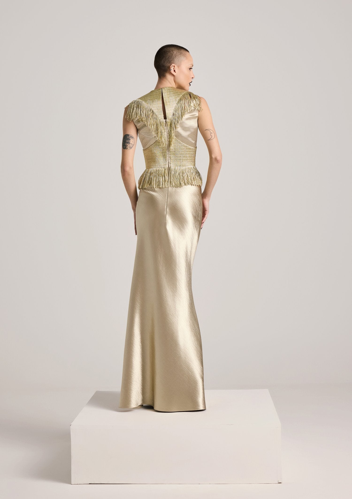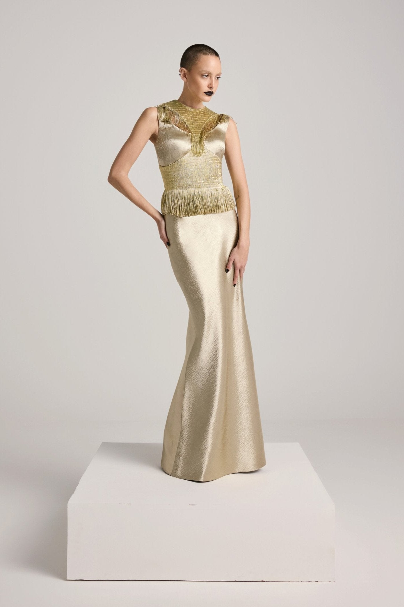 فستان من الساتان المزخرف بقصة ذيل السمكة مع حزام مشد ونير من خيوط معدنية ذهبية مطرزة يدويًا. إغلاق بسحاب في منتصف الظهر.