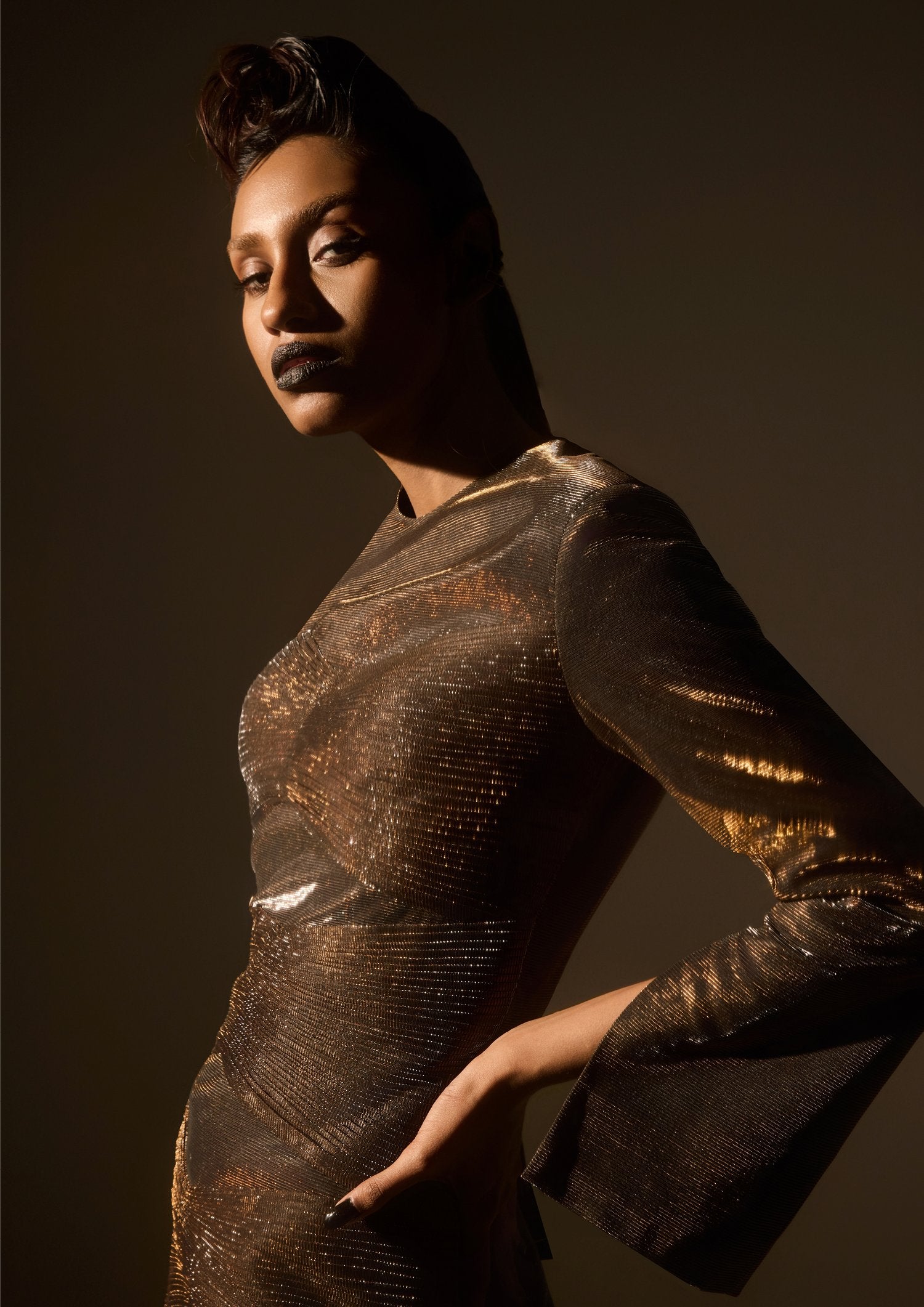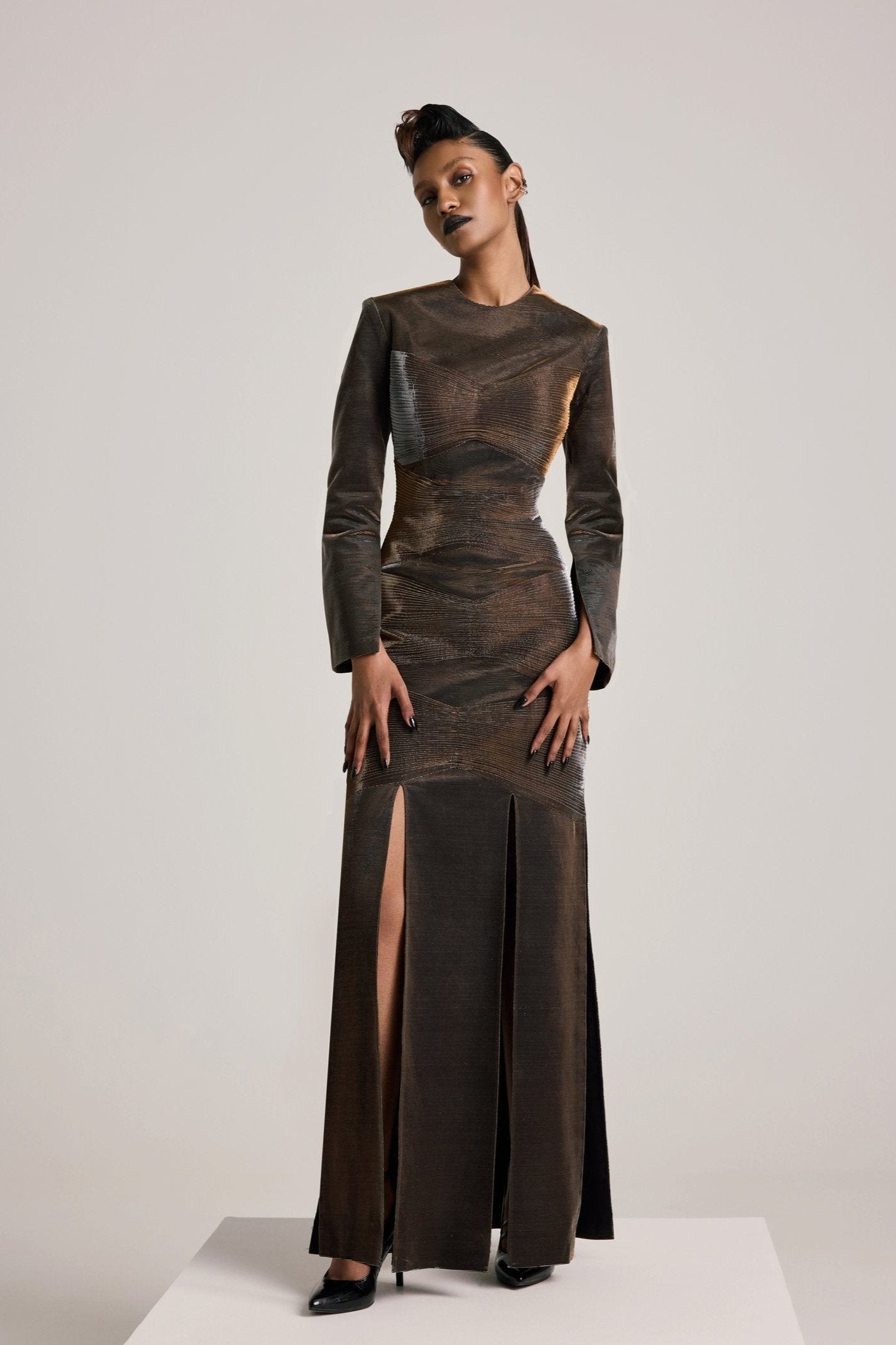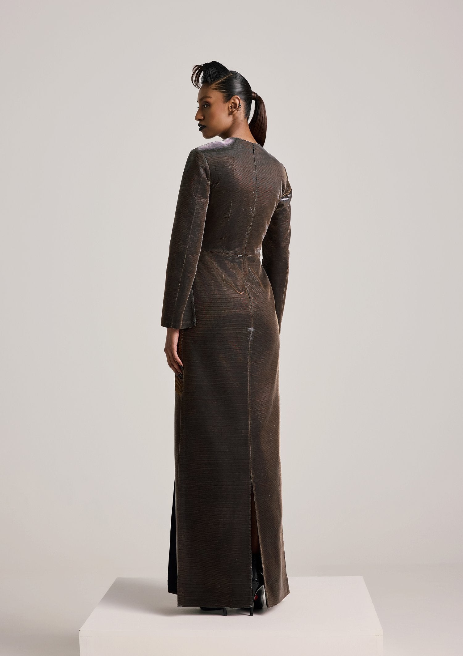 فستان من الألواح البرونزية ذات الطيات الدقيقة