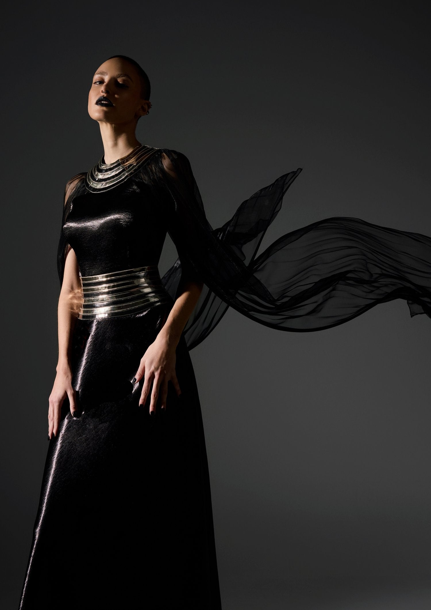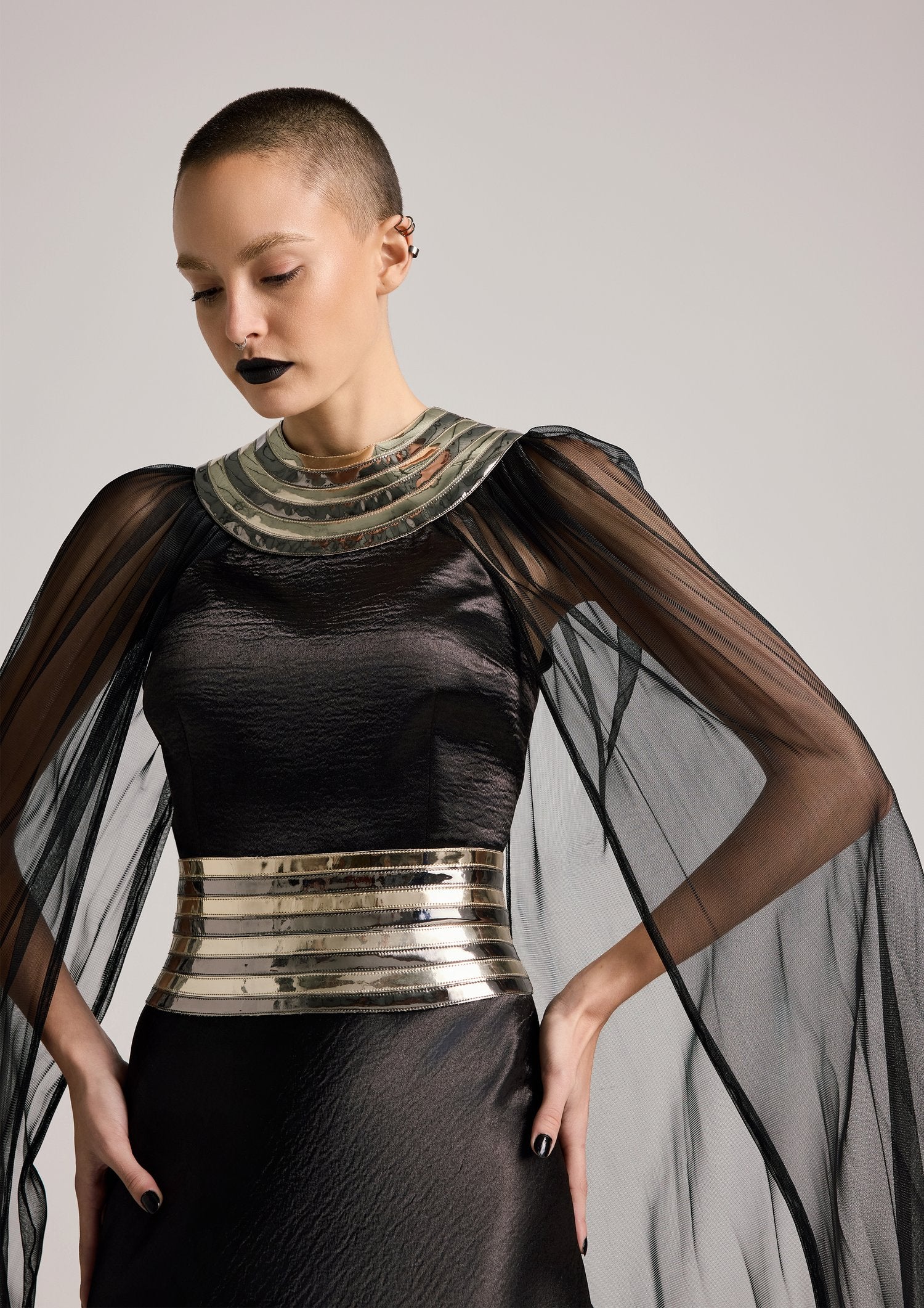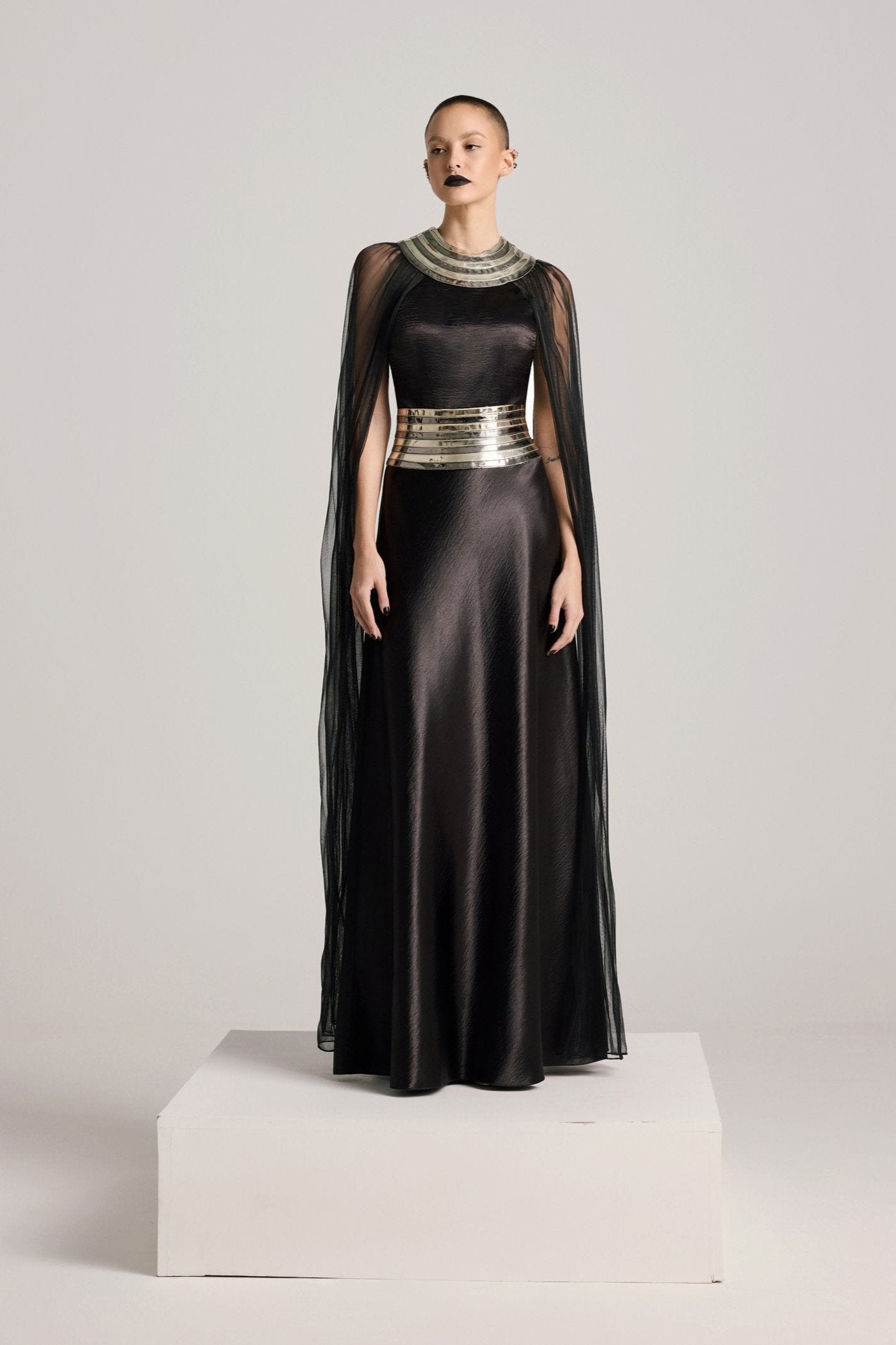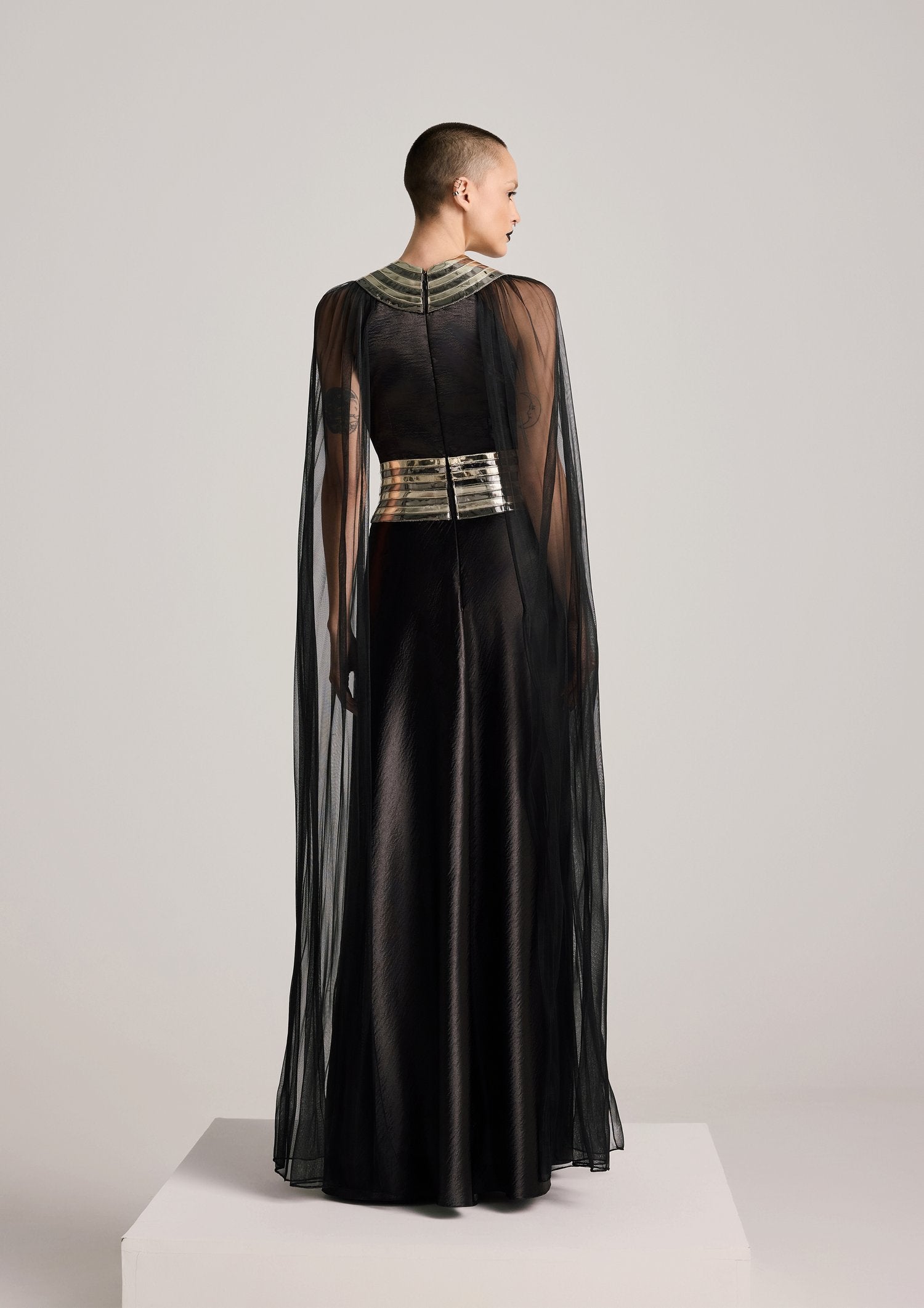 فستان من الساتان المزخرف مع أجزاء من قماش التول اللامع وحزام خصر وقبة من المعدن الذهبي والفضي مطرز يدويًا. إغلاق بسحاب في منتصف الظهر.