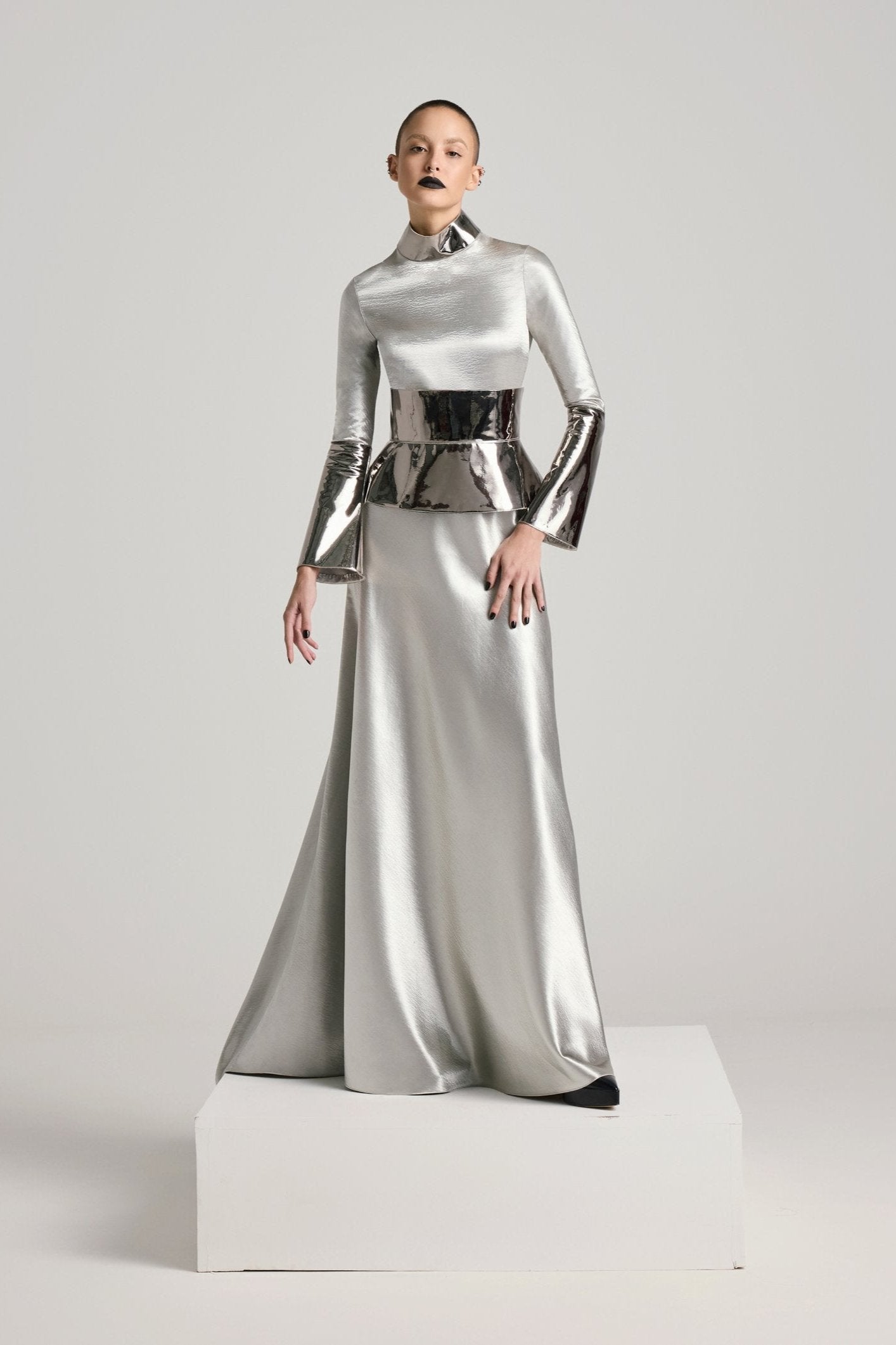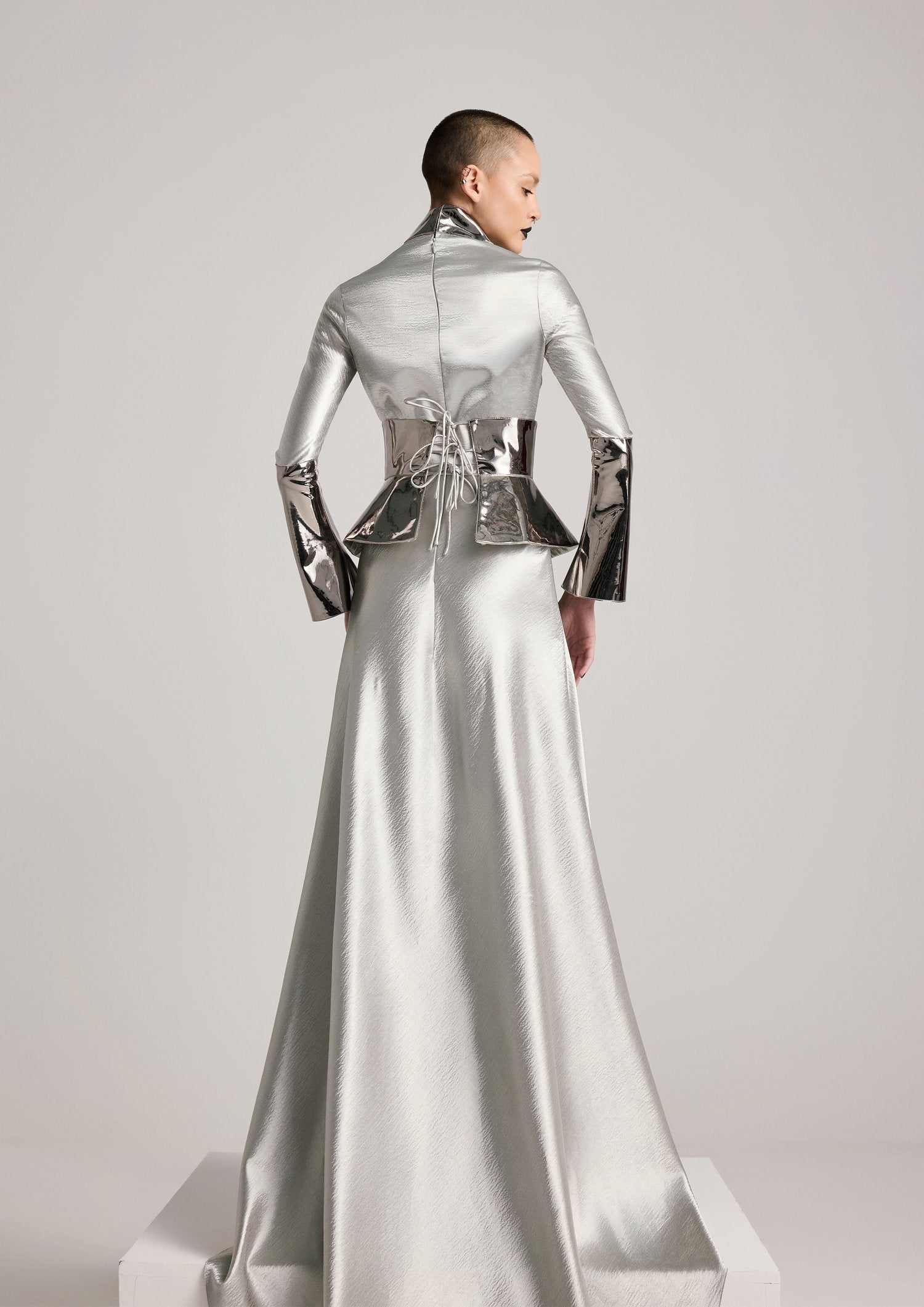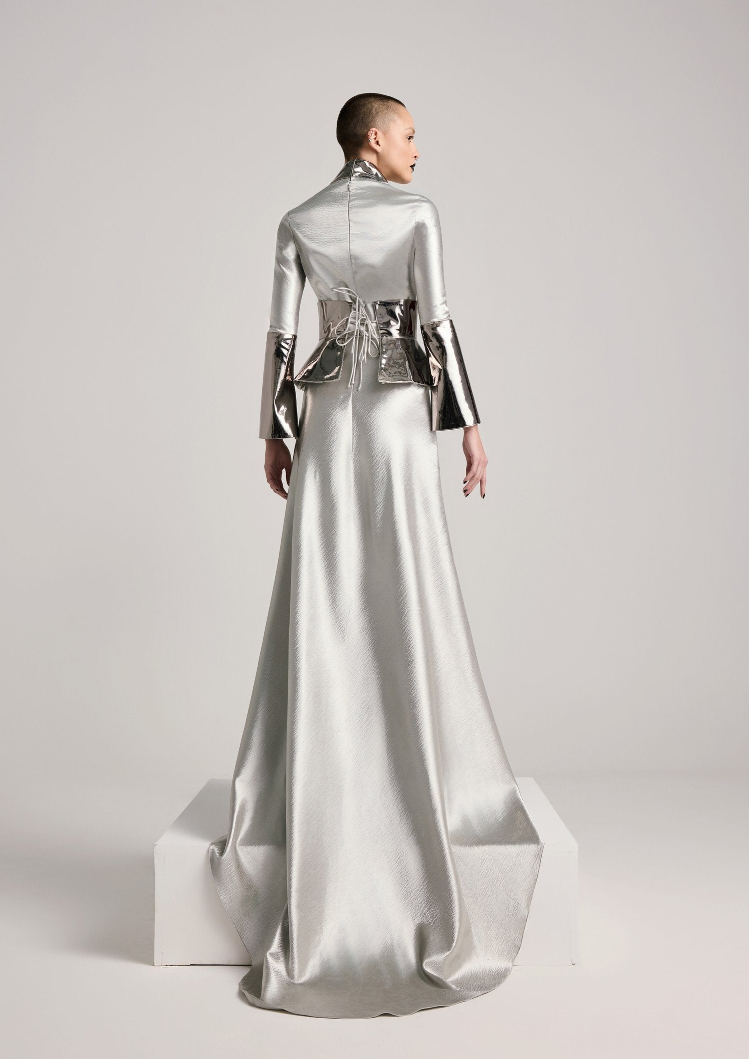 فستان من الساتان المزخرف مع تفاصيل معدنية فضية على الرقبة والأكمام. سحاب للإغلاق في منتصف الظهر. يقترن بحزام كورسيه معدني فضي مع أربطة في الخلف.