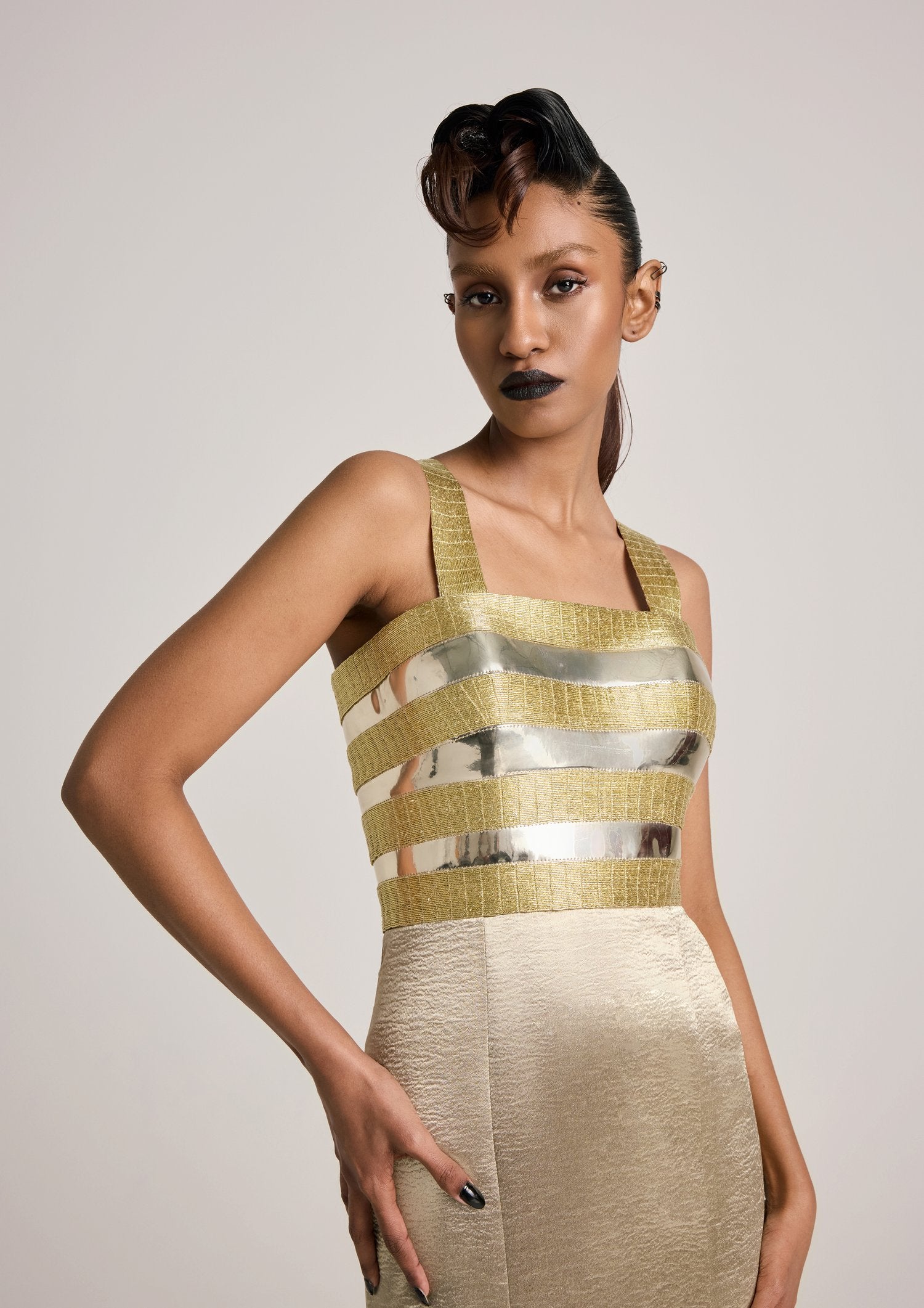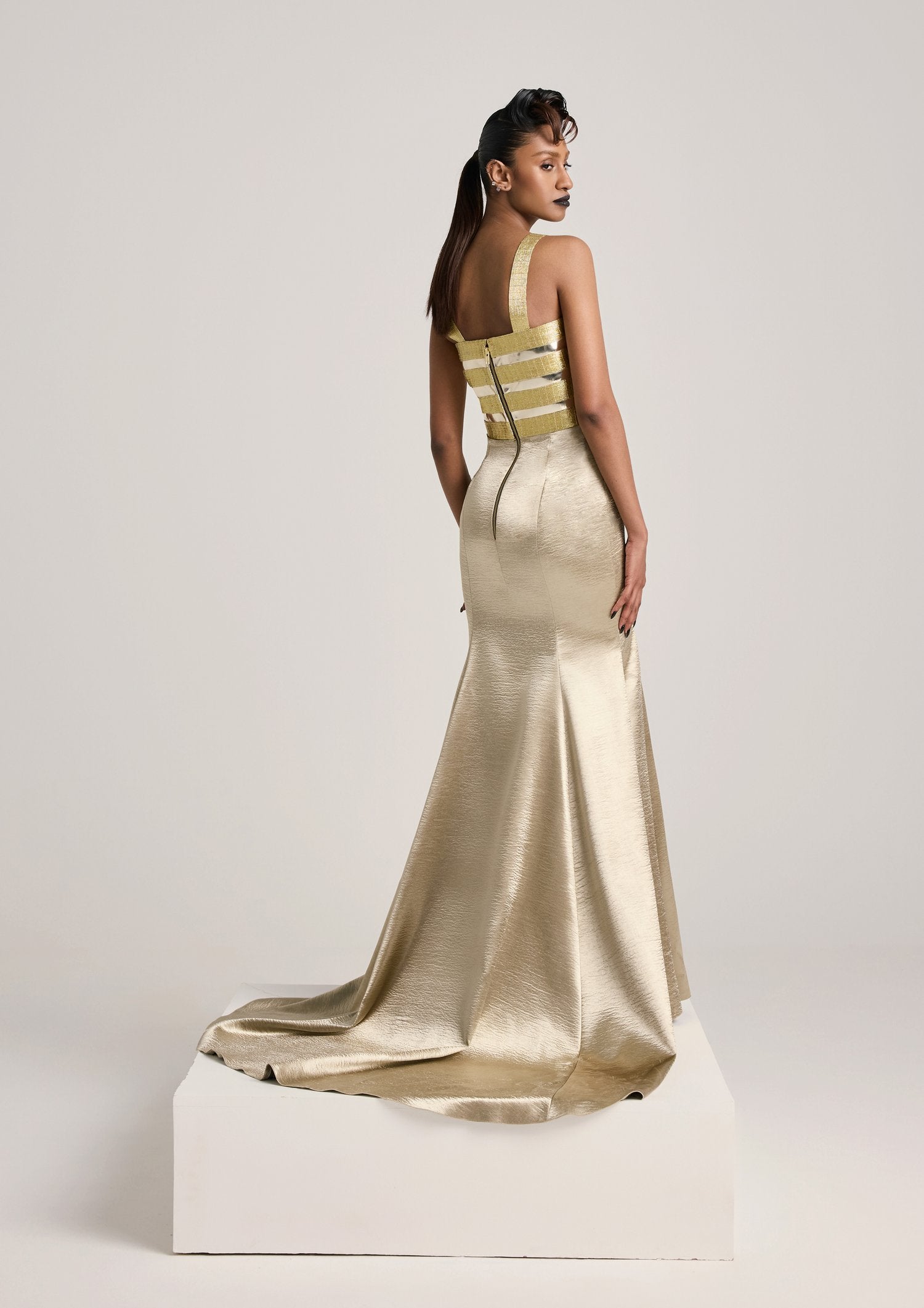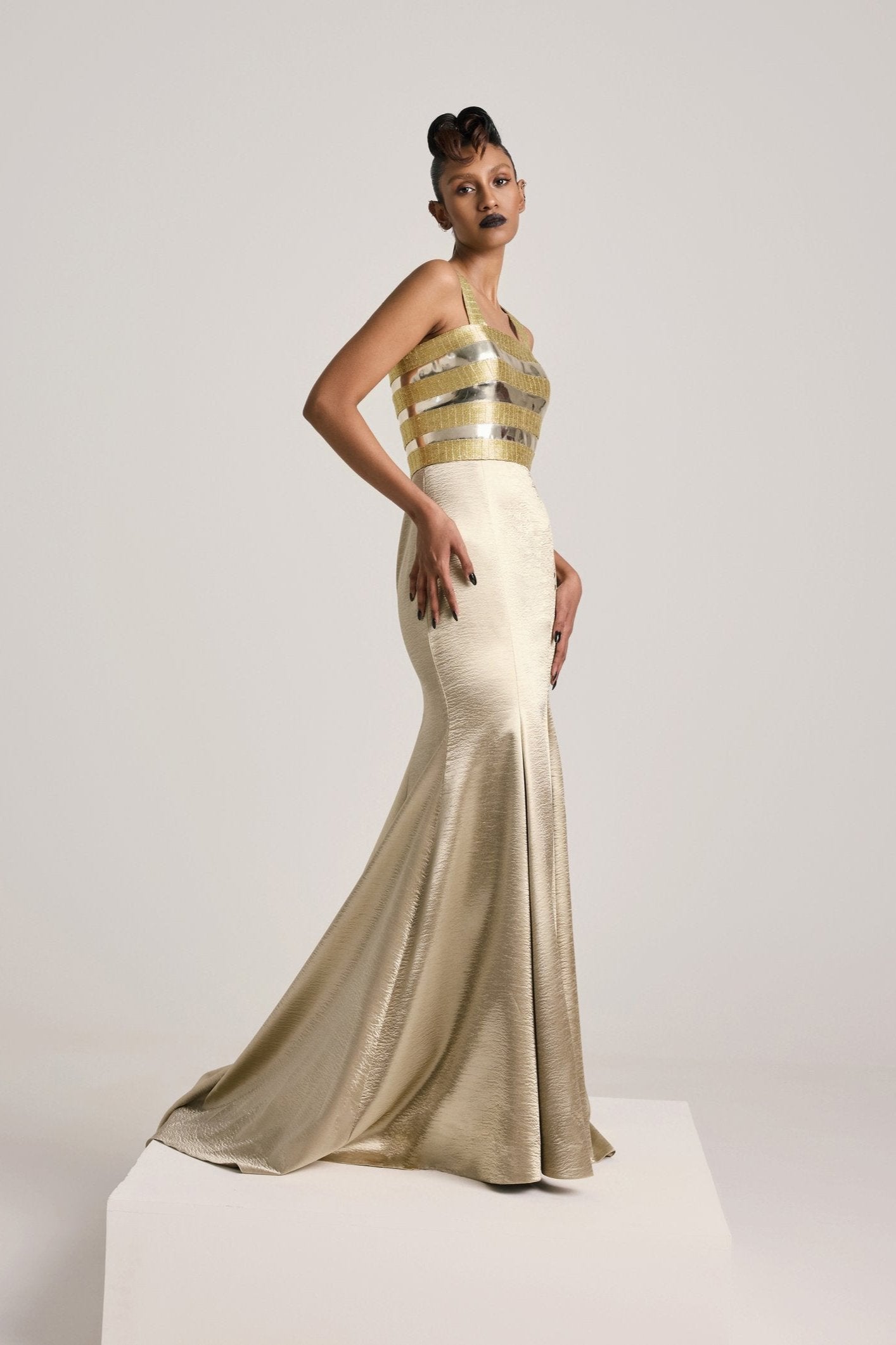 صدرية مصنوعة يدويًا من خيوط ذهبية معدنية مطرزة وشرائط معدنية عاكسة. تنورة من الساتان المزخرف باللون الذهبي مع ذيل. إغلاق بسحاب في منتصف الظهر.