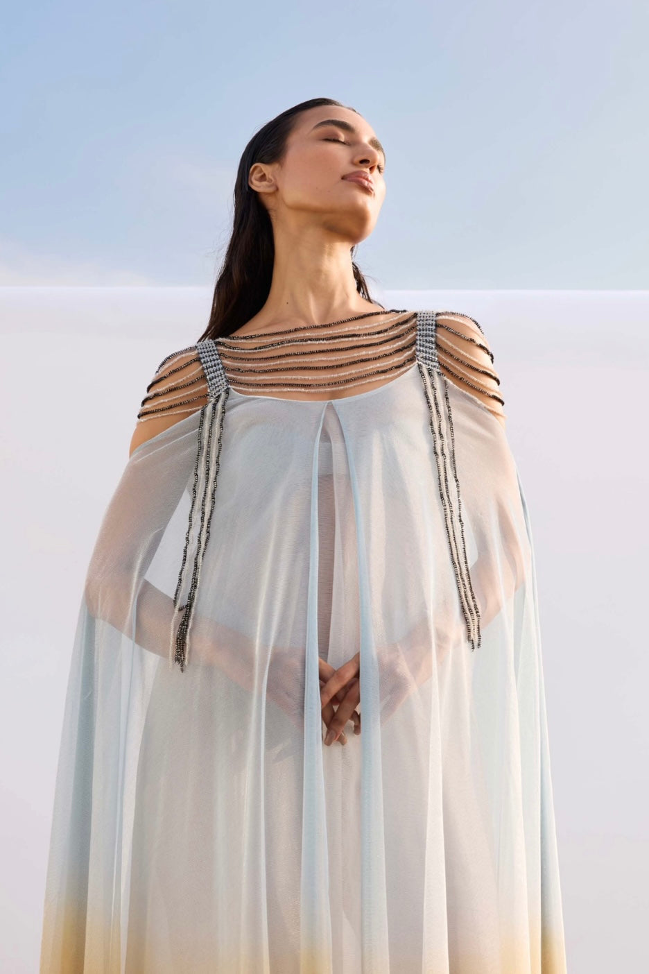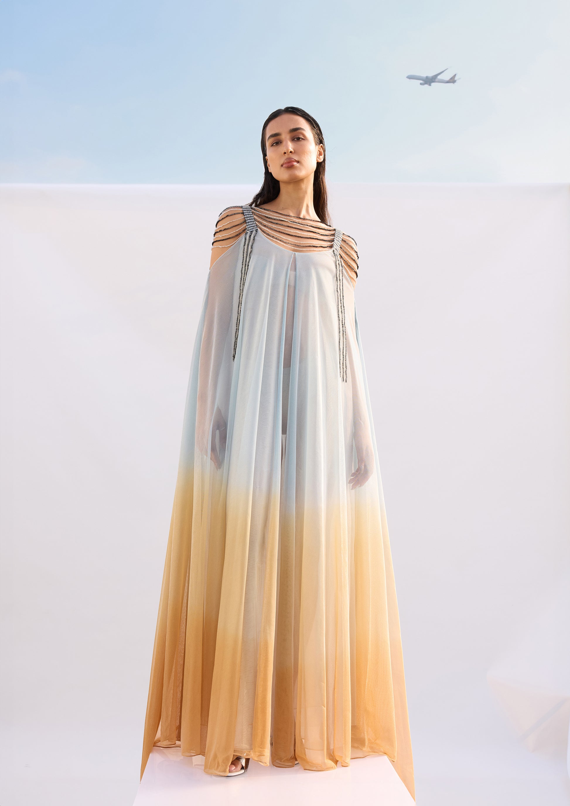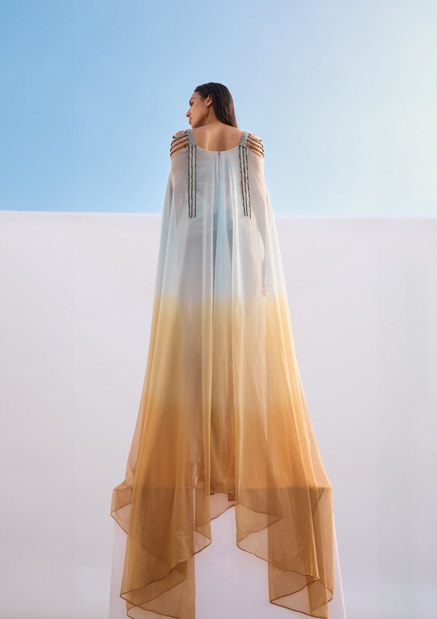 فستان متعدد الطبقات من قماش التول المصبوغ يدويًا مع حمالات مطرزة يدويًا بالترتر وحواف. يمكن تنسيقه مع فستان داخلي مكمل. إغلاق بسحاب في منتصف الظهر.