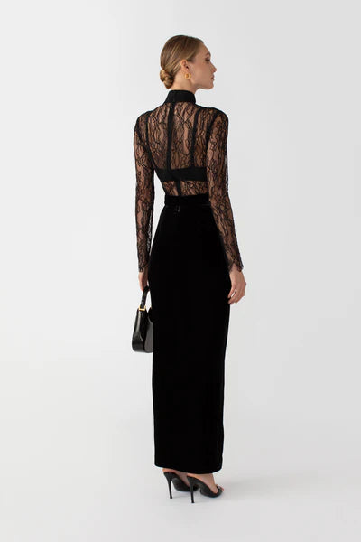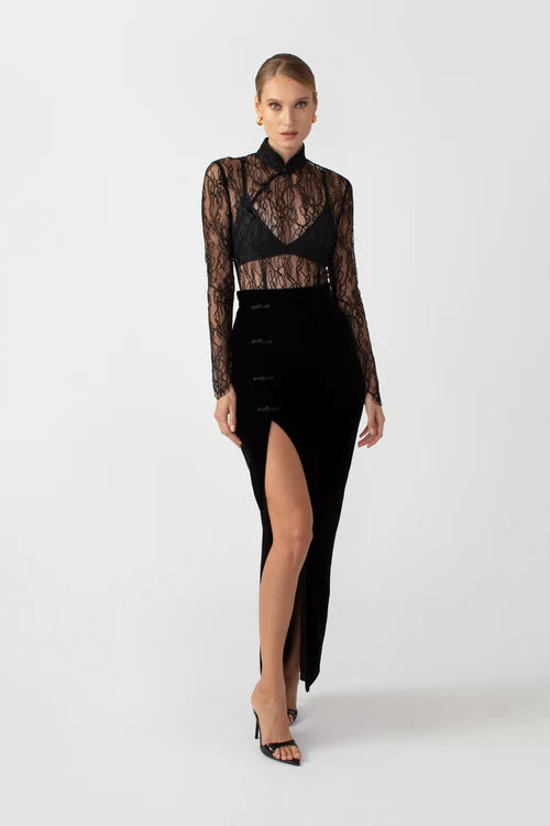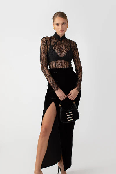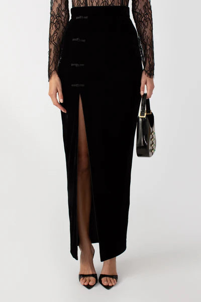 تنورة ماكسي فيجا أنيقة ومثيرة مصنوعة من المخمل الناعم. تتميز بفتحة تصل إلى الفخذ مع أزرار بانكو كلاسيكية مزخرفة.