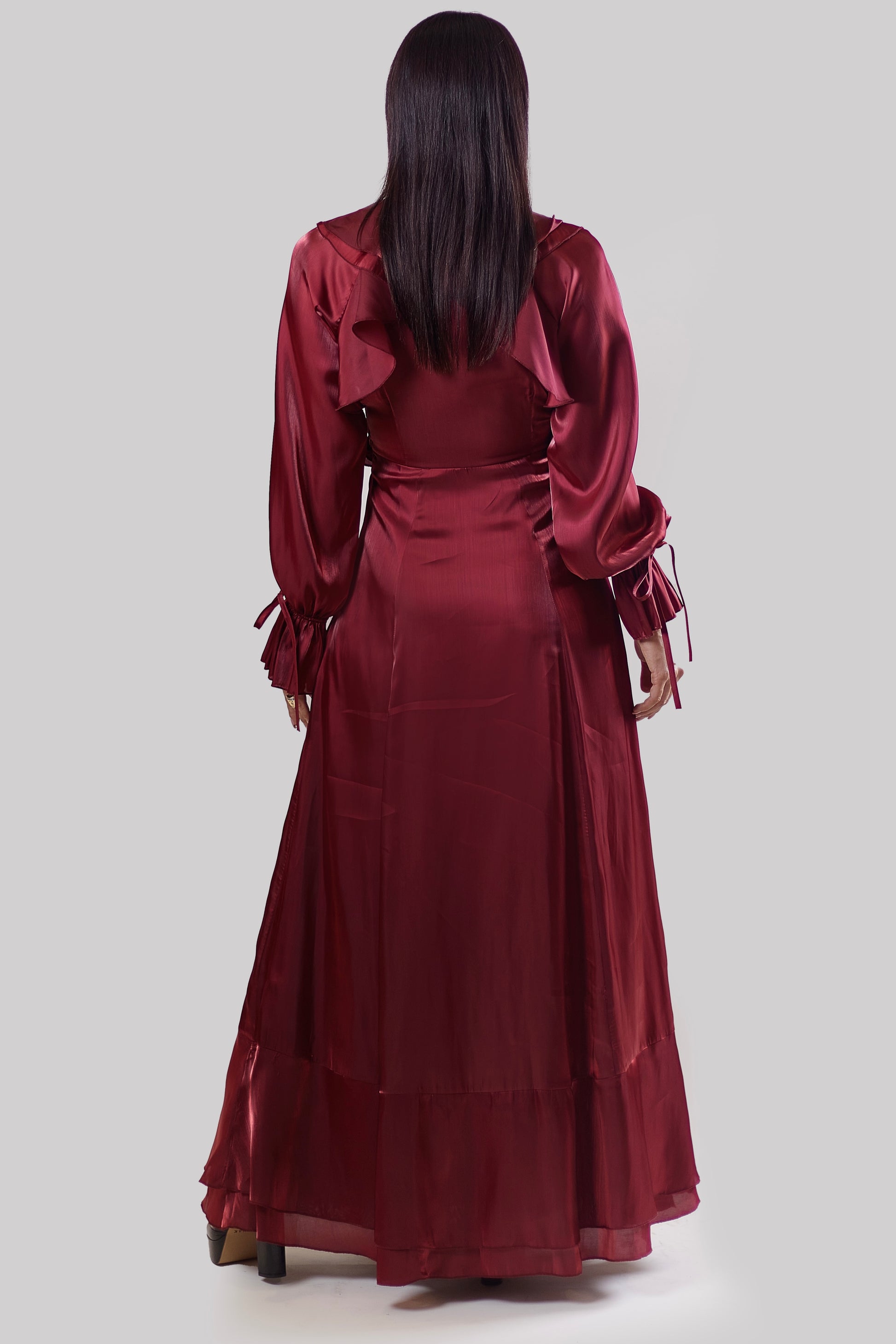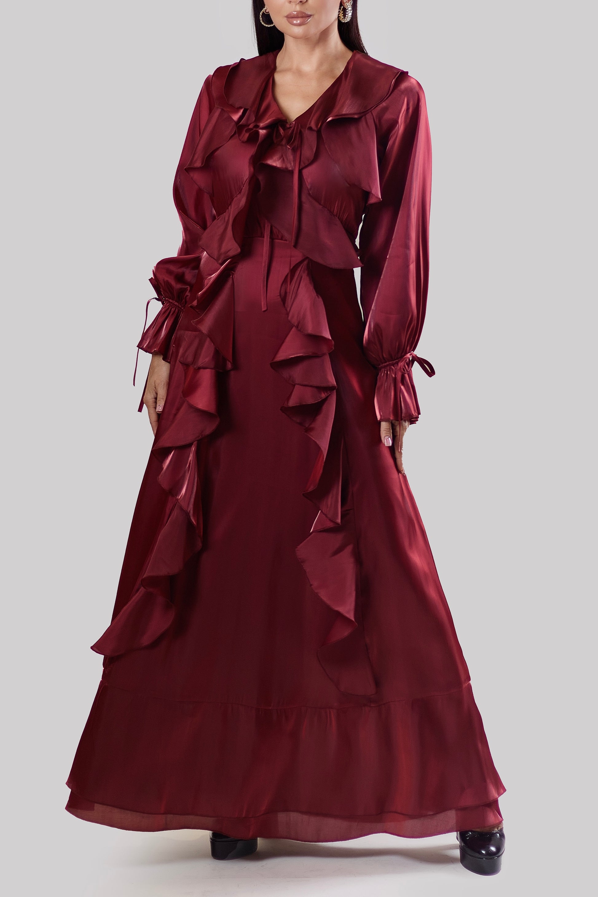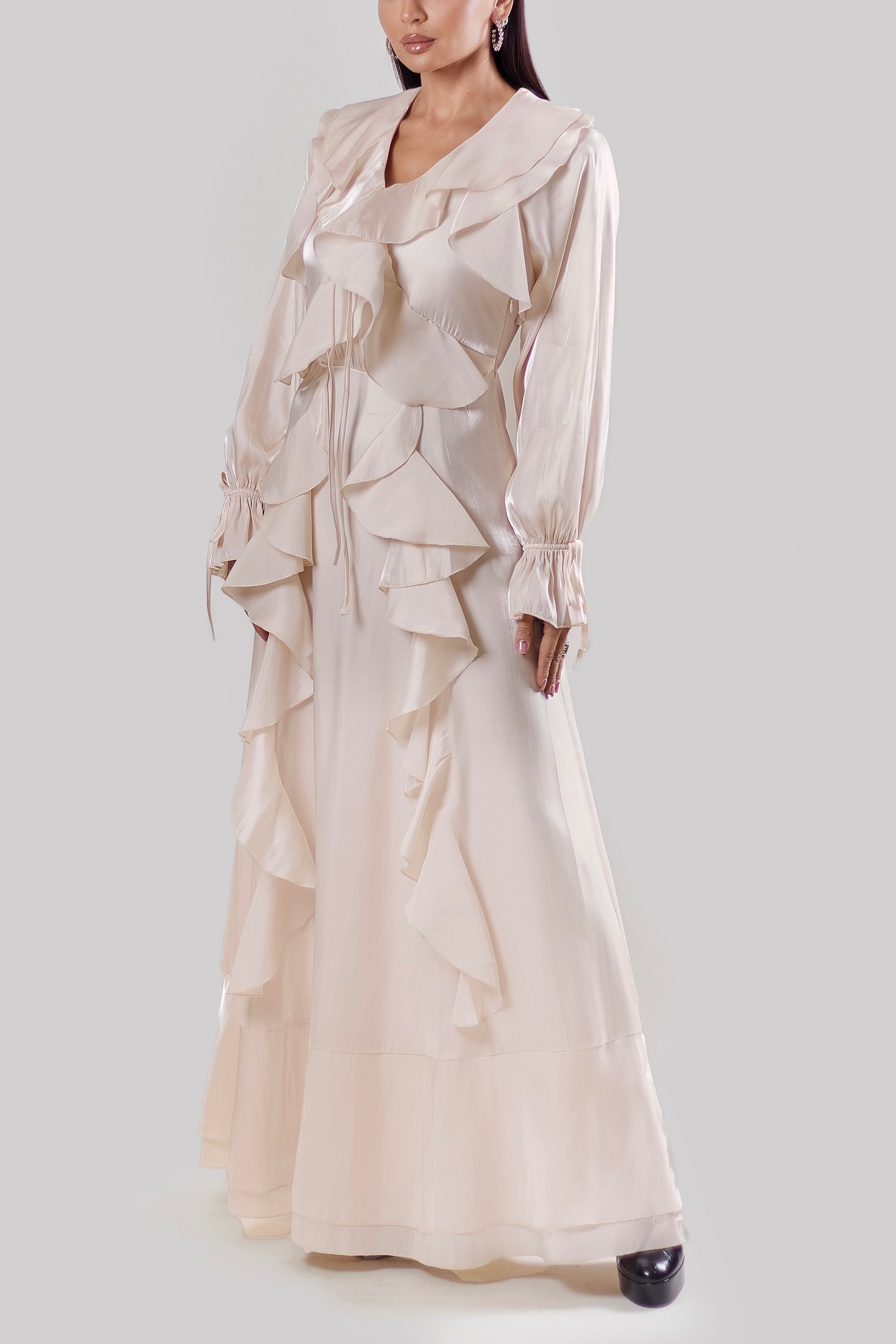 A flowing satin dress designed with cascading ruffles and a tie-neck detail that exudes timeless femininity. The cinched sleeves add a touch of romance, making it perfect for elegant evenings or refined daytime occasions.