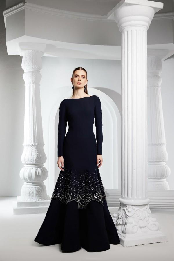 This stunning gown features a classic navy color with a fitted bodice and long sleeves. The mermaid silhouette flares out dramatically at the bottom, adorned with shimmering embellishments that create a beautiful contrast. It's an ideal choice for formal occasions, exuding sophistication and glamour.
