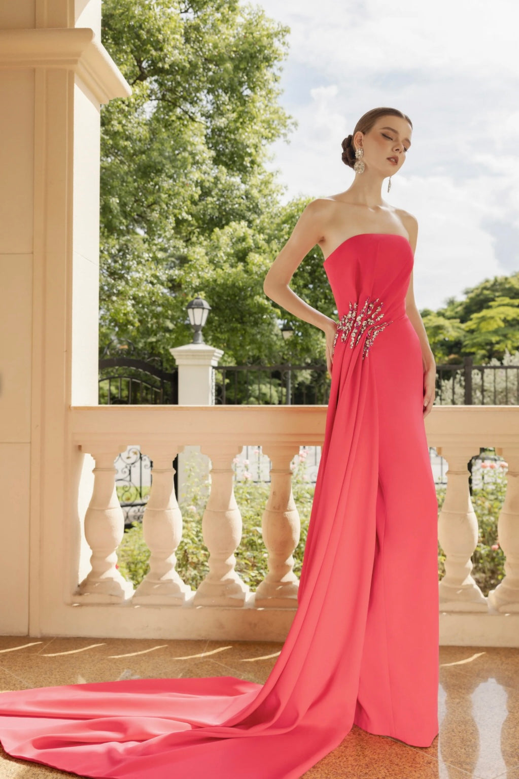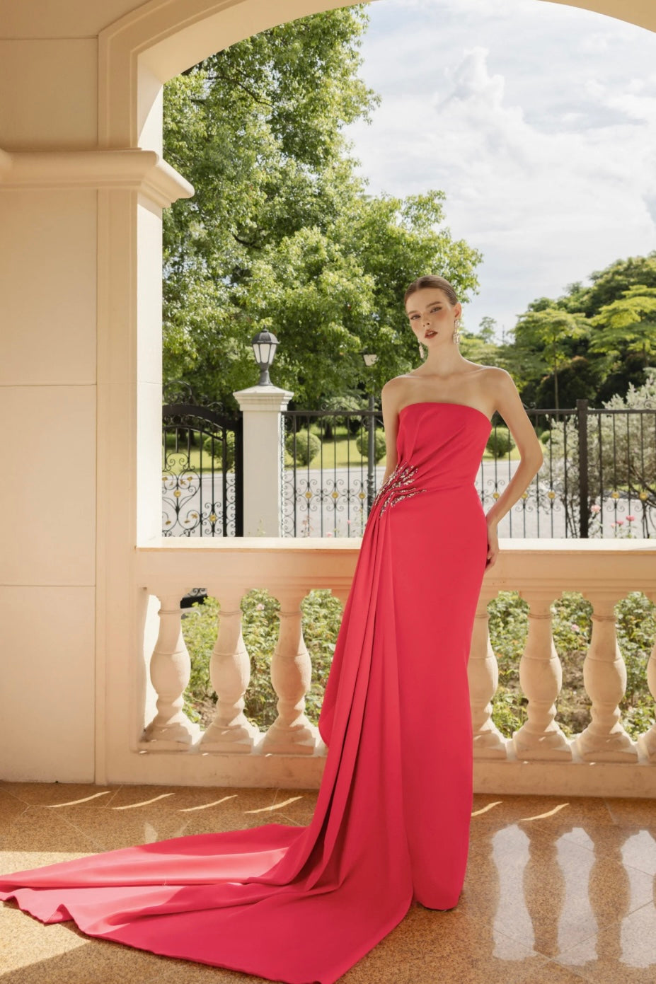 مصنوع من الكريب الفاخر، ينساب الفستان بسلاسة، مجسدًا الحداثة والأناقة الخالدة. يمتد شريط متدلي درامي من خط الصدر، مُجمّع بأناقة عند الخصر قبل أن يتدفق إلى الأرض، ليُشكّل تصميمًا انسيابيًا خلابًا. تُضفي هذه التفاصيل النحتية إحساسًا بالفخامة والحركة. الجوانب المُجمّعة عند الورك مُزينة بزخارف كريستالية متناسقة، بأحجار كبيرة الحجم تلتقط الضوء وتعكسه، مما يُعزز جاذبية الفستان المُشرقة. إنه تعبير عن الأناقة الراقية والعفوية.