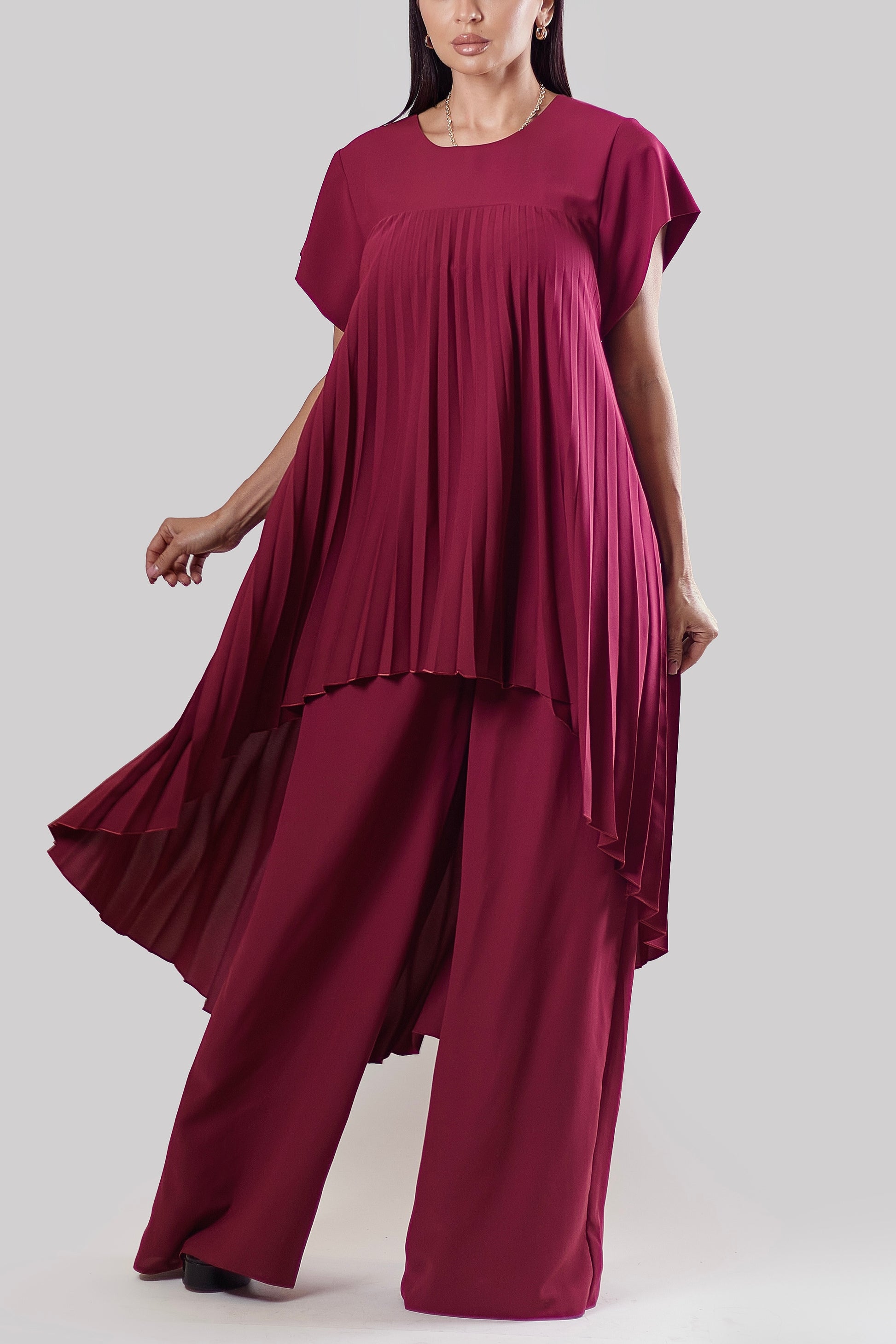 Radiating effortless elegance, this pleated two-piece set features a flowing asymmetrical tunic paired with wide-leg trousers in a rich wine hue. The soft pleats create graceful movement with every step, while the relaxed silhouette offers both comfort and sophistication — perfect for refined evenings or chic daytime occasions.