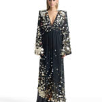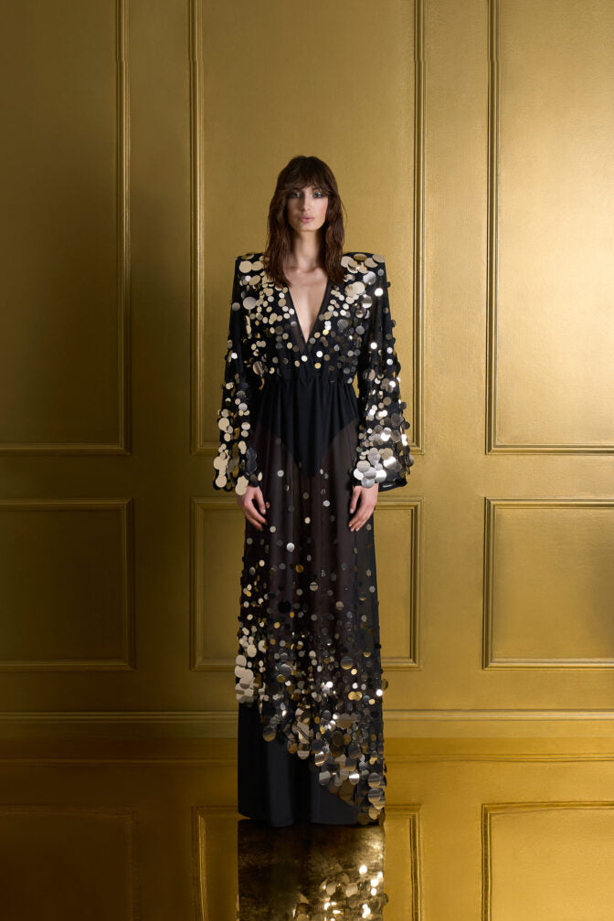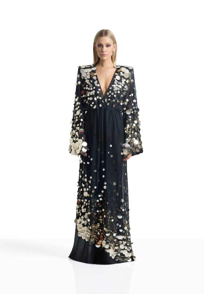 فستان طويل كامل، مبطن جزئياً، مصنوع من قماش شبكي مزين بالترتر، بأكمام واسعة، وخصر مطاطي، وتفاصيل مميزة على الكتفين.