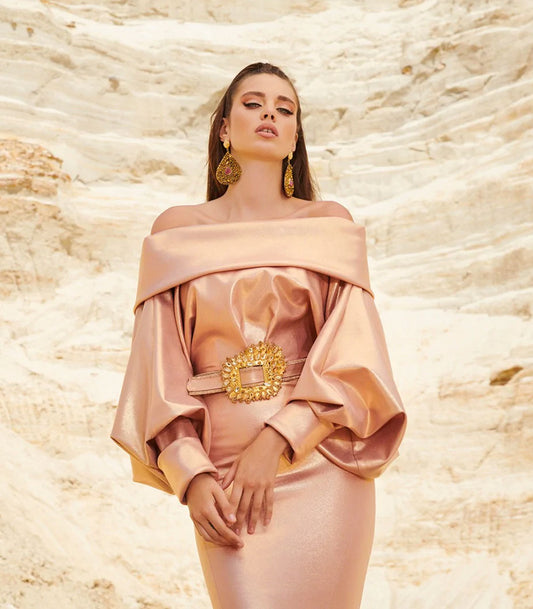 OLD ROSE EXAGGERATED DRAPED SLEEVE JUMPSUIT WITH ENCRUSTED BELT