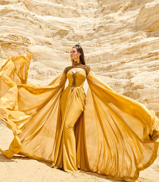 EMBELLISHED GRECIAN NECK CUT GOWN WITH TWO TAILS